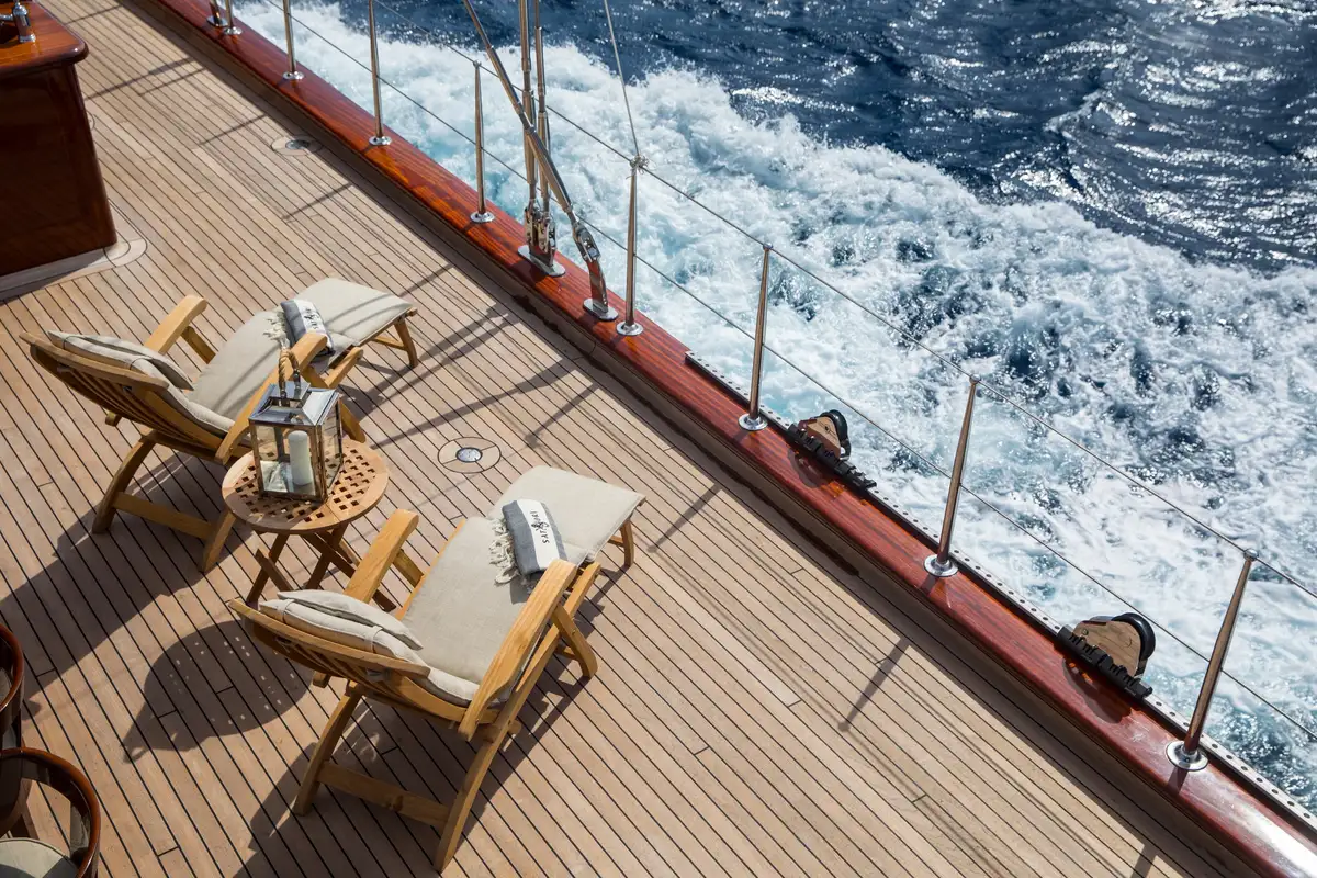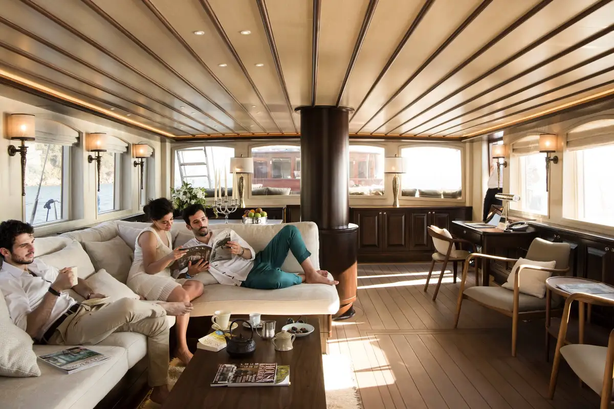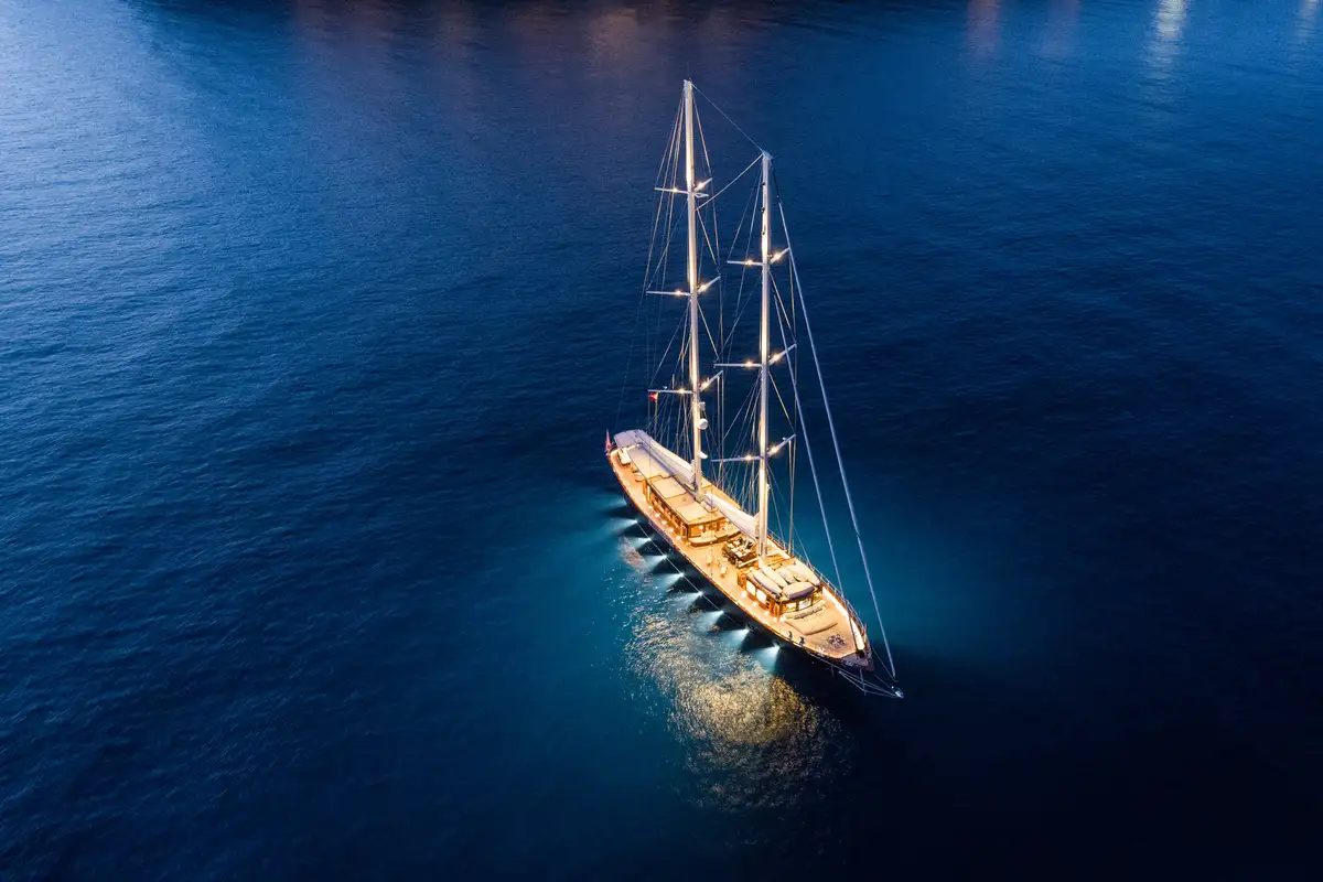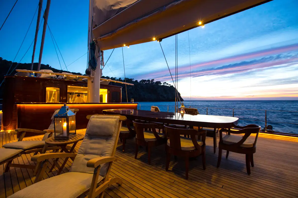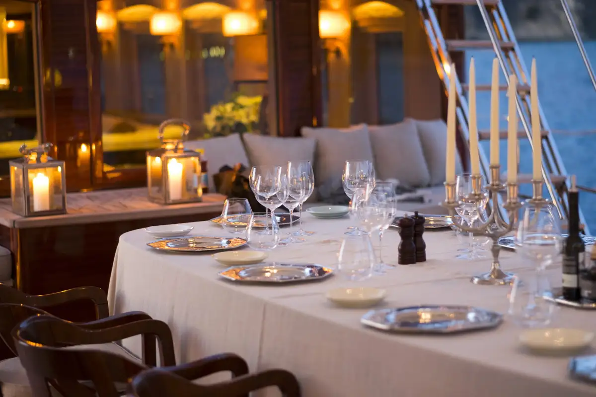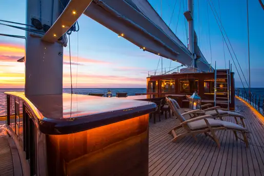 After a magical sundowner, enjoy a beautiful al fresco dinner by candlelight with a tasting menu and wine pairings from the 250-bottle wine cellar. Finally, everyone rounds off the evening with an outdoor movie experience on the foredeck, under the night sky’s awe-inspiring display of stars.
