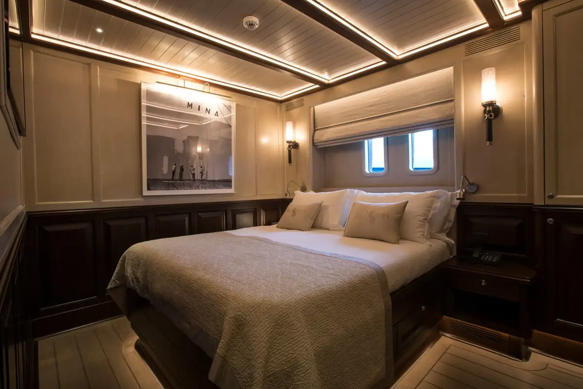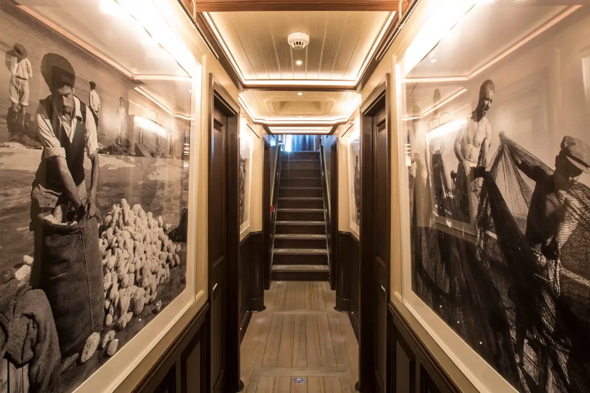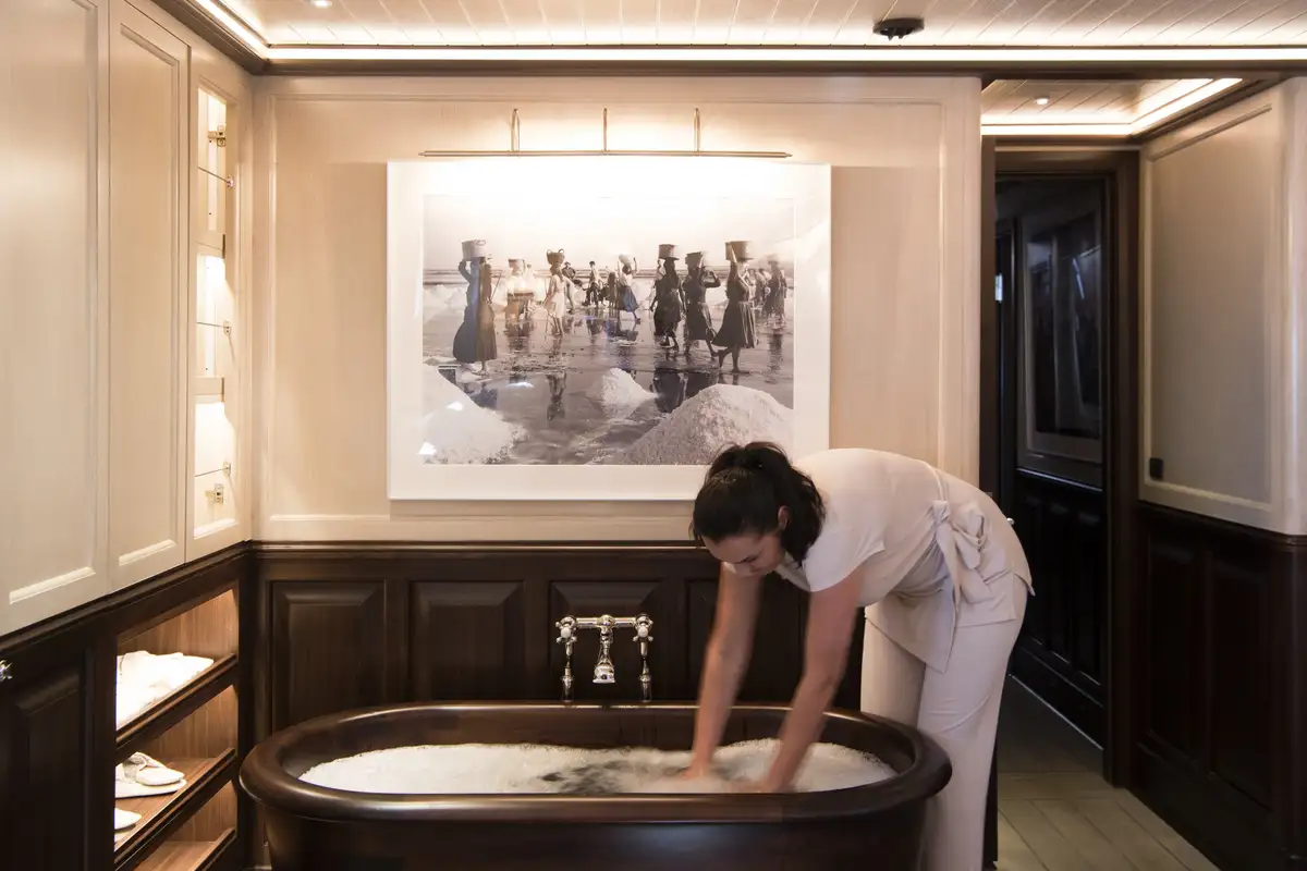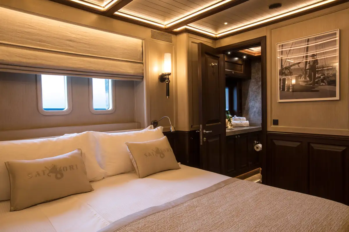 It is time to change for dinner, so descend to your cabin to freshen up. SATORI sleeps 10 guests in five double cabins with black and white photography and cream decor in contrast to the dark woods. Her full beam master cabin features a seating area, study and large bathroom, while the remaining four en suite cabins are all spacious.