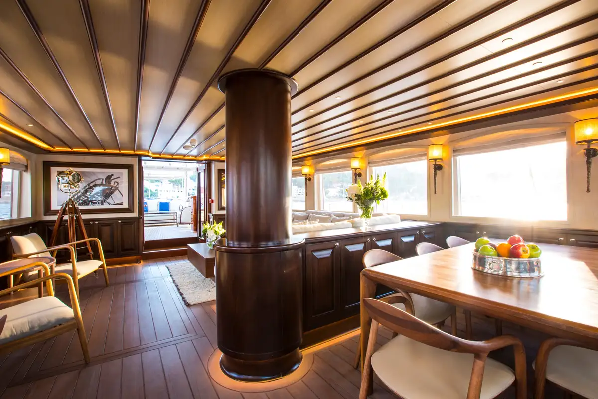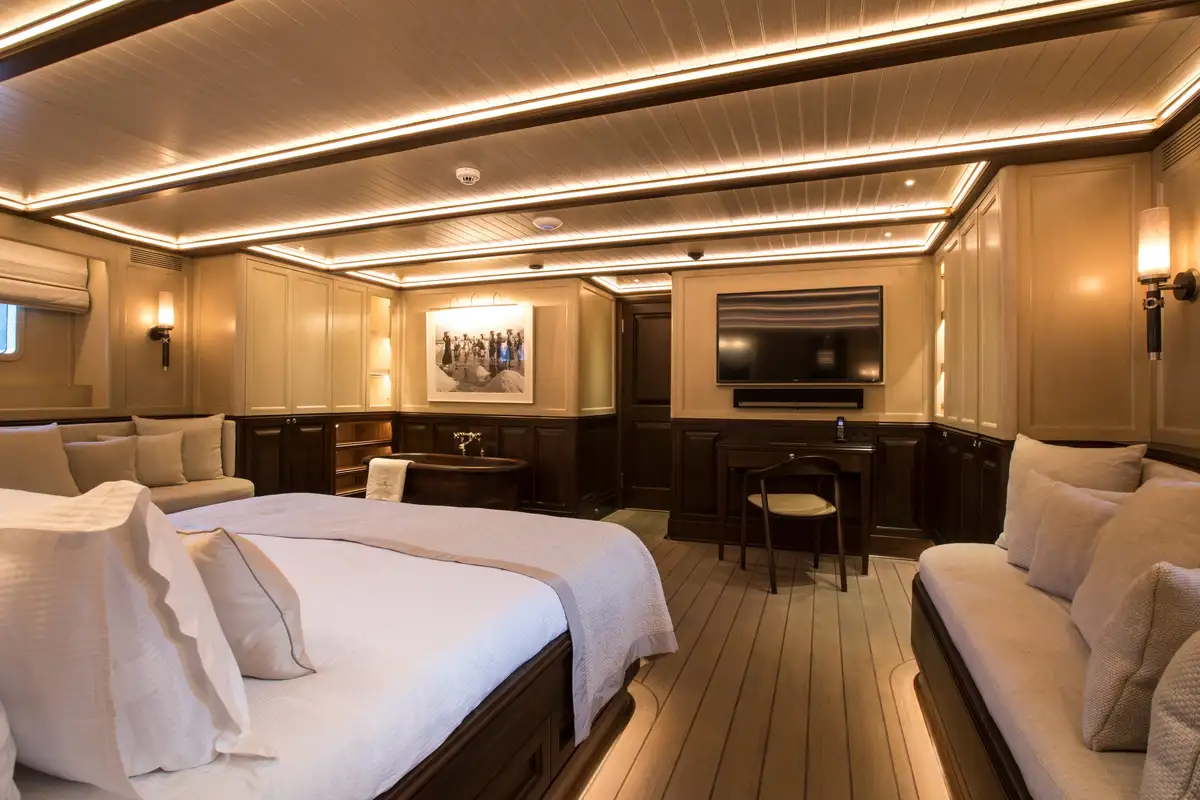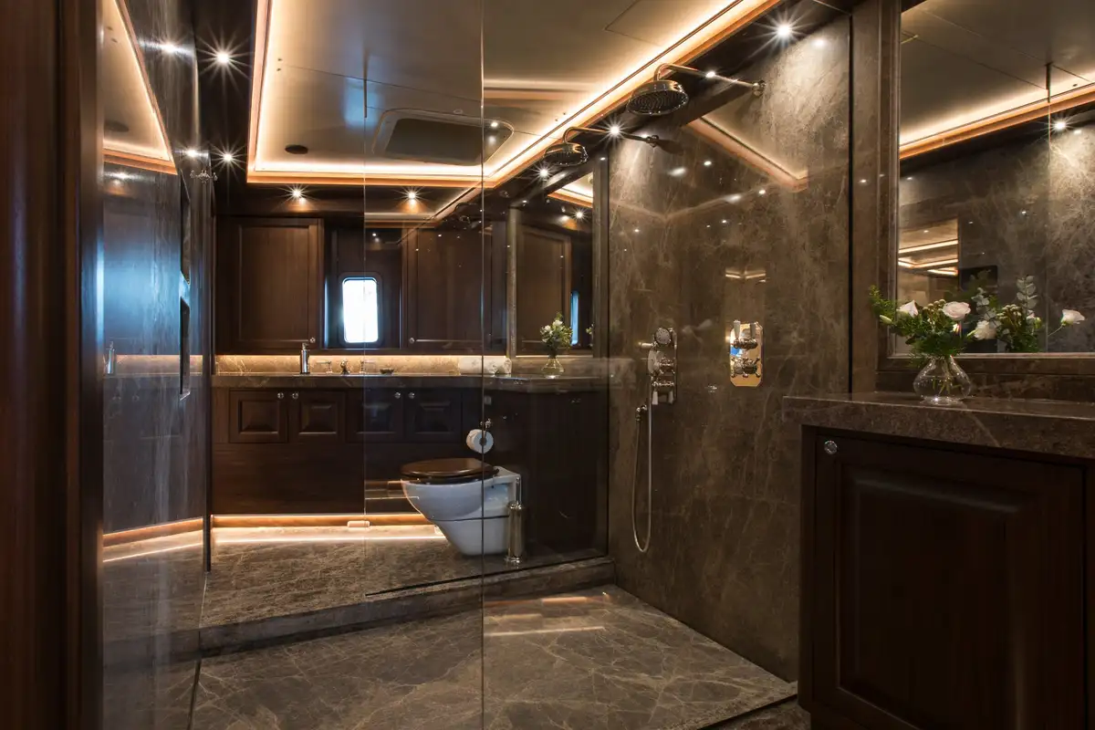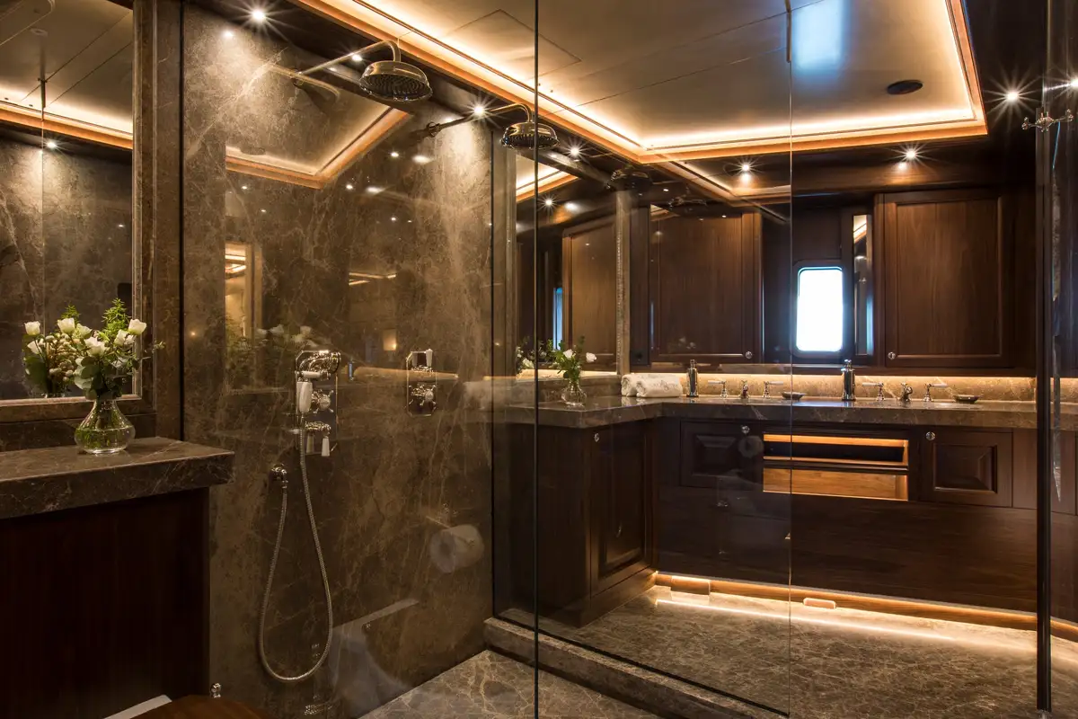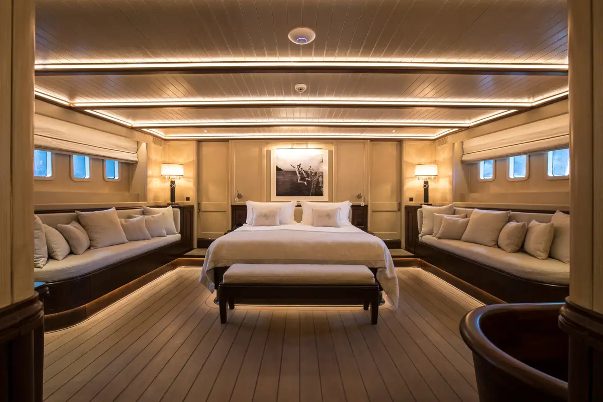 It is time to change for dinner, so descend to your cabin to freshen up. SATORI sleeps 10 guests in five double cabins with black and white photography and cream decor in contrast to the dark woods. Her full beam master cabin features a seating area, study and large bathroom, while the remaining four en suite cabins are all spacious.