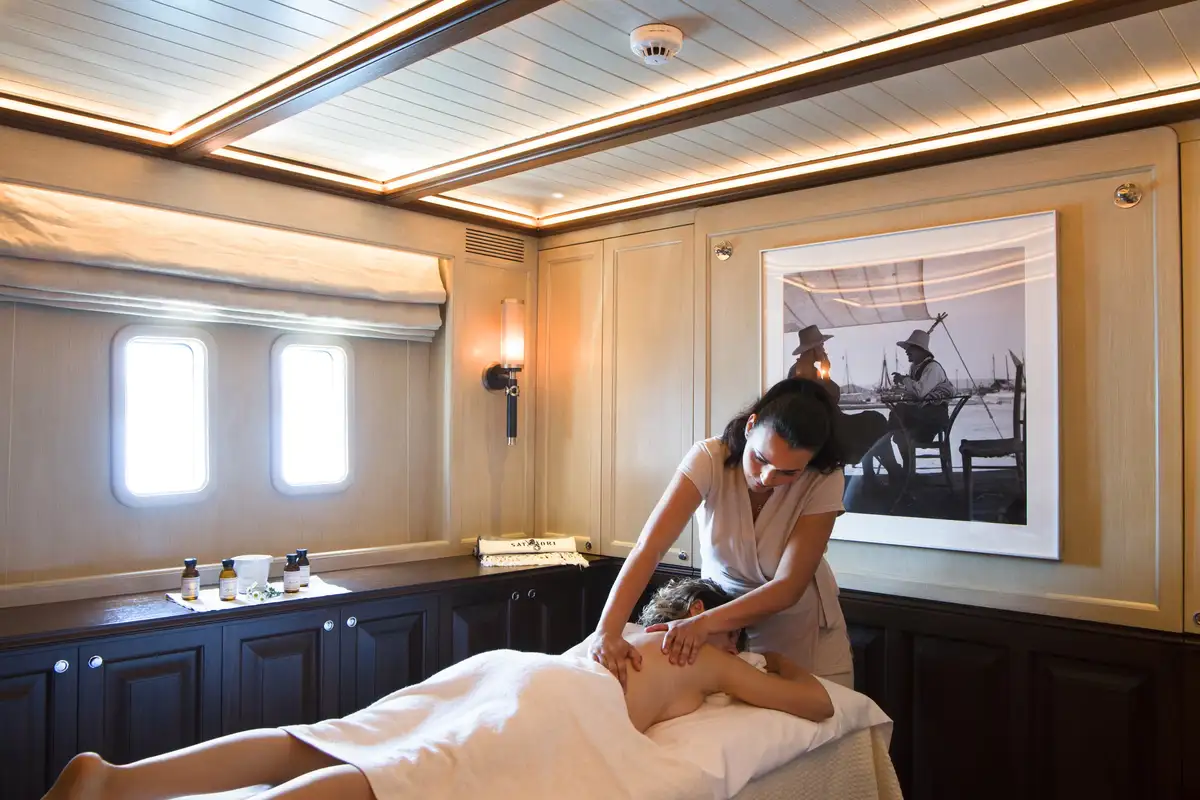 The crew have set up a beach BBQ lunch, with freshly grilled seafood and mouth-watering salads. After, some of your group tour the coastline on the four electric bikes while the remainder head back on board for a little R&R. Soak up the sun on the various sun loungers and sun pads across SATORI’s deck, or head to the treatment room for a massage.