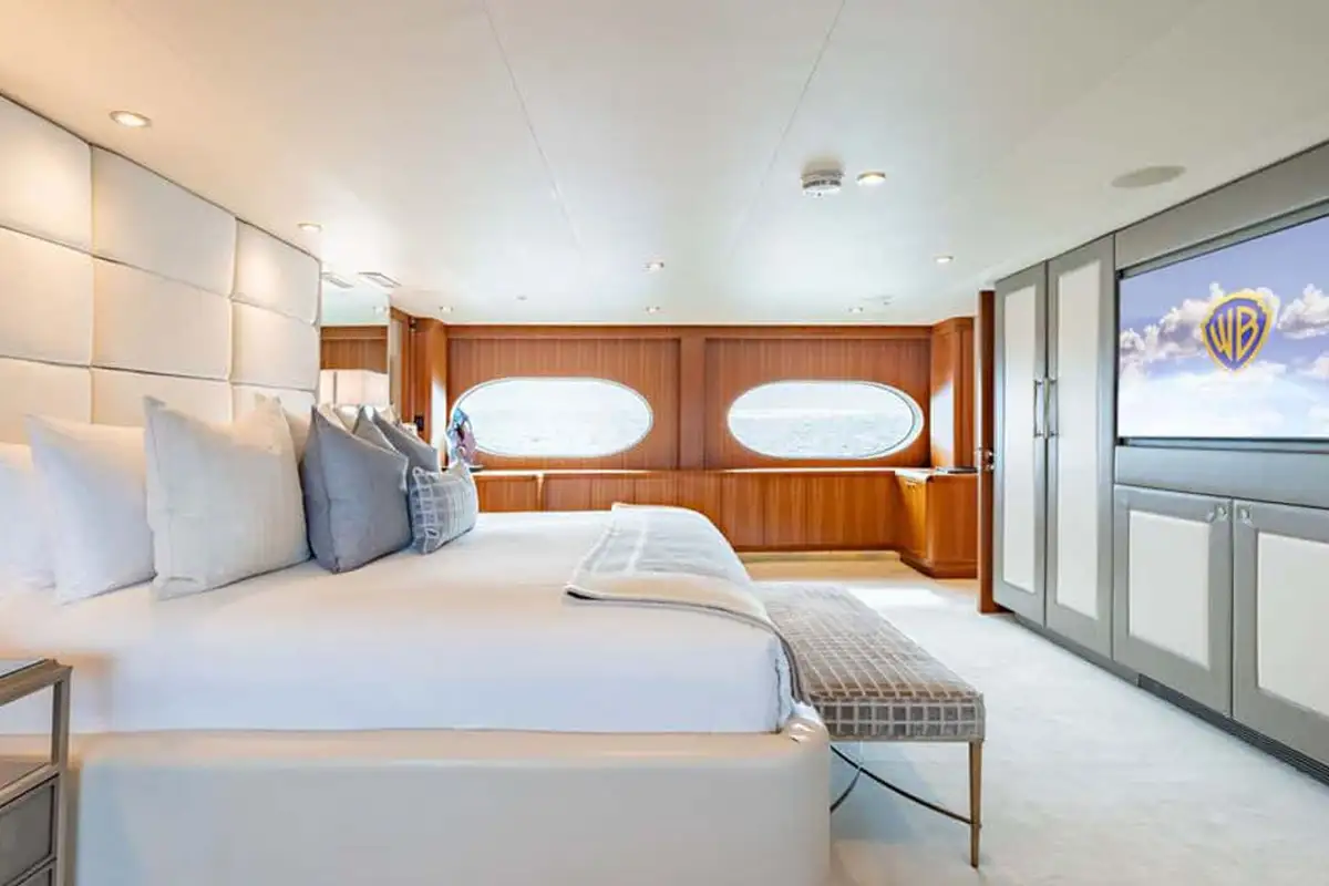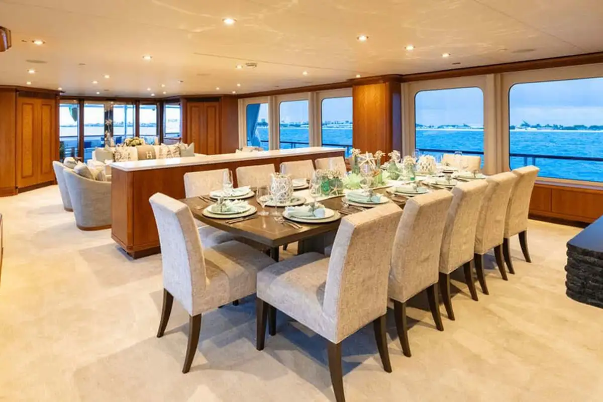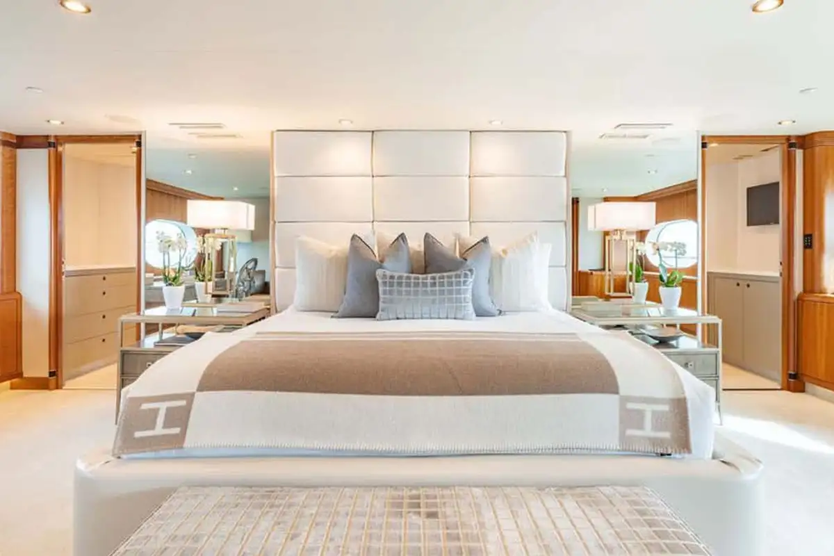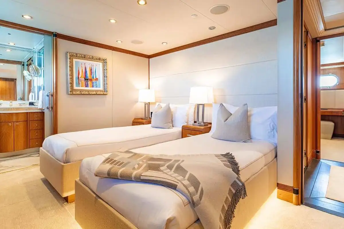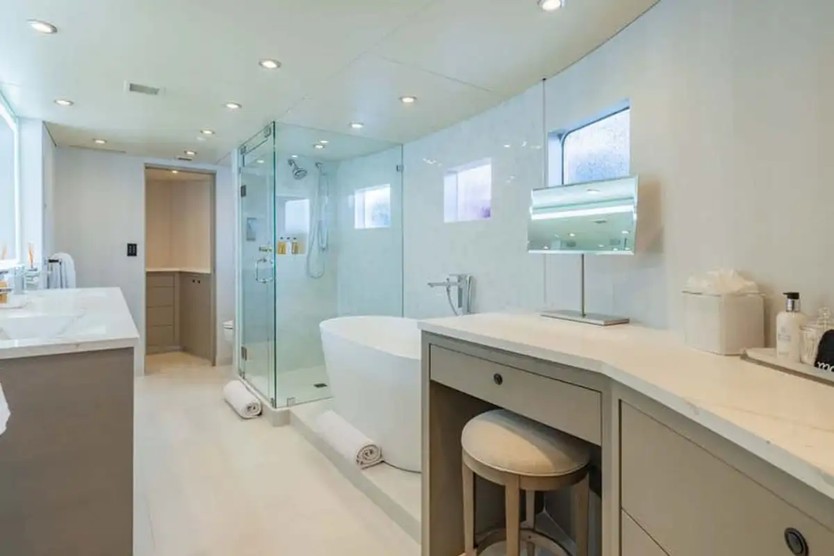 Accommodations include a full-beam Master Stateroom on the main deck with his-and-hers bathrooms (hers with Jacuzzi tub, his with shower), plus four additional King guest staterooms below; three of which can convert to Twin beds for added flexibility. A sixth bonus Queen cabin is also located on the main deck, ideal for staff, children, or a nanny.