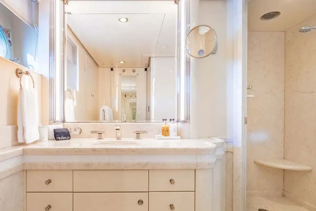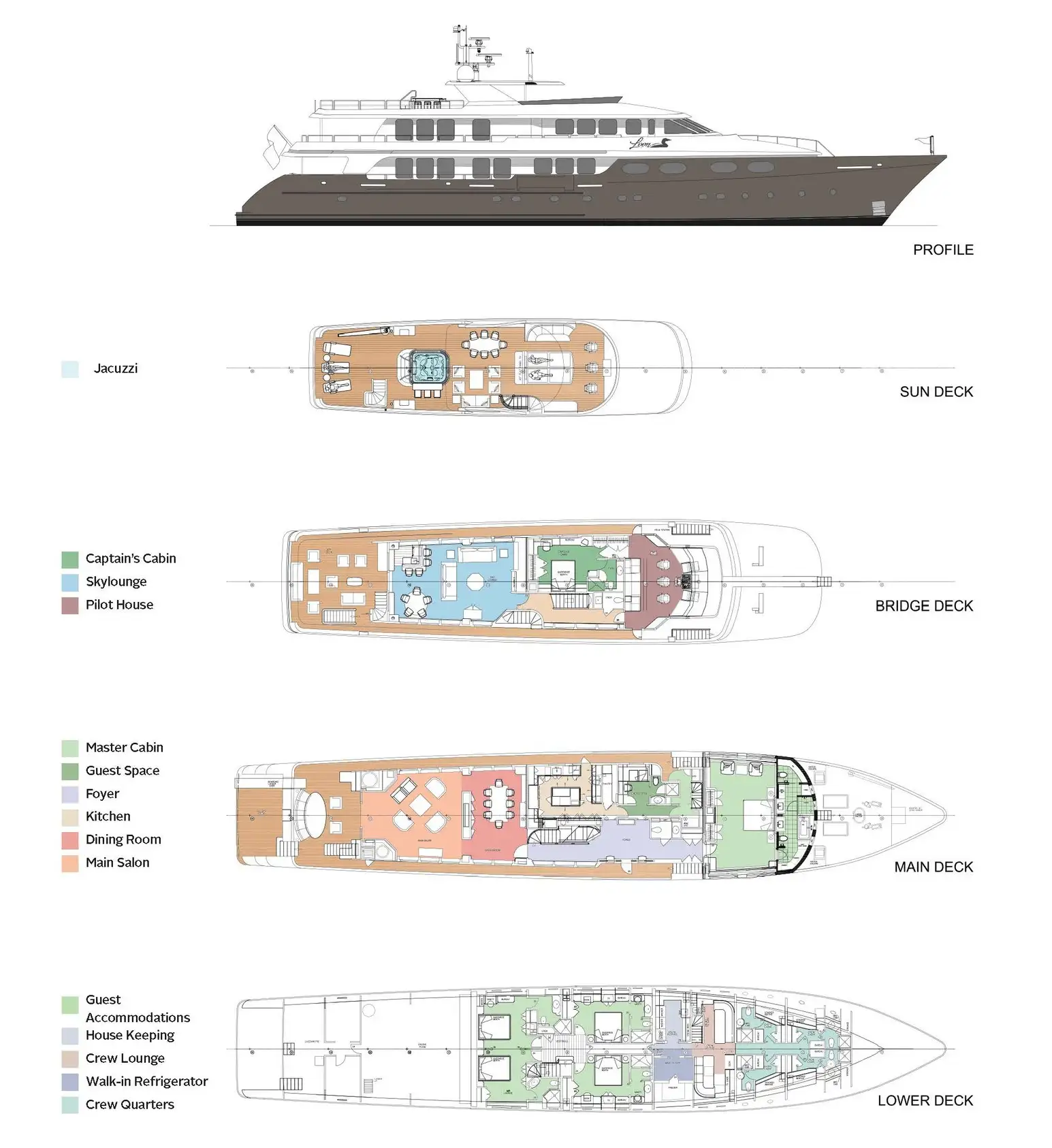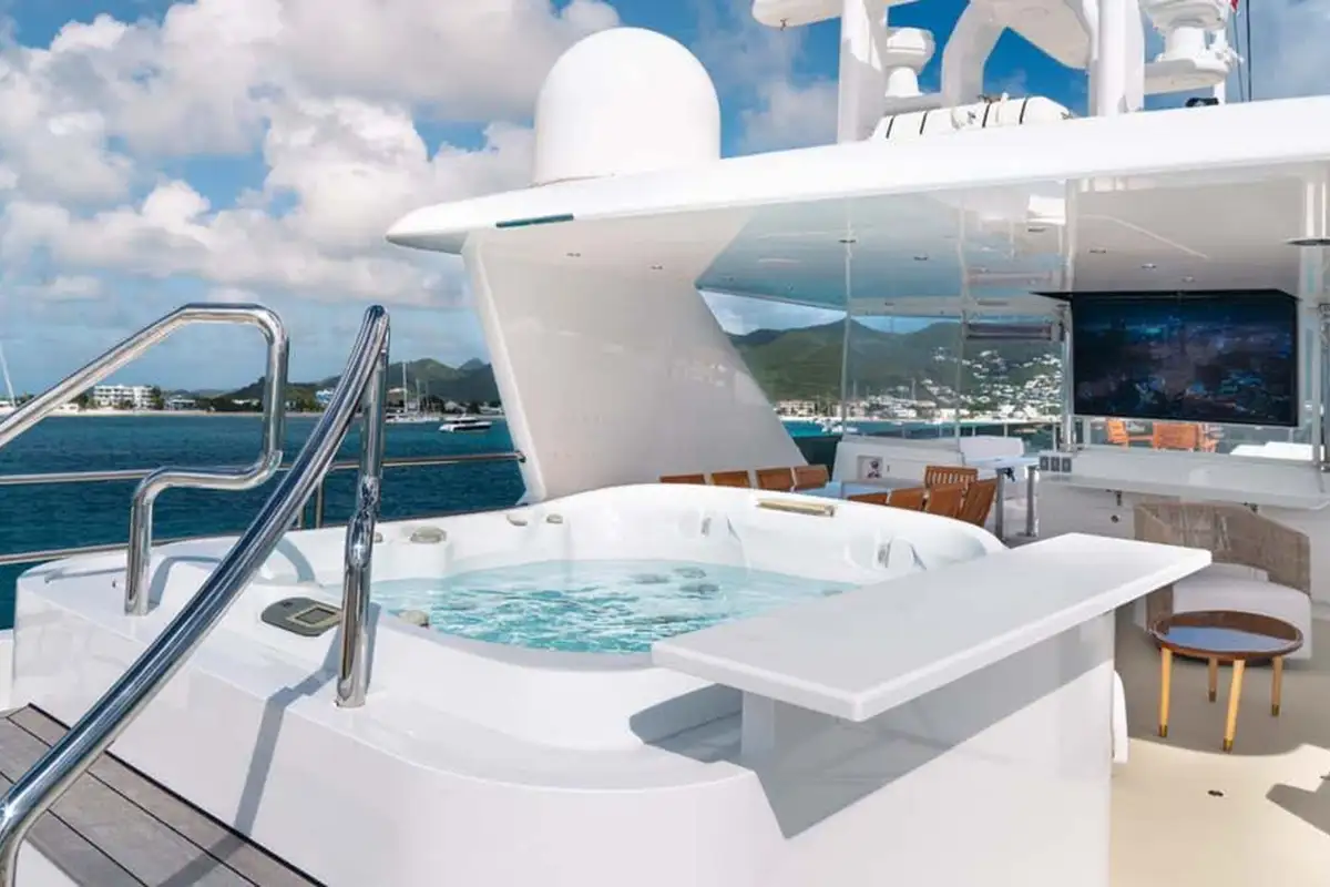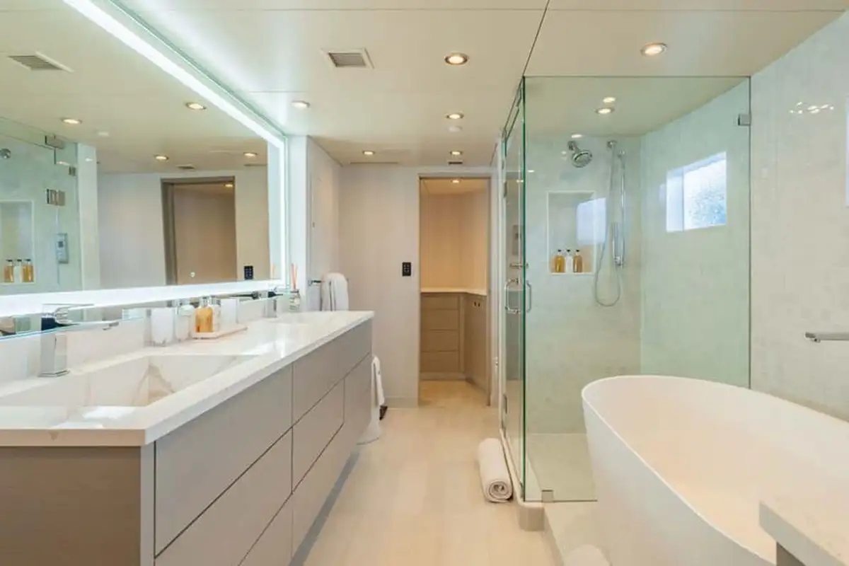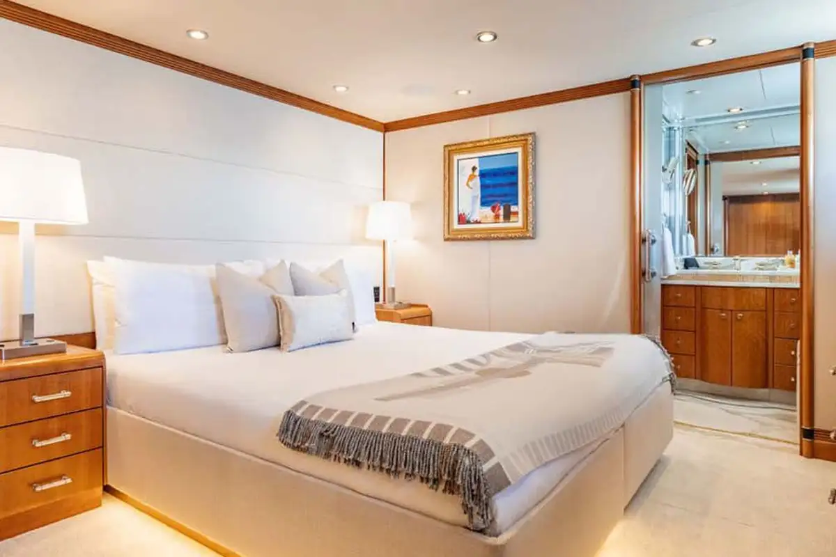 Accommodations include a full-beam Master Stateroom on the main deck with his-and-hers bathrooms (hers with Jacuzzi tub, his with shower), plus four additional King guest staterooms below; three of which can convert to Twin beds for added flexibility. A sixth bonus Queen cabin is also located on the main deck, ideal for staff, children, or a nanny.
