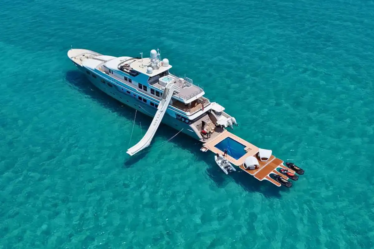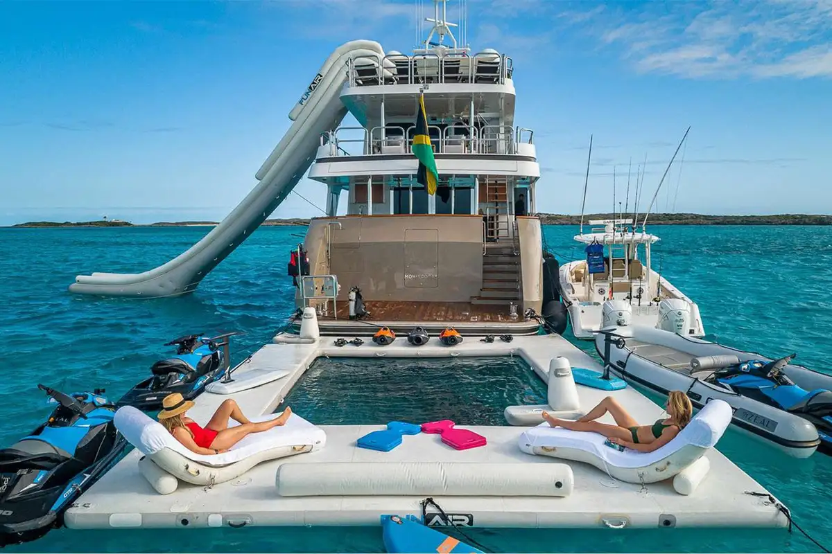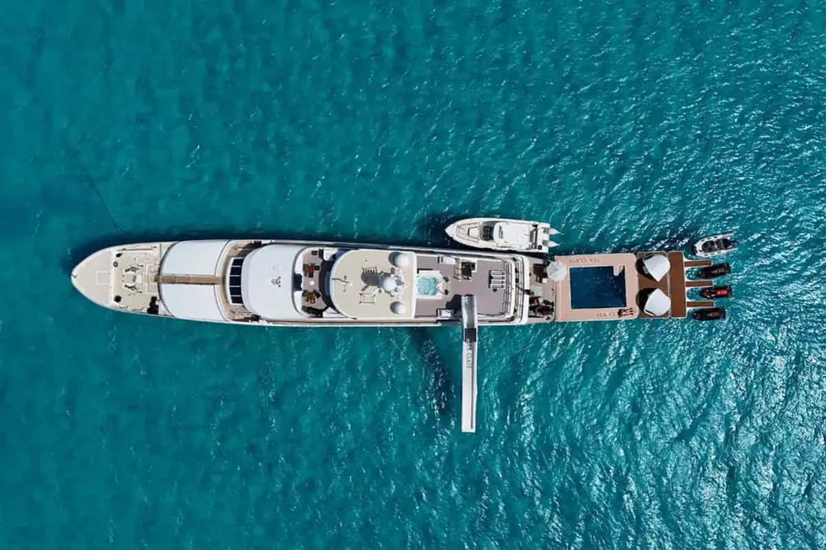 SEA CLASS is particularly well-suited for adventure and watersports. Her impressive toy inventory includes a 36’ towed Everglades tender, four Waverunners, e-foils, Seabobs, a 30' pool, a 27' waterslide, scuba gear, spearfishing equipment, and a full beach BBQ setup. A large swim platform and water-sports-ready lazarette ensure seamless access to the sea.