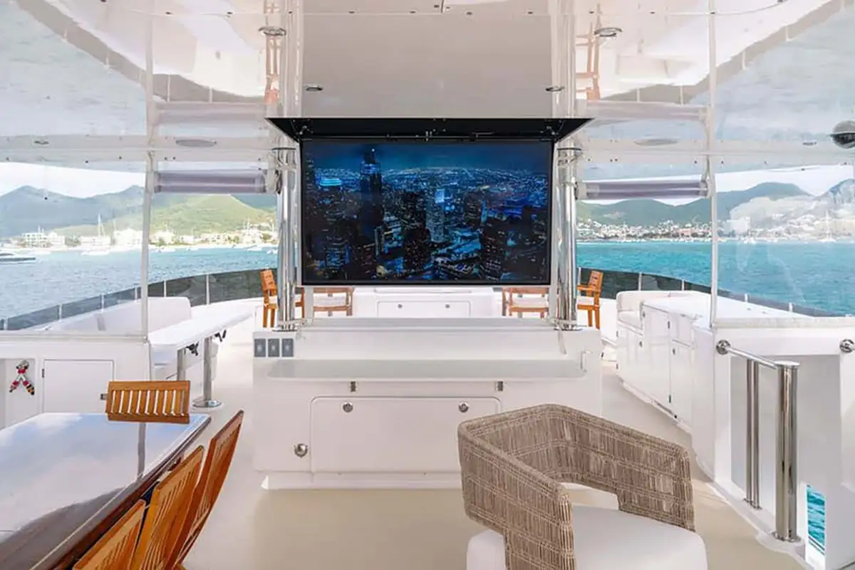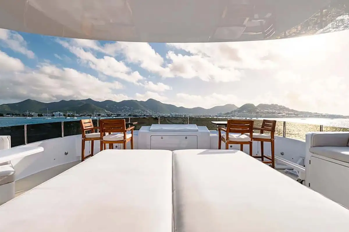 Dining options abound, with formal seating for 12 on the main deck, shaded alfresco dining aft of the skylounge, and casual snacks or cocktails on the sprawling sundeck. The sundeck also features a Jacuzzi surrounded by loungers, a gas grill, sunpads, and twin high-top tables with forward-facing views.