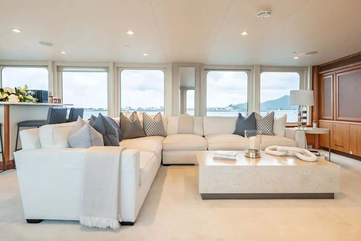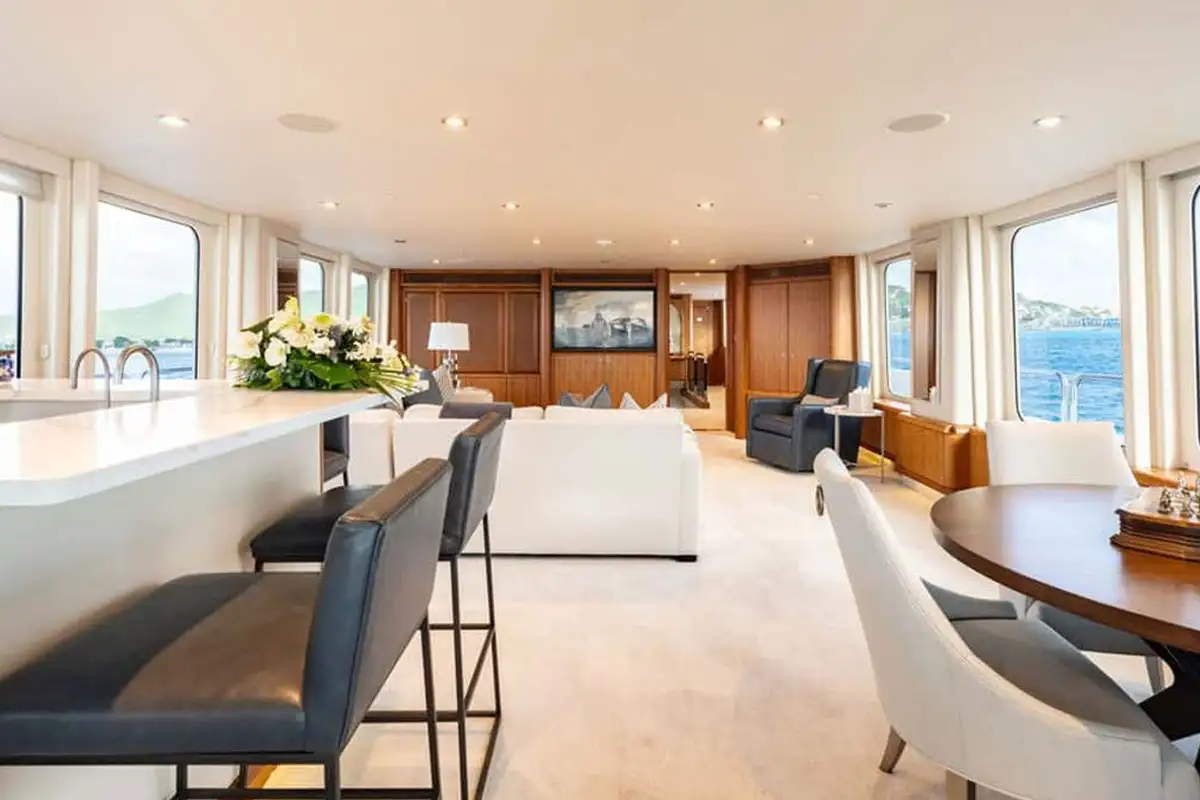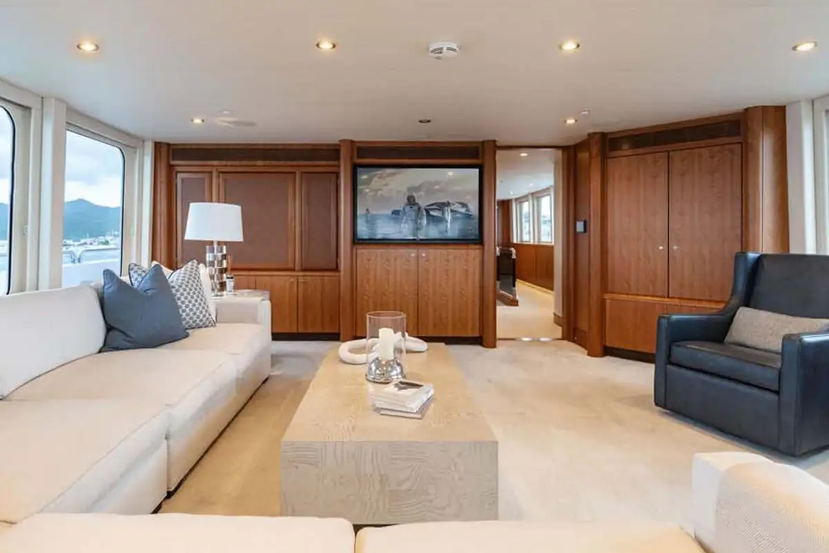 Finished in warm light cherry wood and soft neutral tones, the yacht’s interior is spacious and welcoming. Oversized windows throughout the main deck and skylounge bring in natural light and ocean views, while a walk-up bar, cozy skylounge, and spacious main salon offer multiple places to gather and unwind.