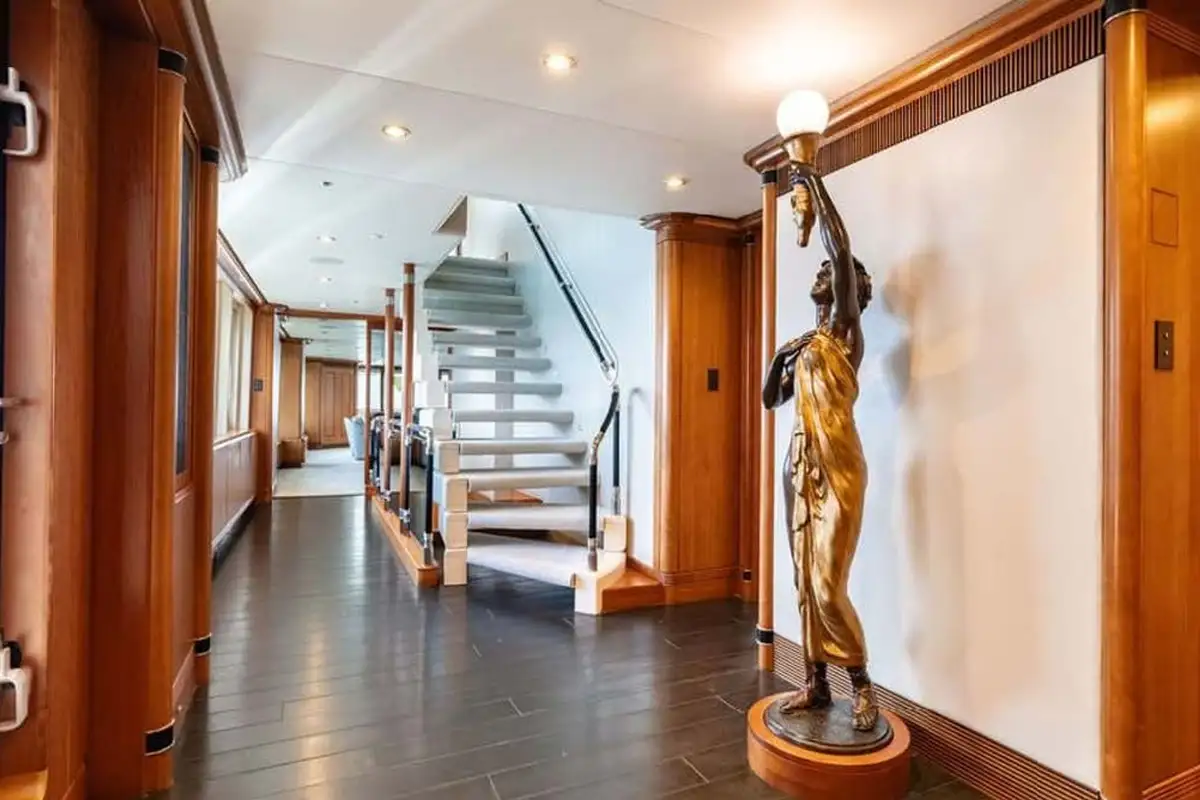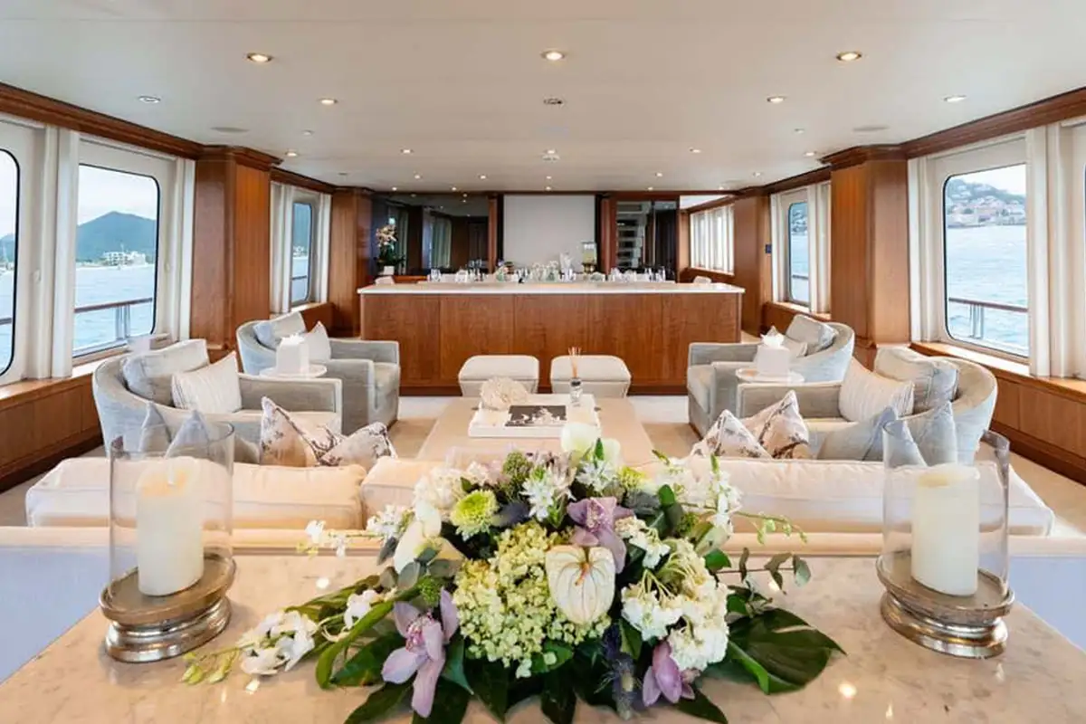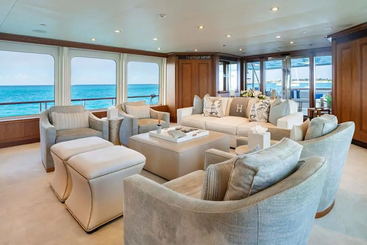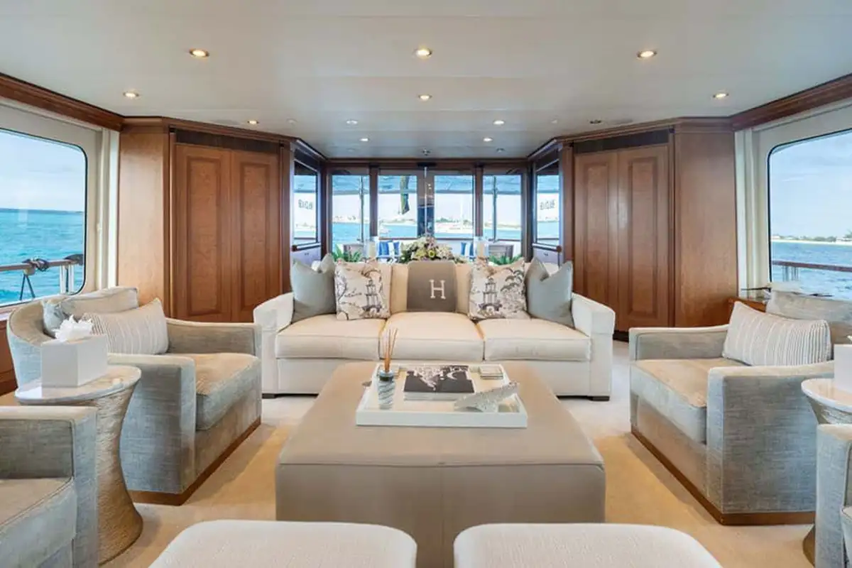 Finished in warm light cherry wood and soft neutral tones, the yacht’s interior is spacious and welcoming. Oversized windows throughout the main deck and skylounge bring in natural light and ocean views, while a walk-up bar, cozy skylounge, and spacious main salon offer multiple places to gather and unwind.