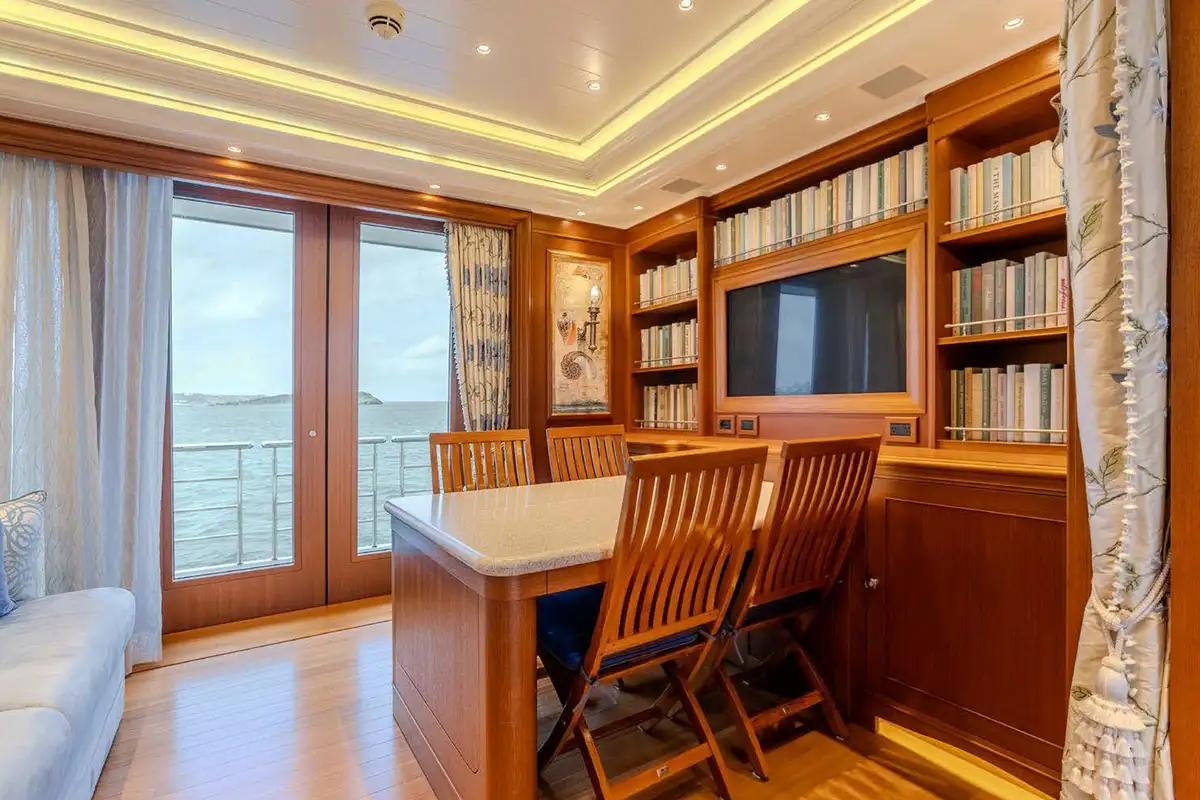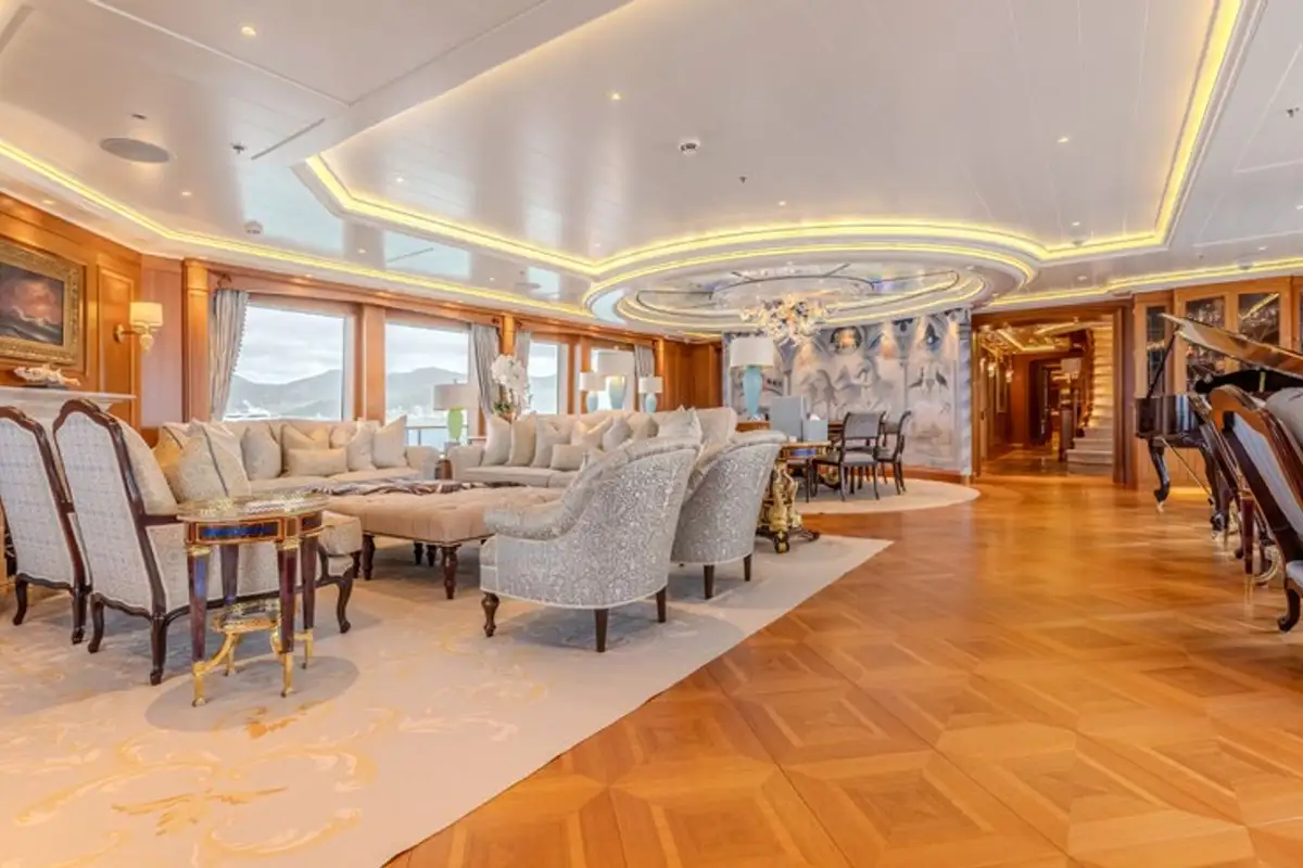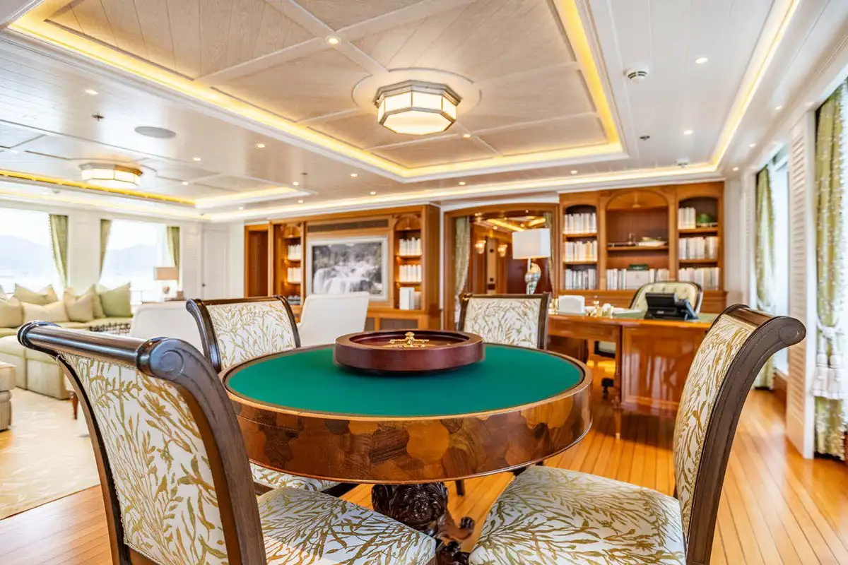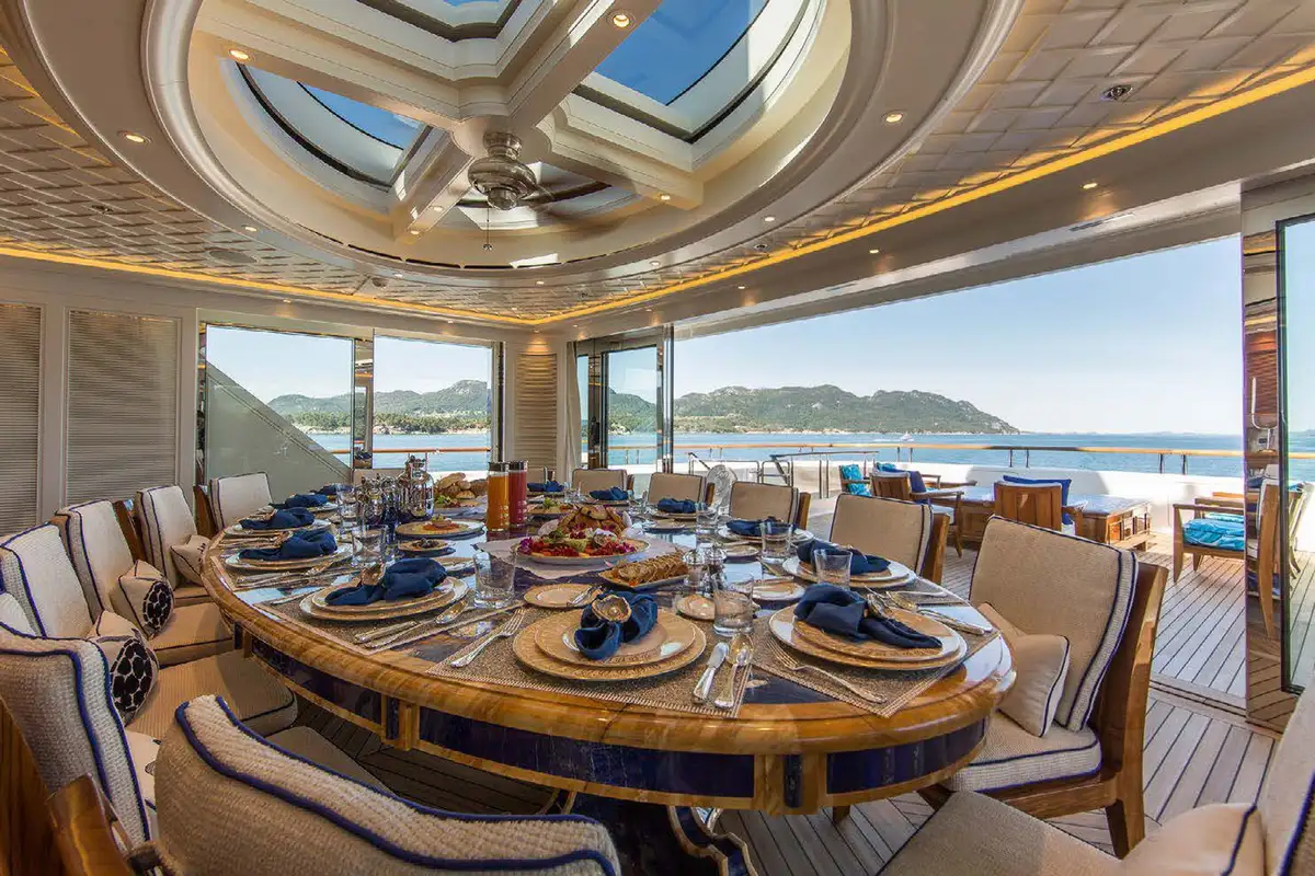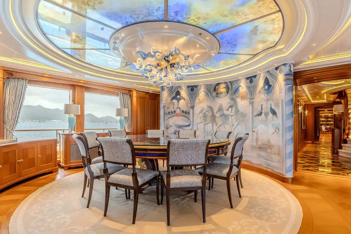 Her social and entertainment spaces are equally compelling. The main lounge is a sunlit haven with large windows, a light and neutral palette, and a cozy fireplace that creates a warm, inviting ambiance. Fully opening glass doors aft, blurs the boundary between interior and sea. The formal dining room is a showpiece, featuring a large custom pietre dure dining table, a dazzling Dale Chihuly Venetian glass chandelier, and a hand-painted mural that sets the tone for unforgettable meals. The bridge deck is designed for relaxation and family connection, offering a full-beam sky lounge that transforms into a private cinema, a gym with an adjacent massage room, and even a classroom complete with a hidden Murphy bed and fold-out balconies perfect for young explorers or creative minds.