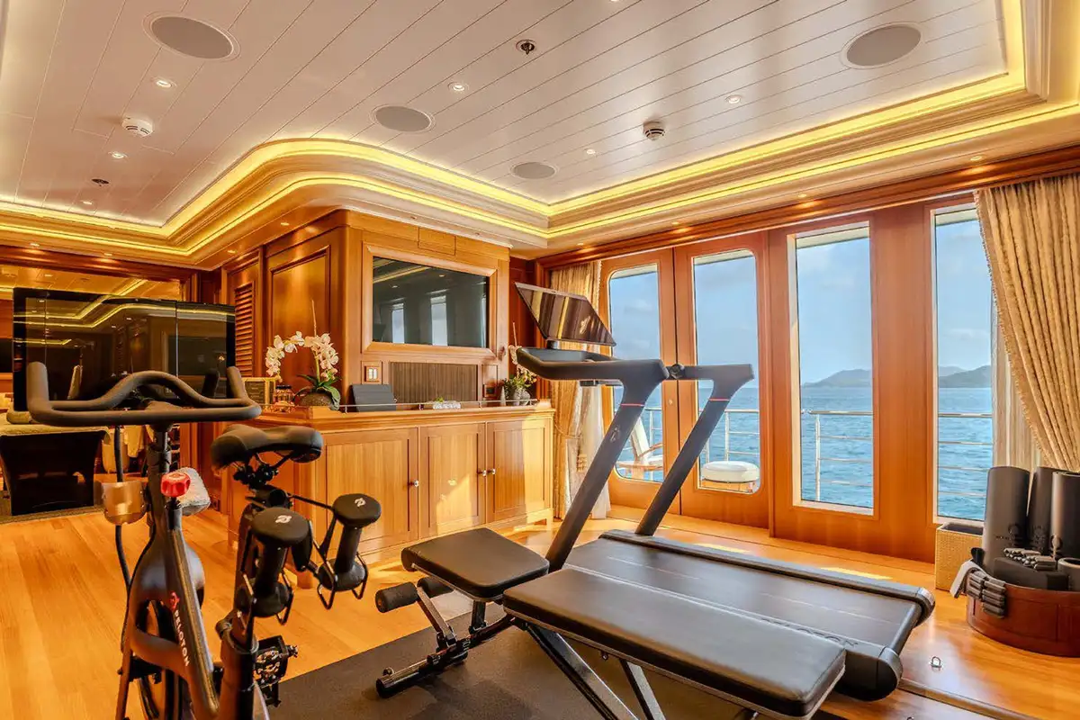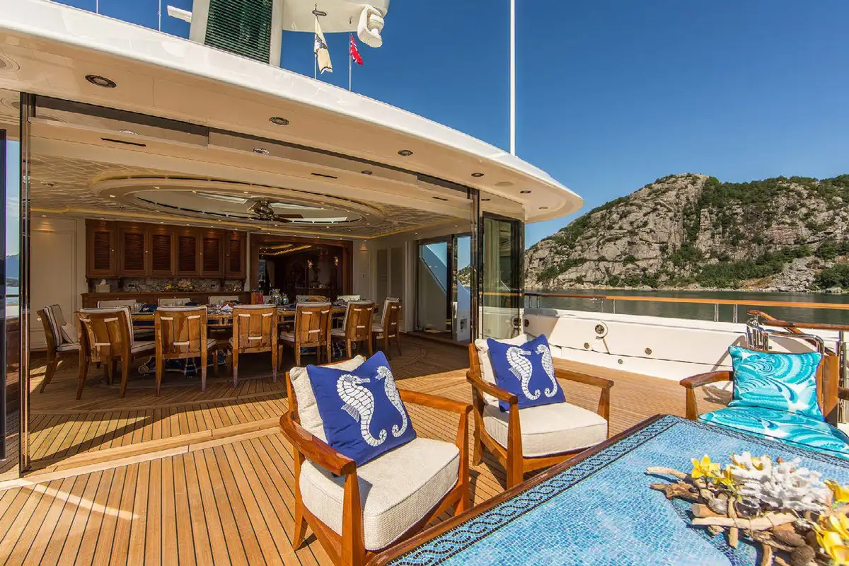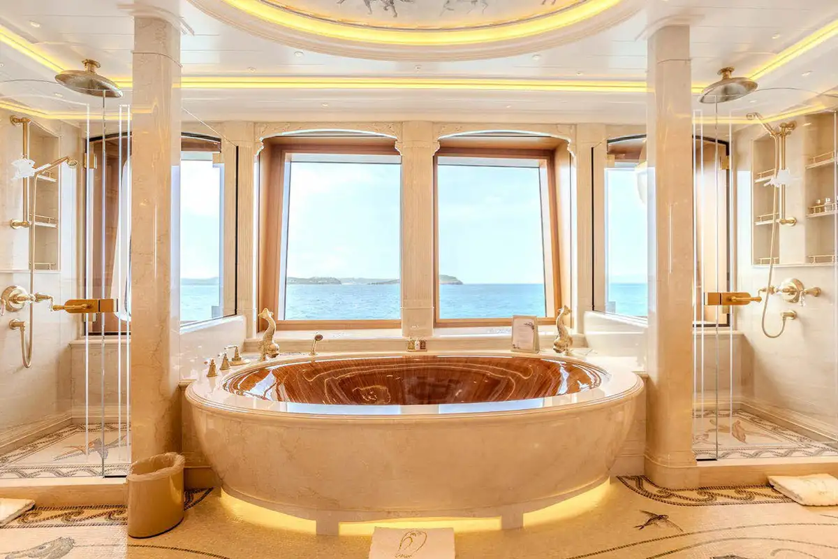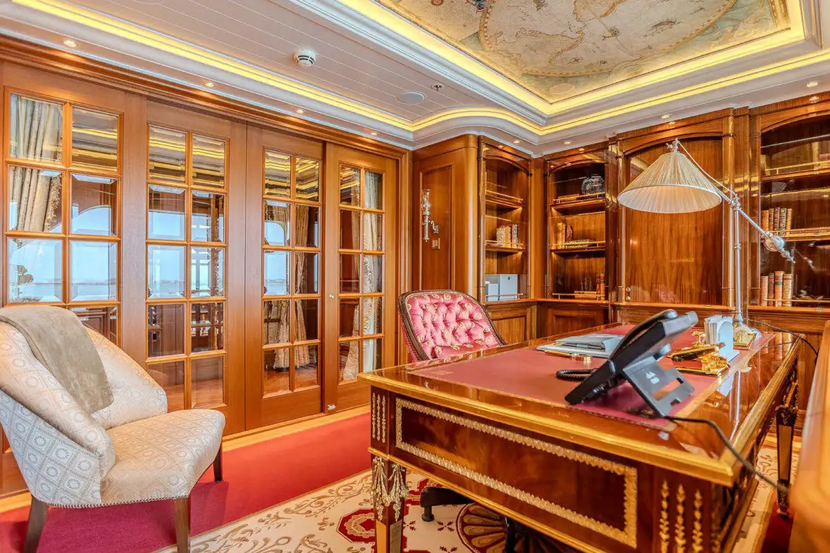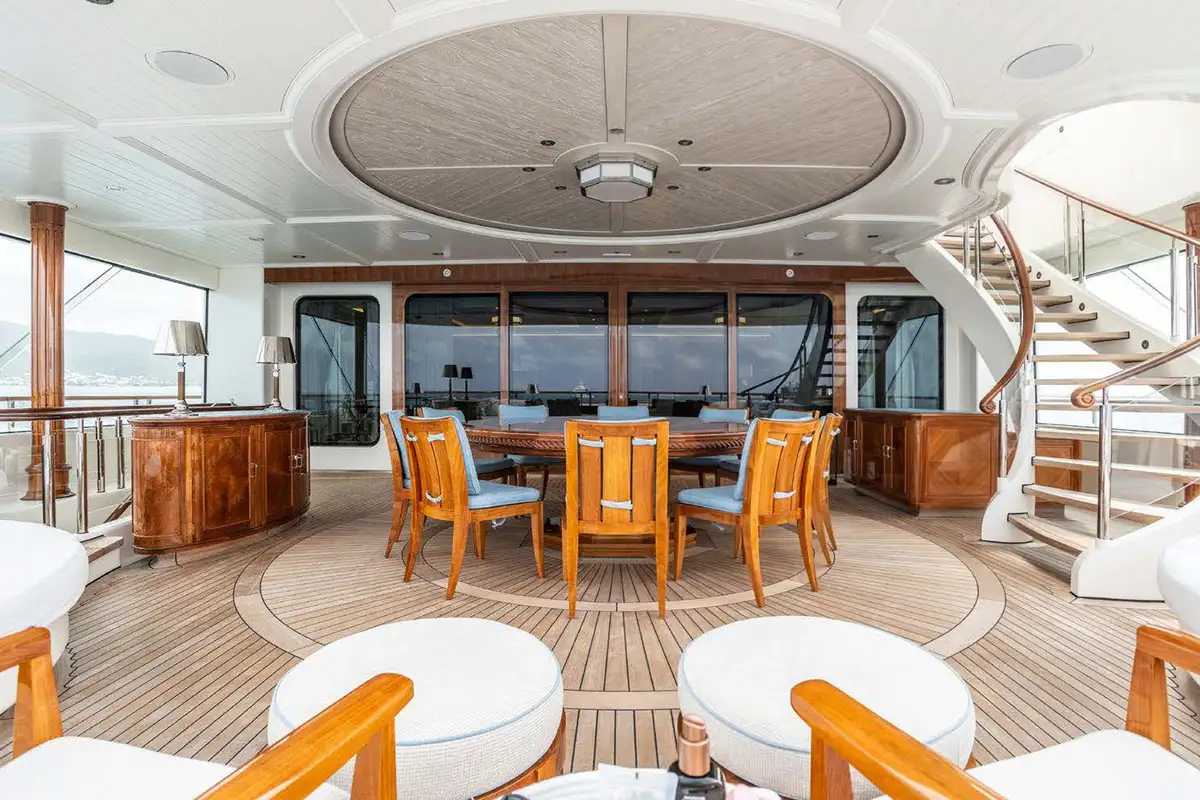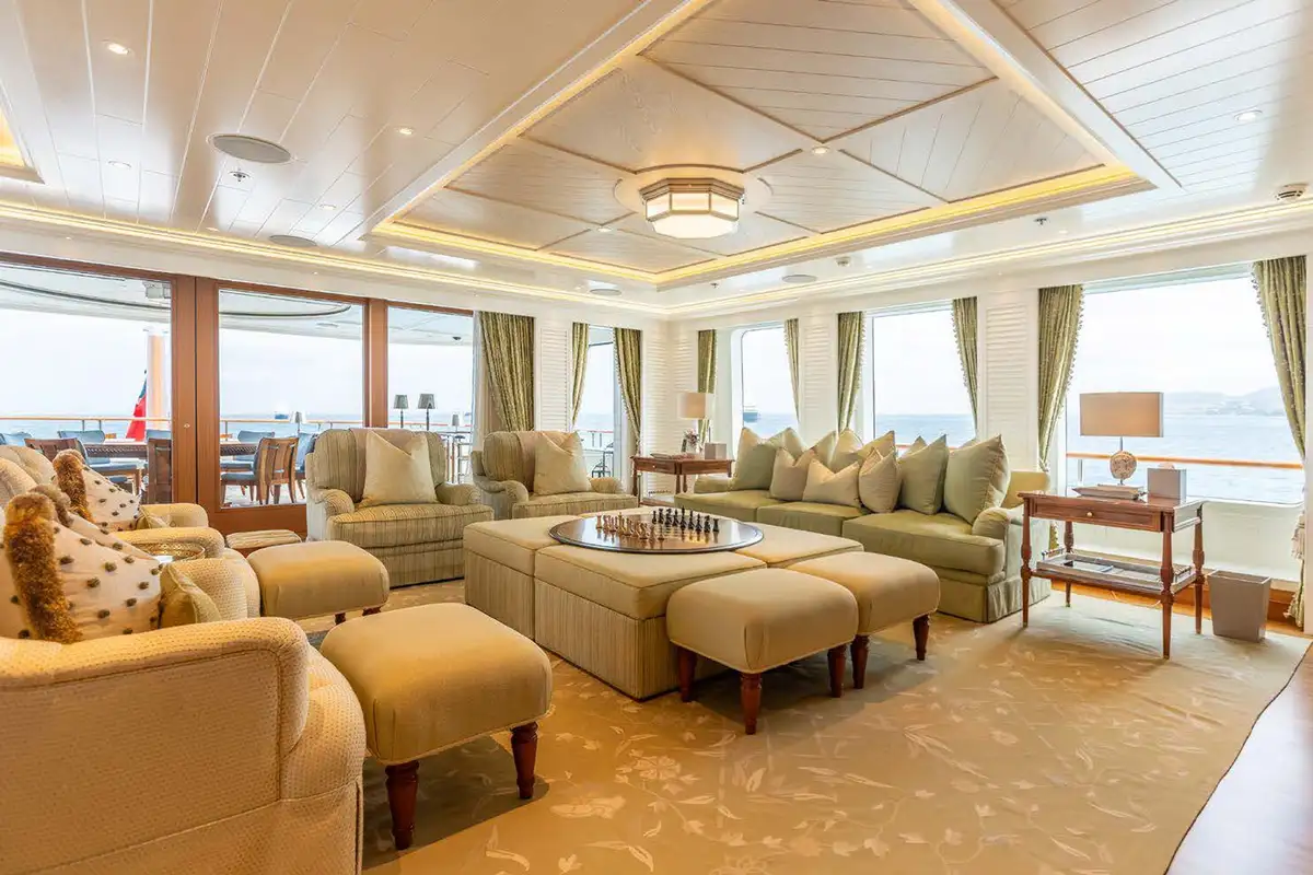 Her social and entertainment spaces are equally compelling. The main lounge is a sunlit haven with large windows, a light and neutral palette, and a cozy fireplace that creates a warm, inviting ambiance. Fully opening glass doors aft, blurs the boundary between interior and sea. The formal dining room is a showpiece, featuring a large custom pietre dure dining table, a dazzling Dale Chihuly Venetian glass chandelier, and a hand-painted mural that sets the tone for unforgettable meals. The bridge deck is designed for relaxation and family connection, offering a full-beam sky lounge that transforms into a private cinema, a gym with an adjacent massage room, and even a classroom complete with a hidden Murphy bed and fold-out balconies perfect for young explorers or creative minds.
