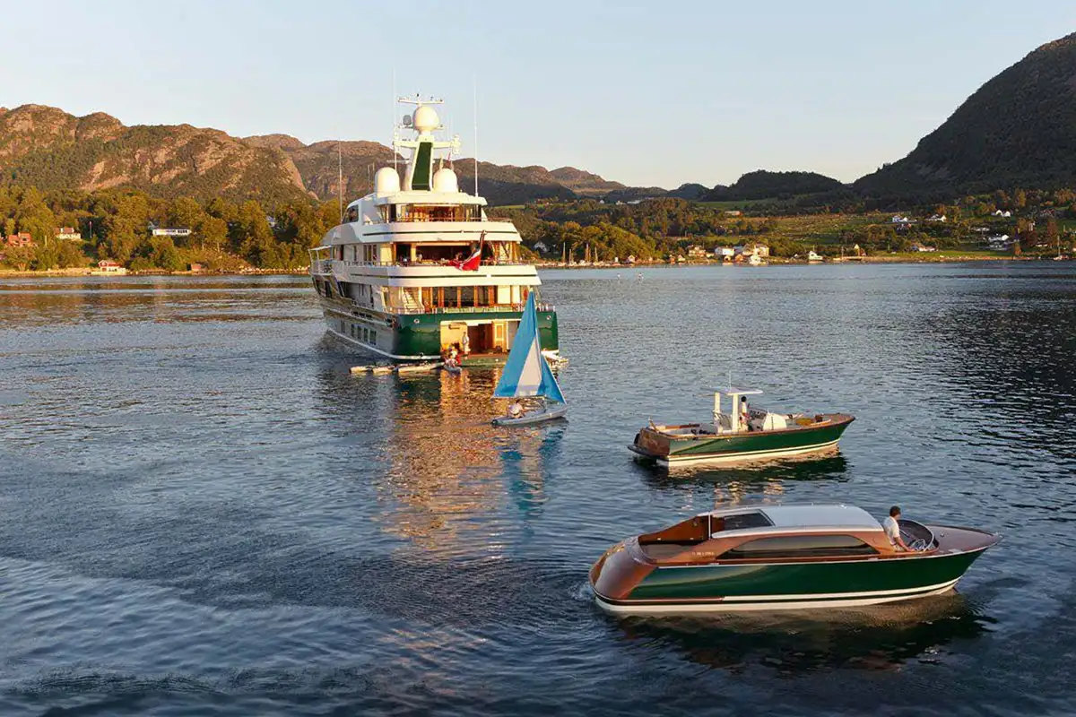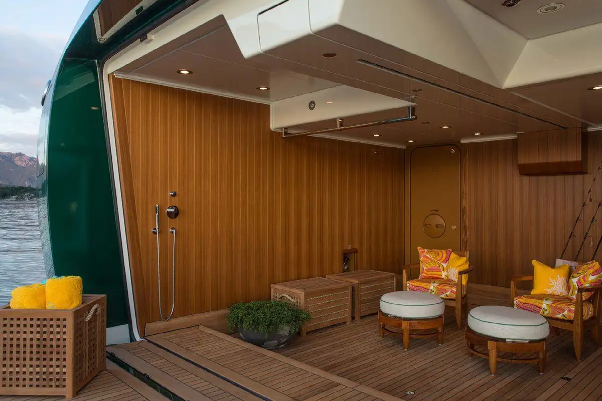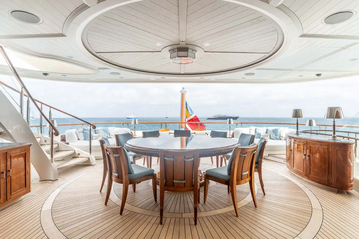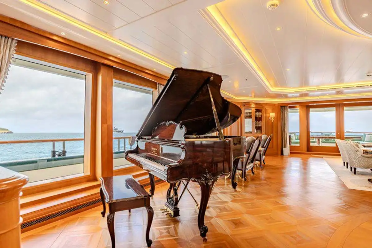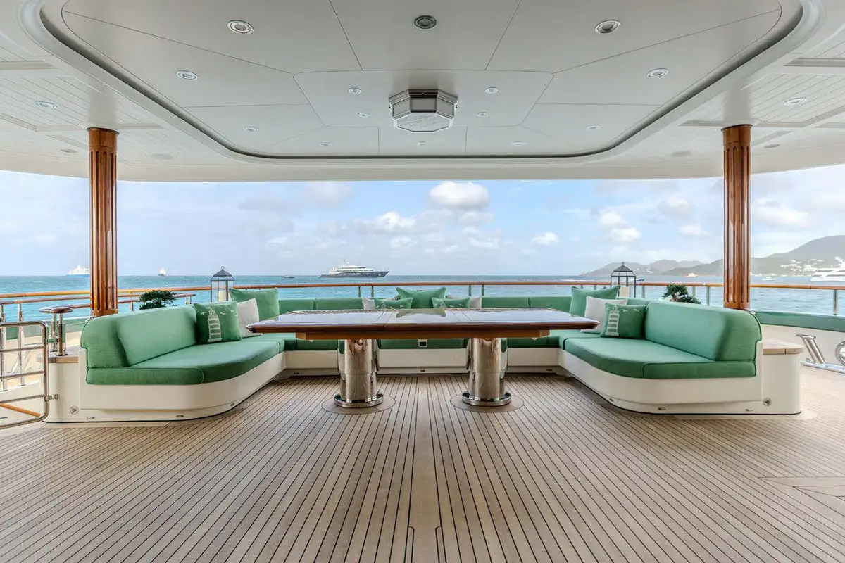 Her social and entertainment spaces are equally compelling. The main lounge is a sunlit haven with large windows, a light and neutral palette, and a cozy fireplace that creates a warm, inviting ambiance. Fully opening glass doors aft, blurs the boundary between interior and sea. The formal dining room is a showpiece, featuring a large custom pietre dure dining table, a dazzling Dale Chihuly Venetian glass chandelier, and a hand-painted mural that sets the tone for unforgettable meals. The bridge deck is designed for relaxation and family connection, offering a full-beam sky lounge that transforms into a private cinema, a gym with an adjacent massage room, and even a classroom complete with a hidden Murphy bed and fold-out balconies perfect for young explorers or creative minds.