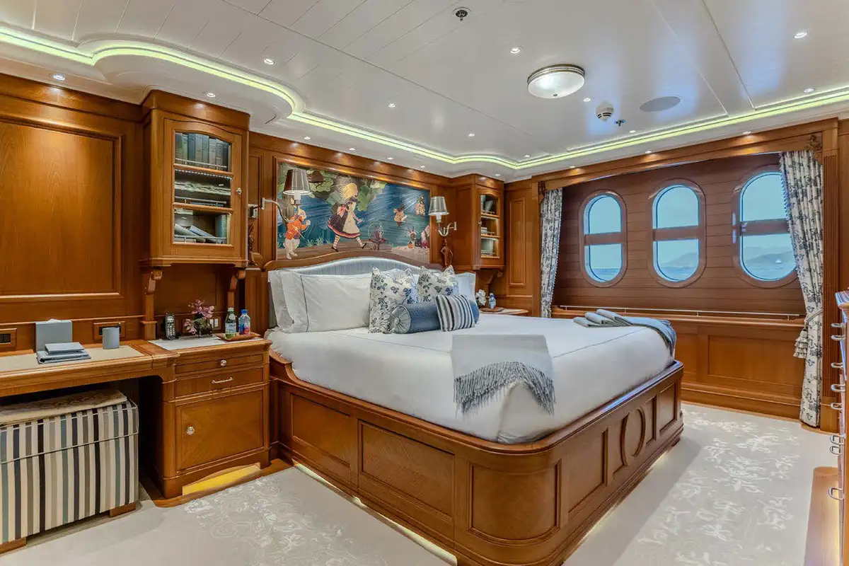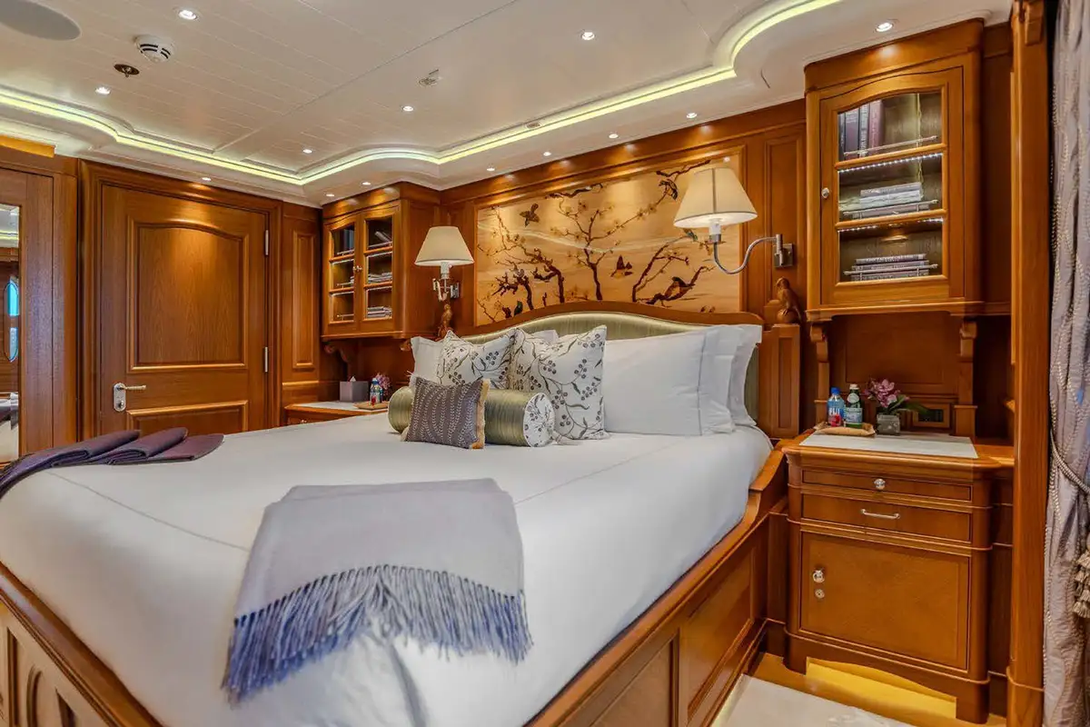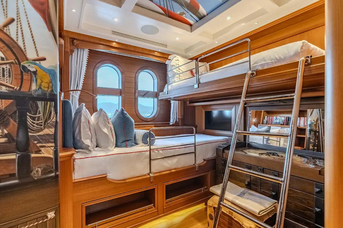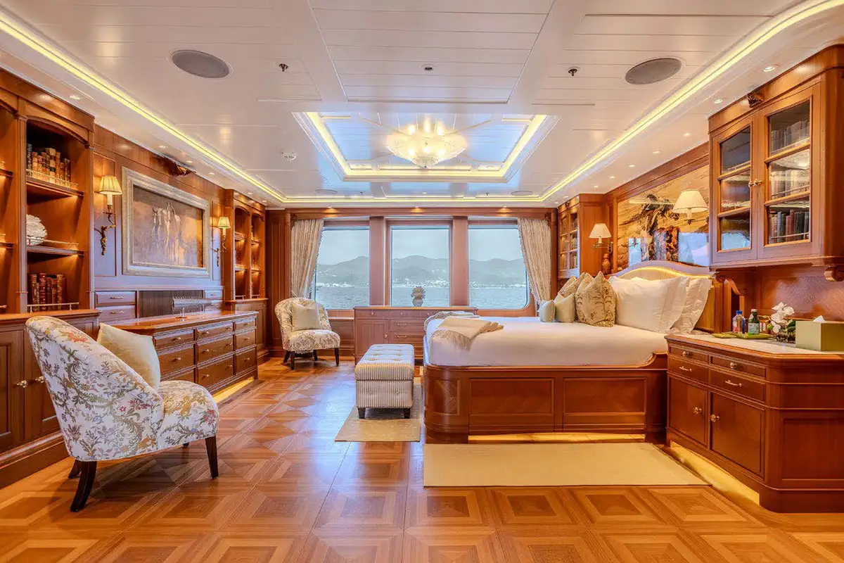 SEA OWL has seven themed cabins for up to 12 guests, including a full-beam master cabin with private study, three distinct VIP cabins, and additional cabins for children, nannies, or staff.