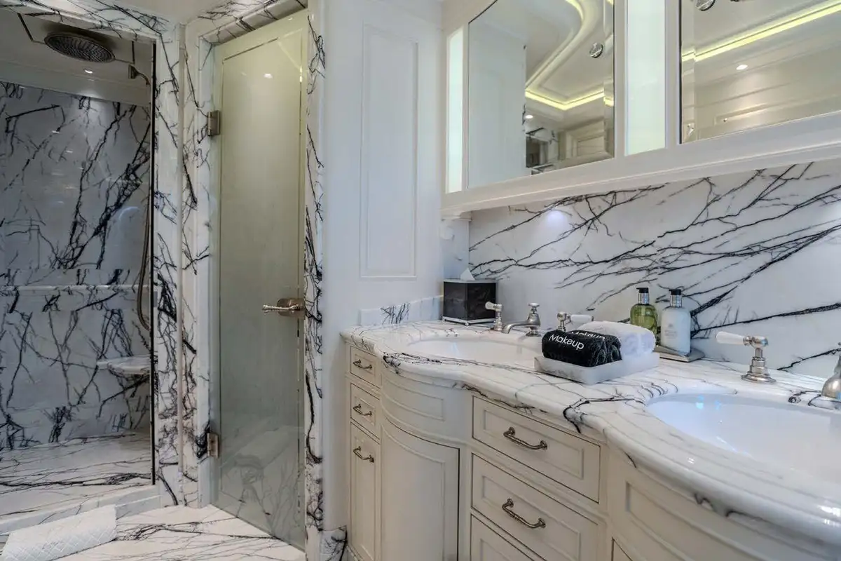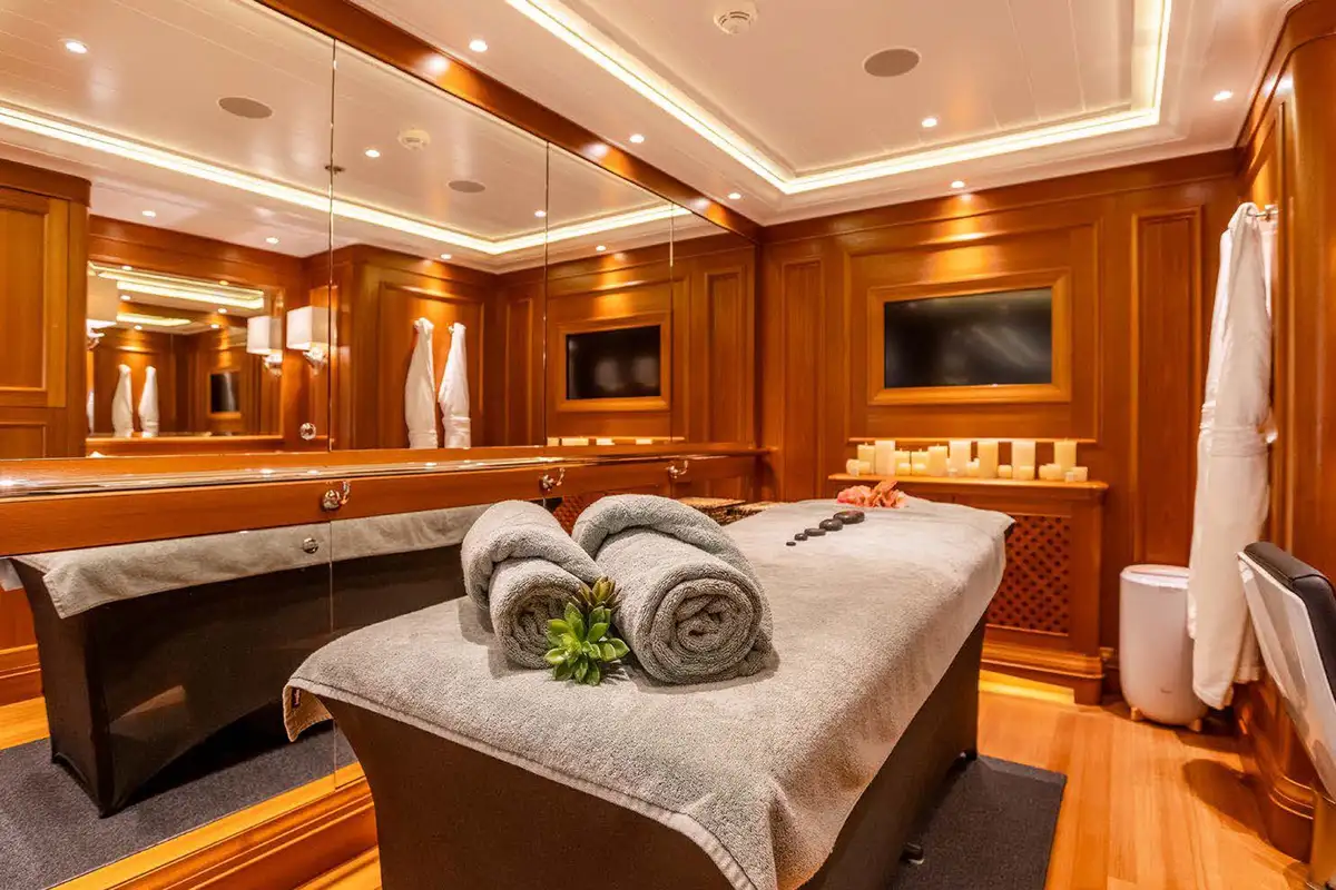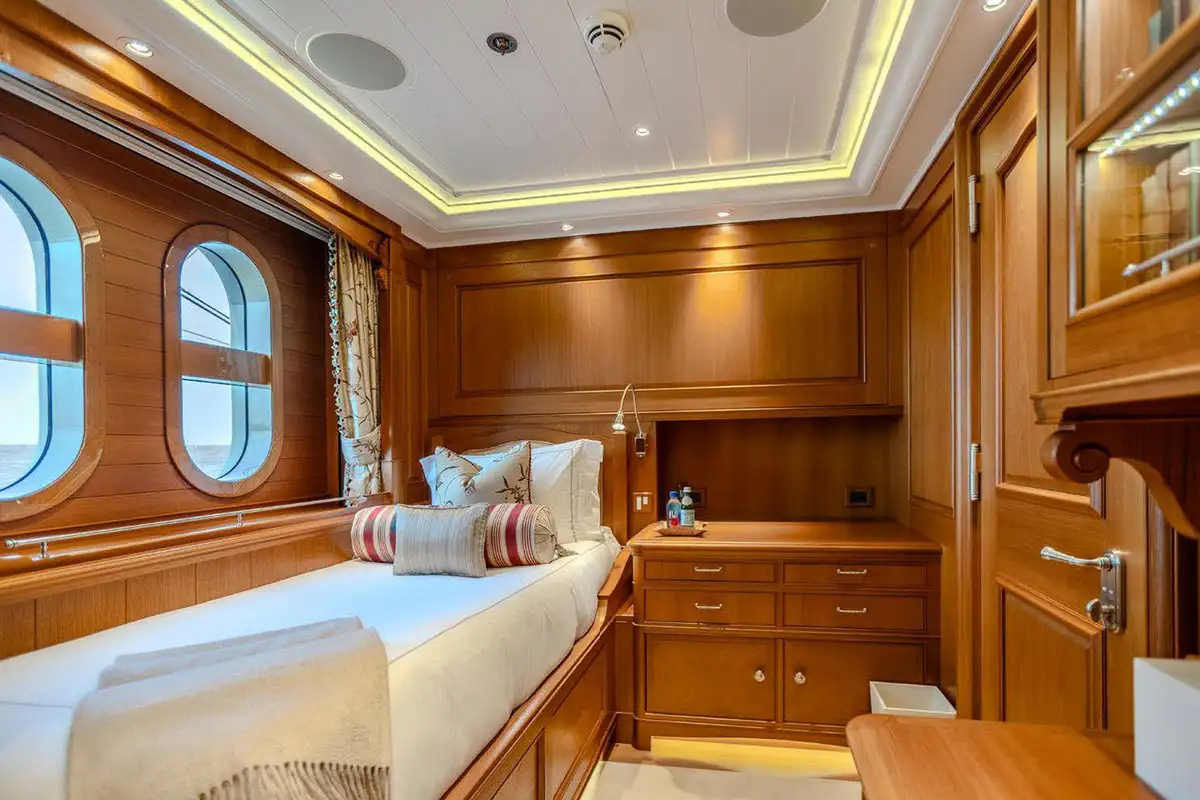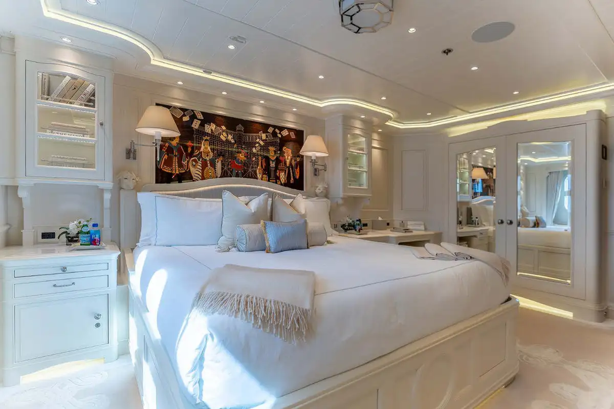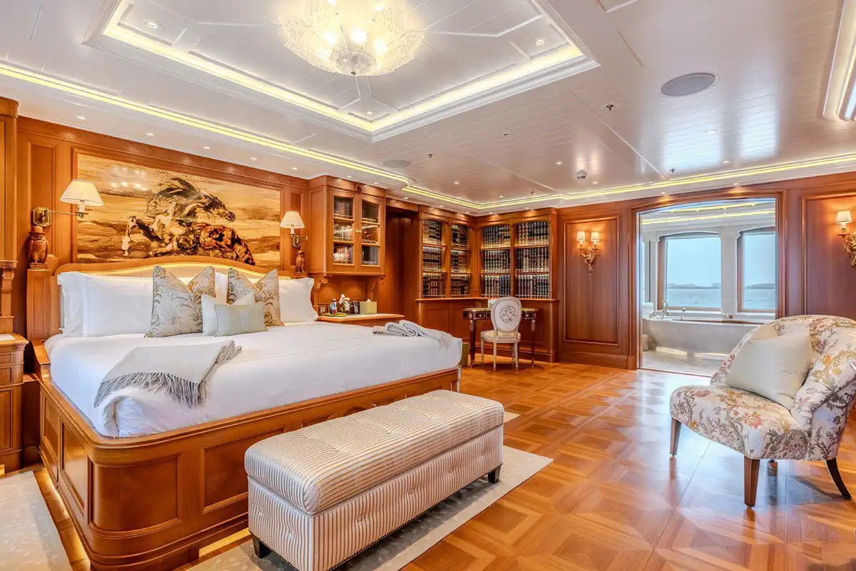 SEA OWL has seven themed cabins for up to 12 guests, including a full-beam master cabin with private study, three distinct VIP cabins, and additional cabins for children, nannies, or staff.