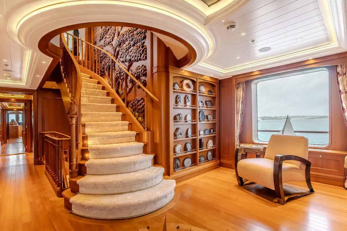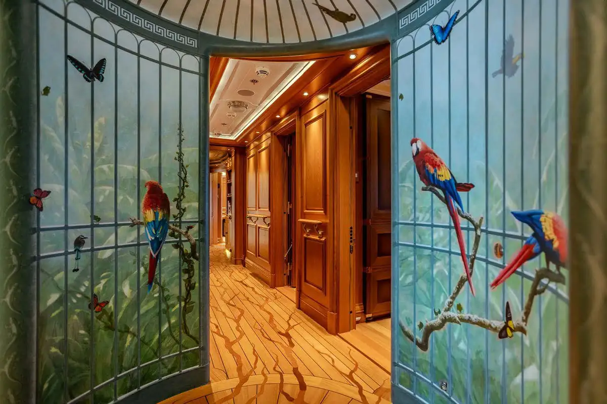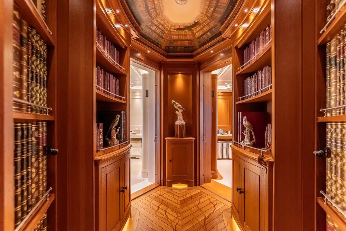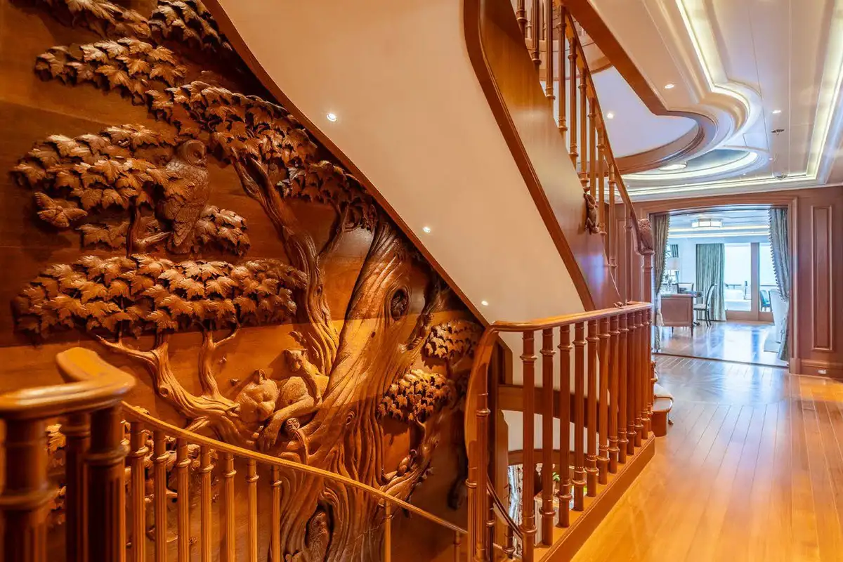 SEA OWL’s interior is a narrative in motion, enriched with handcrafted details that blur the line between fantasy and function. At the heart of the yacht is the breathtaking Tree of Life, a hand-carved Brazilian mahogany sculpture that adorns around the central staircase, guiding guests through her storybook-themed decks. The ceilings are embossed with antique maps, while a trompe l’oeil elevator adds yet another artistic flourish.