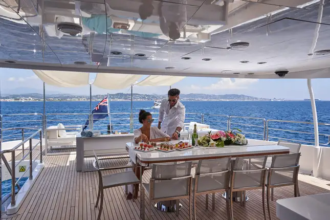 Take a trip ashore for a beach lunch organised by the crew on a quiet shore, with the talented chef tending the BBQ. With appetites satisfied, a relaxing afternoon on board awaits. The children are treated to a themed party in the sky lounge, with games, activities and films shown on the 65in flatscreen TV, accompanied by healthy snacks and juices made by the interior crew. Which leaves the grown-ups free to enjoy a peaceful afternoon on the sun deck with its jacuzzi and raised sun pads.