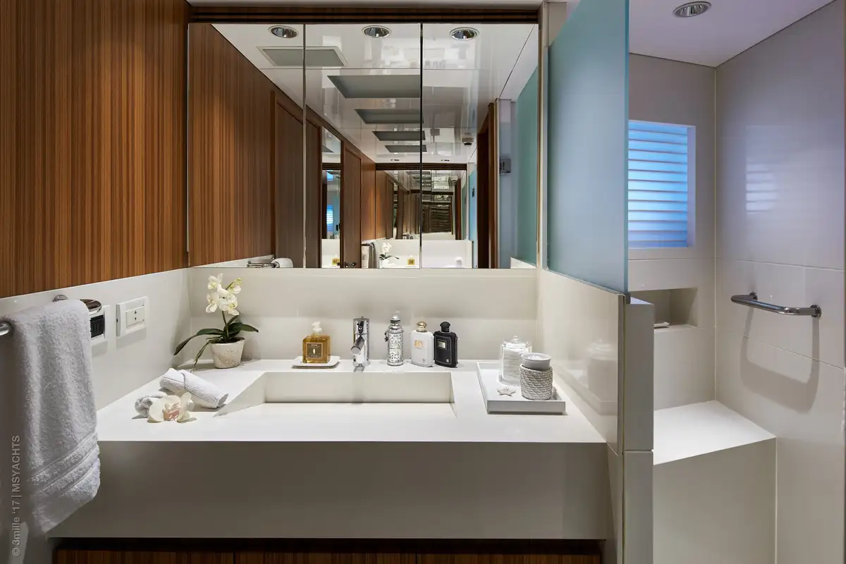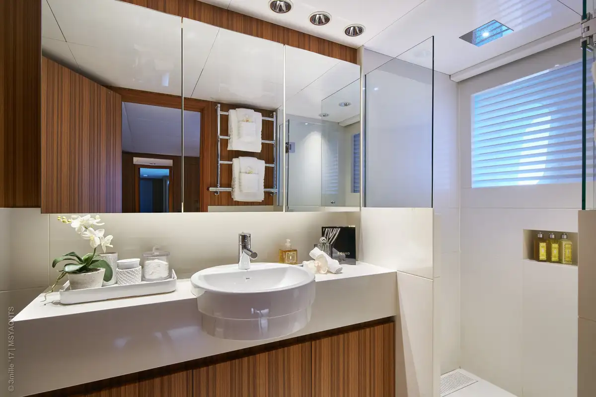The main deck lounge just a few steps away offers a sanctuary in which to catch up with friends or a good book on the large, inviting sofas. SEA SHELL’s immaculate modern interior blends warm woods, plush fabrics and lots of light to provide a calming yet luxurious mood.