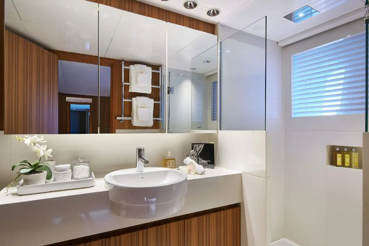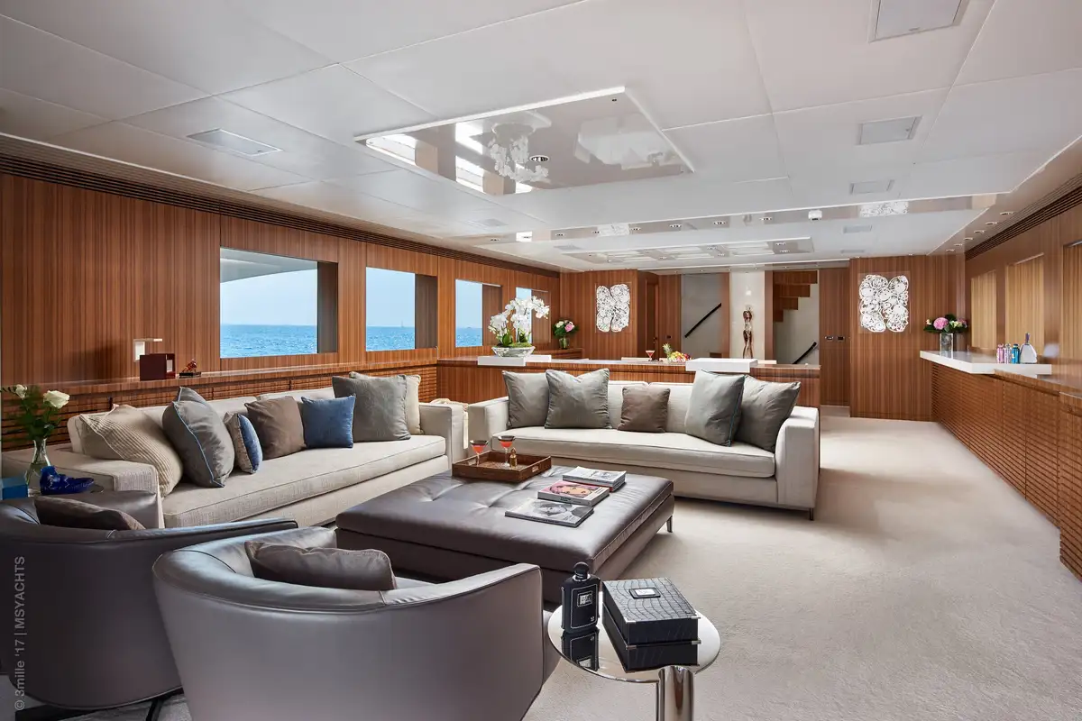 The main deck lounge just a few steps away offers a sanctuary in which to catch up with friends or a good book on the large, inviting sofas. SEA SHELL’s immaculate modern interior blends warm woods, plush fabrics and lots of light to provide a calming yet luxurious mood.