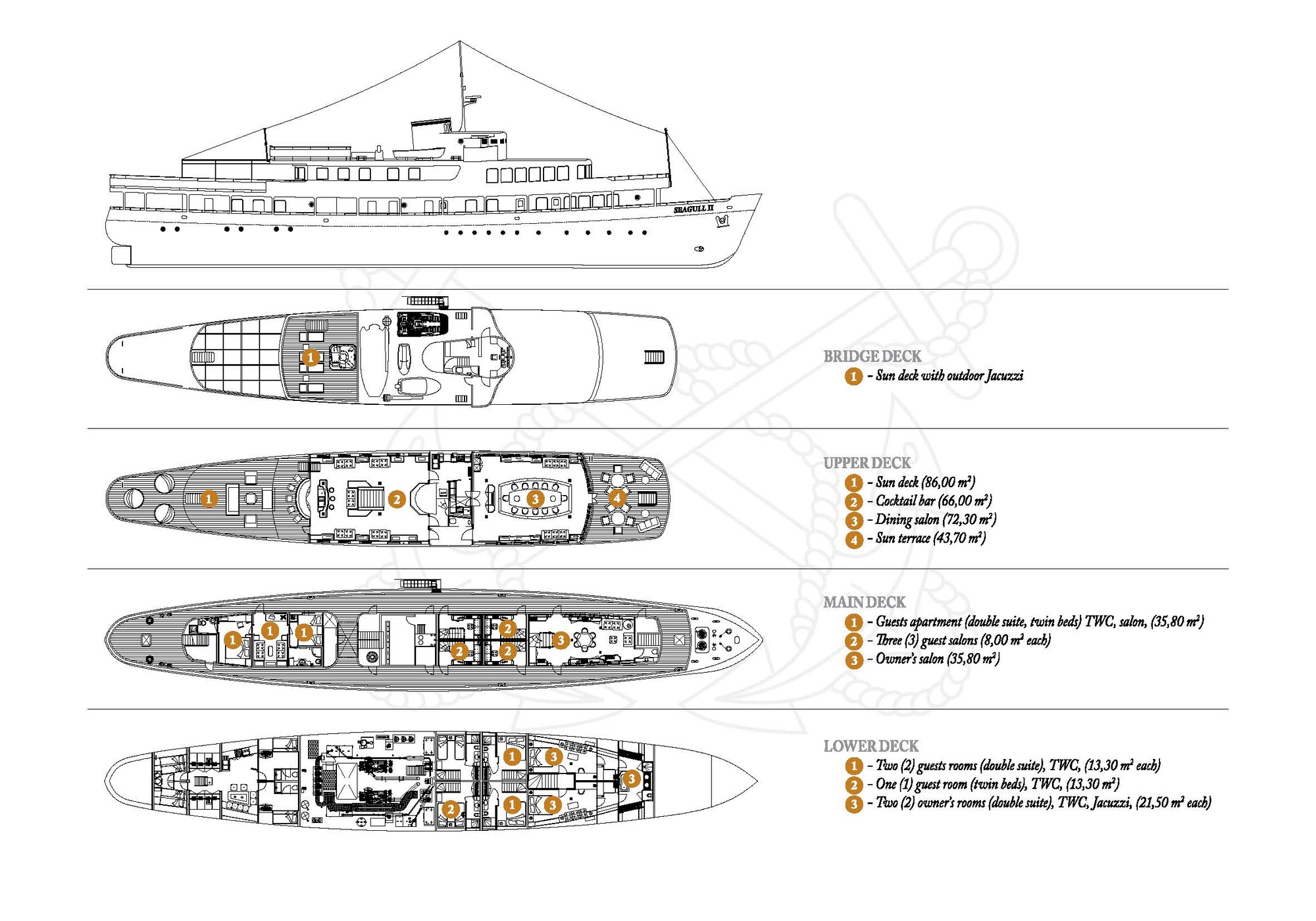 Located on the main deck is a very spacious double master area consisting of two staterooms, one with a luxurious King size bed and the other with two singles. Both staterooms offer en suite facilities. A relaxing saloon separates the staterooms. Moving onto the lower deck where the VIP stateroom is situated, guests will also find two staterooms with Queen size beds and a large shared bathroom with jacuzzi bath and shower. Further on three staterooms are located with two doubles with Queen size beds and one twin with two singles all with en suite facilities.