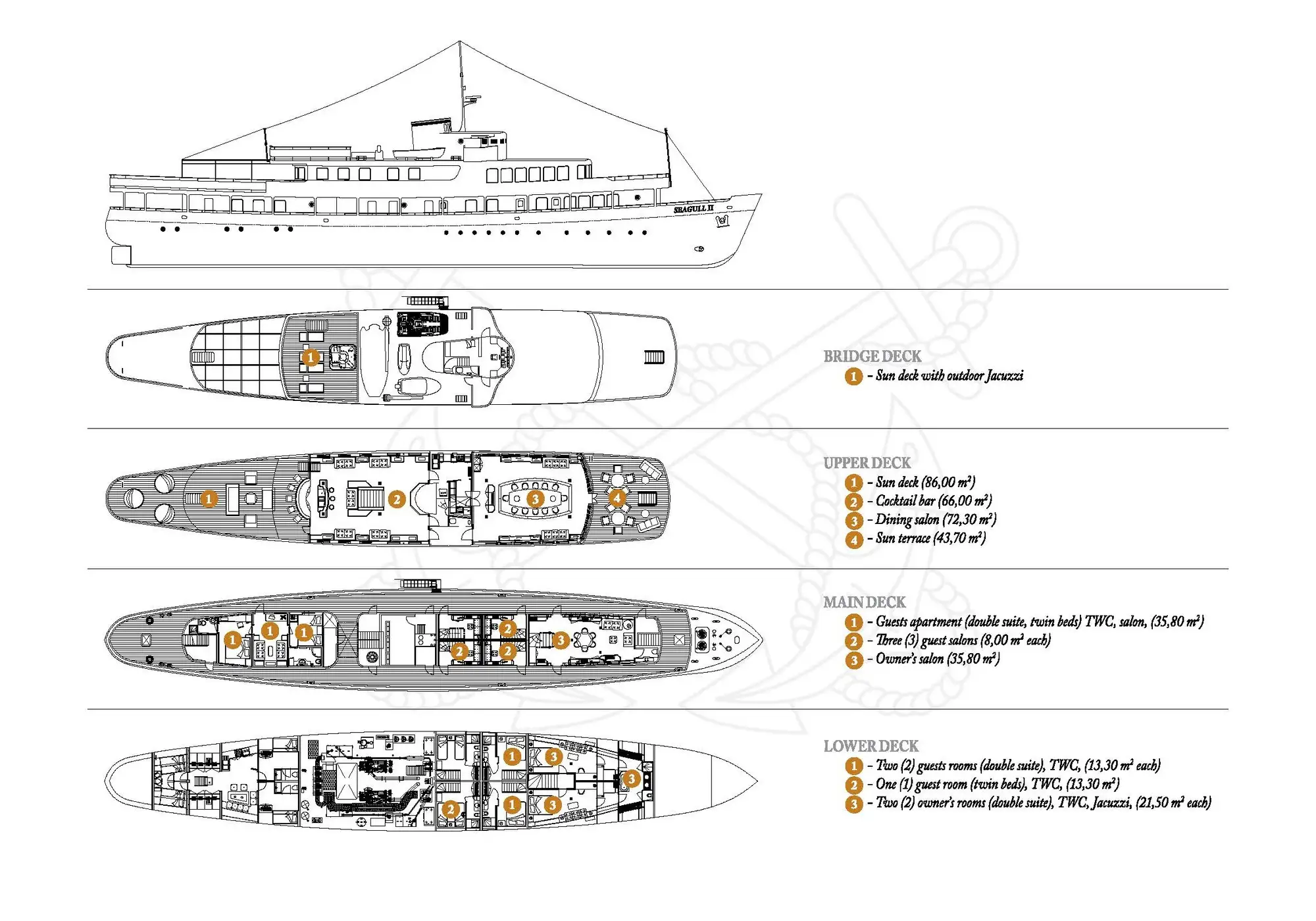 A beautifully classic yacht refitted to the highest standards and representing one of the best value 54m motor yachts on the market, SEAGULL II's impressive leisure and entertainment facilities make her the ideal charter yacht for family and friends, with the option of 5 doubles and 2 twin staterooms.