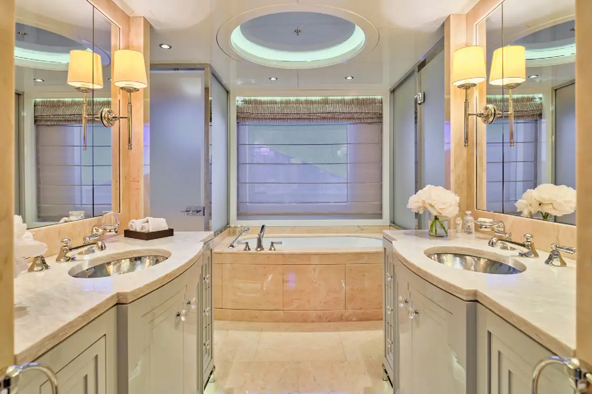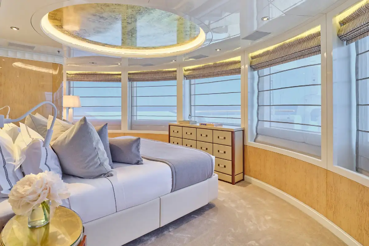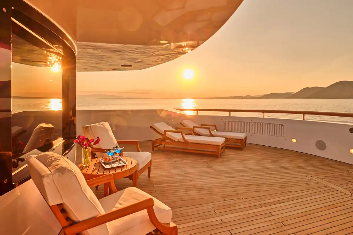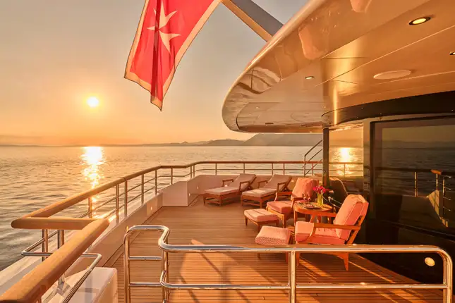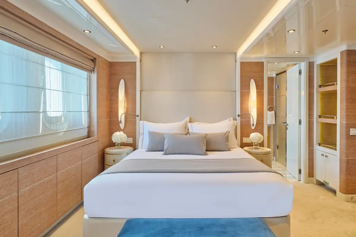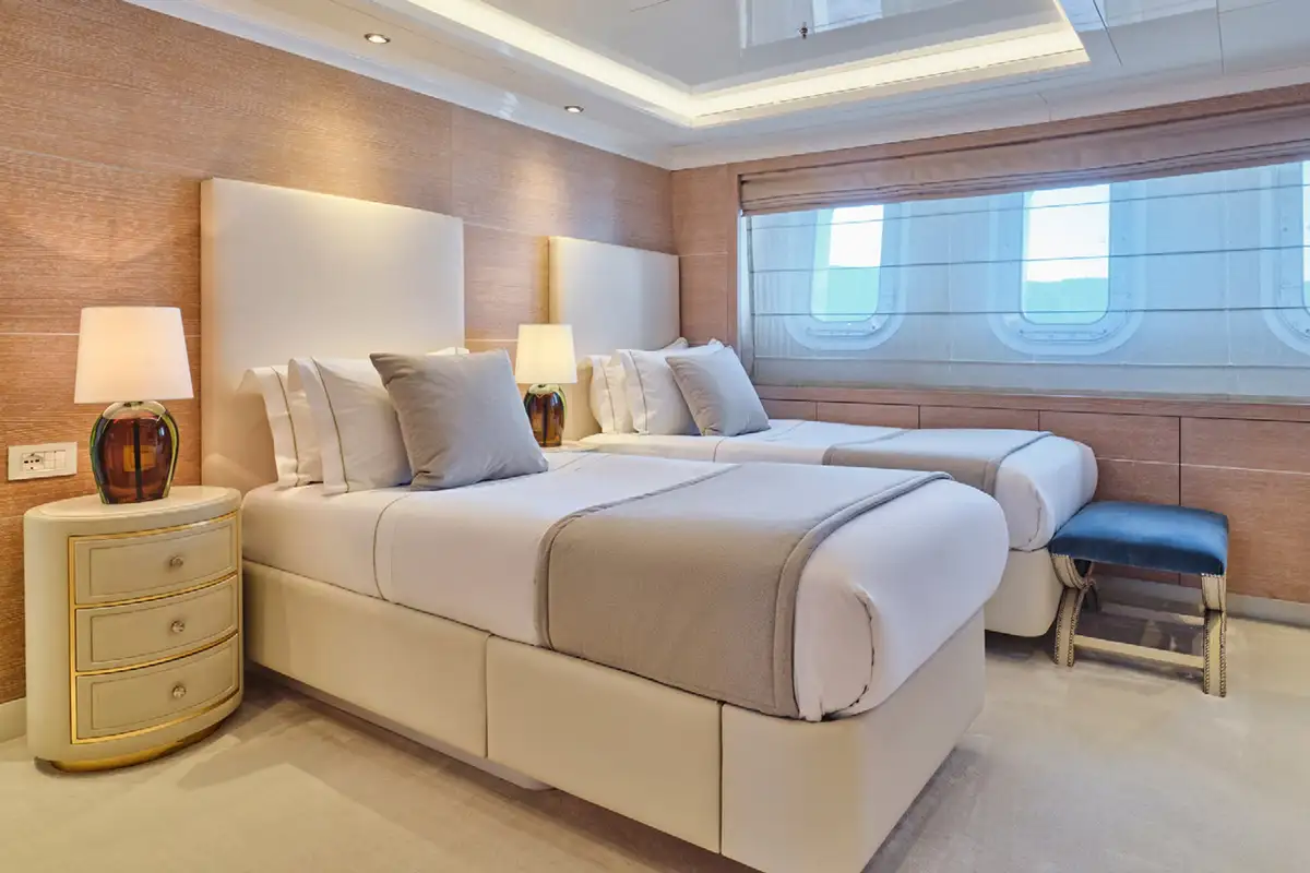 Accommodation is thoughtfully arranged for up to 12 guests across six beautifully appointed cabins. The highlight is a private owner’s deck featuring two master suites, each with sweeping panoramic views. The lower deck comprises two spacious double cabins and two twins, all with en suite bathrooms and finished to an exceptional standard.