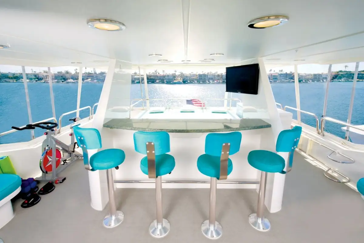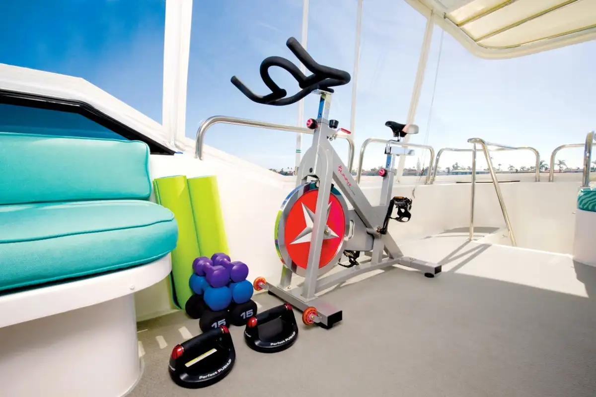 One deck up, the bridge deck offers a jacuzzi and a partially shaded L-shaped seating area. Taking the stairs up to the sun deck, guests can admire the sea views or sunbathe on the sun pads. This deck is the perfect al fresco party spot with a central bar and four stools, BBQ and TV. For those wishing to keep to their fitness regime, this deck doubles as an outdoor gym with access to a spin bike, yoga mats, free weights and a TRX system.