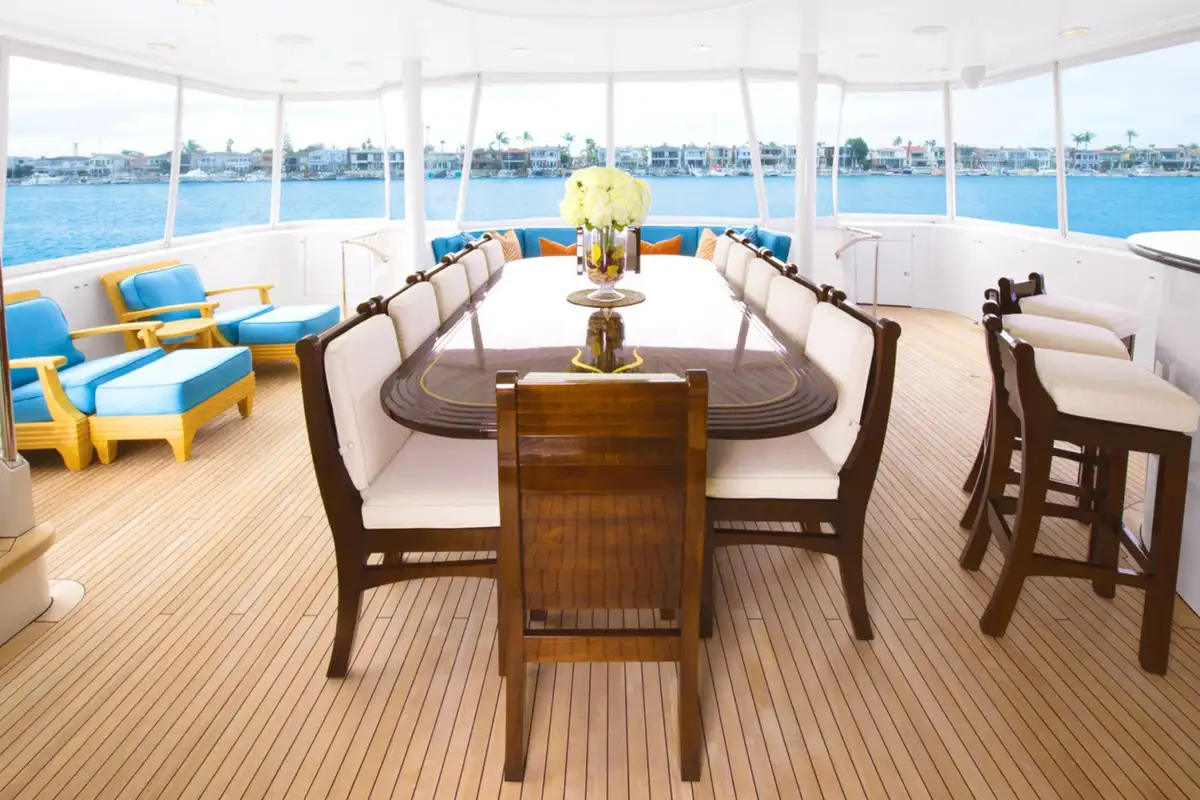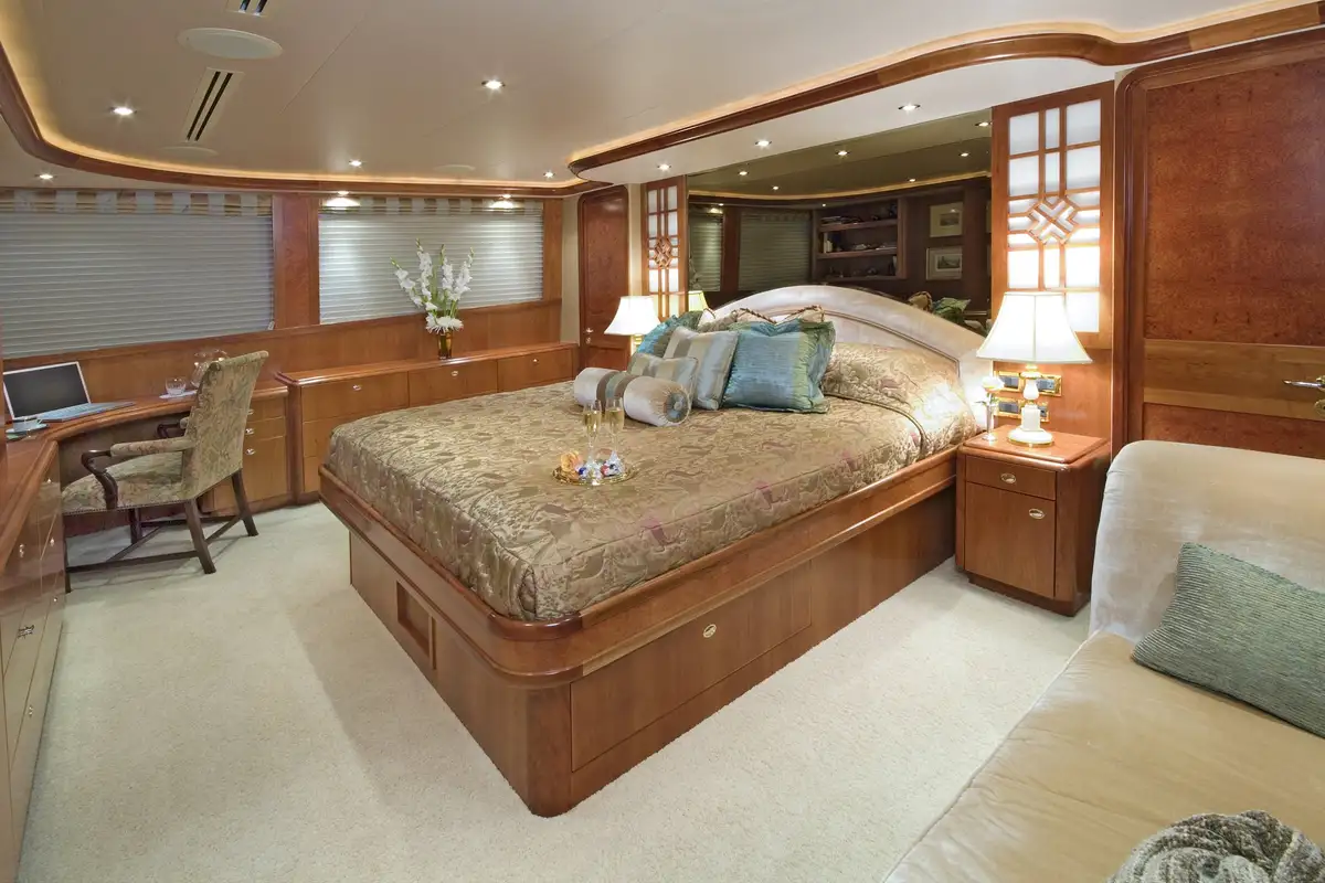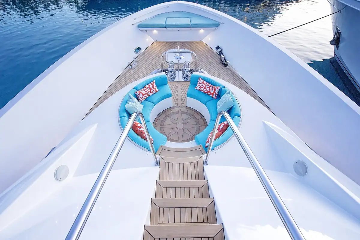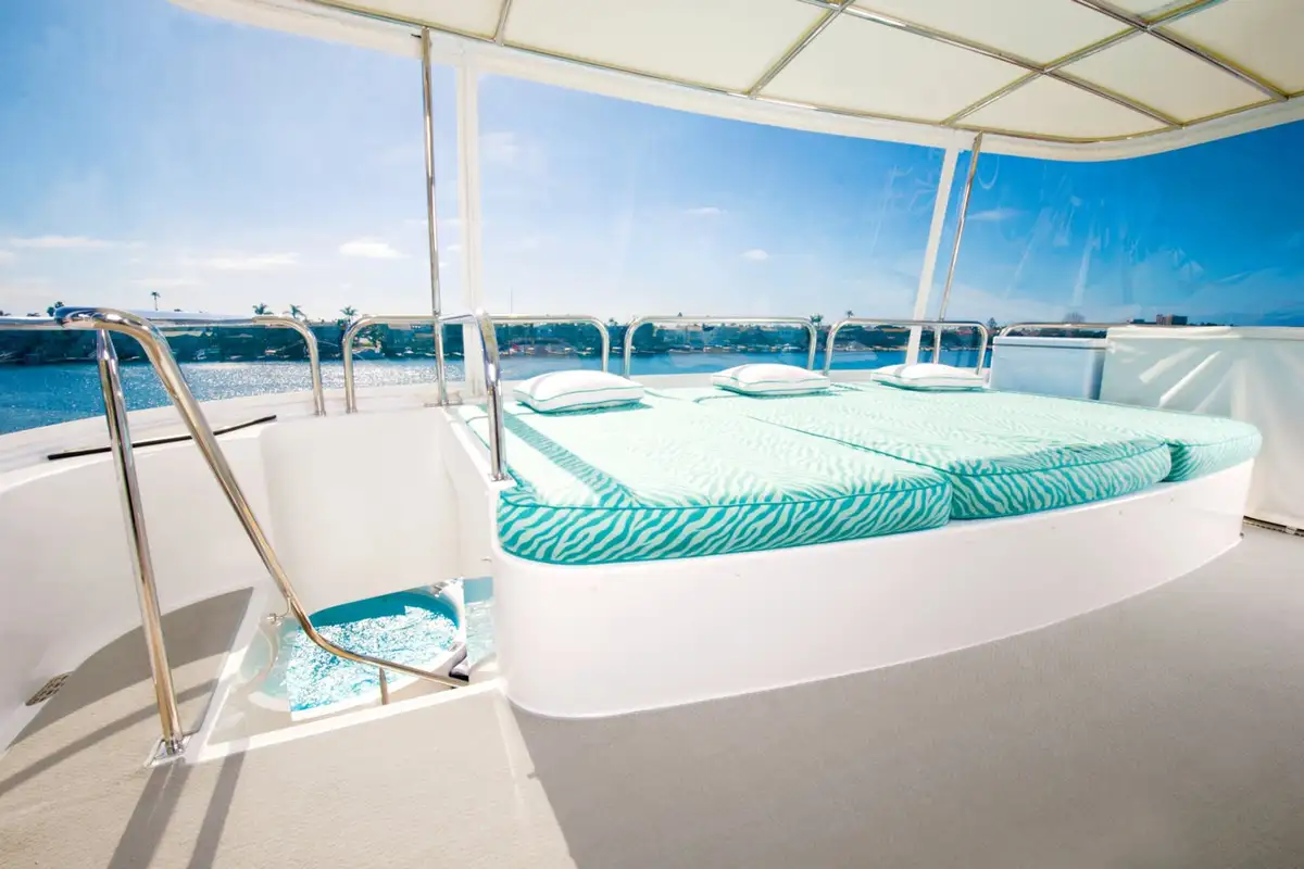 Arrive on the spacious main deck where a dedicated crew of seven welcomes you. The entire main deck and flybridge can convert into a climate controlled enclosed space without losing the views. There is a dining table for up to 12 and surrounding sofas, a sit-up bar and outdoor TV. Full walkaround decks are perfect for whale watching and lead you to another seating area at the bow.