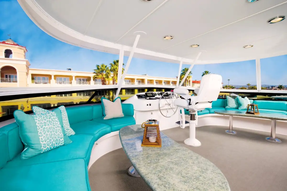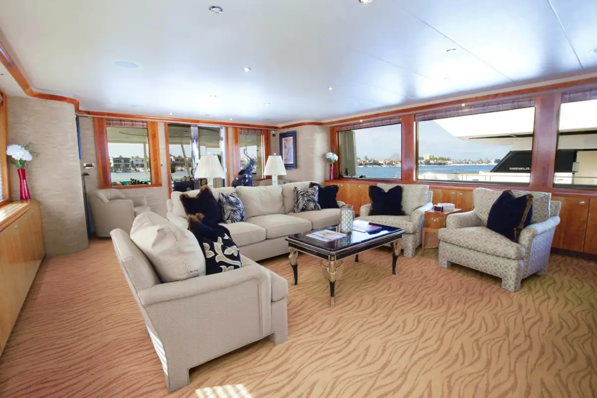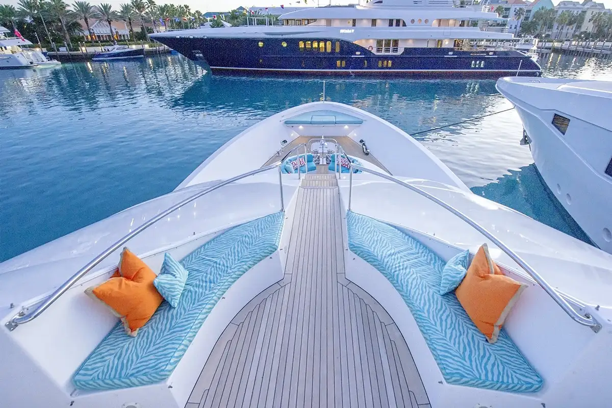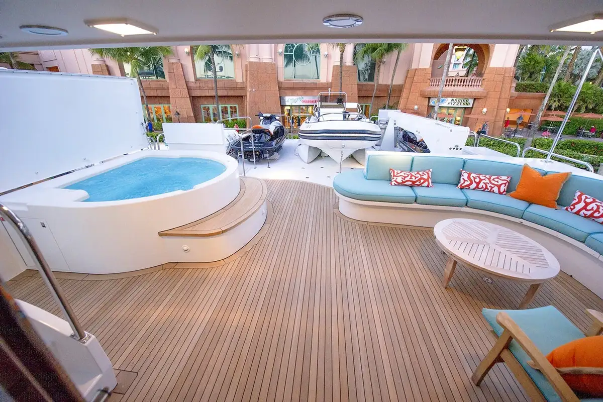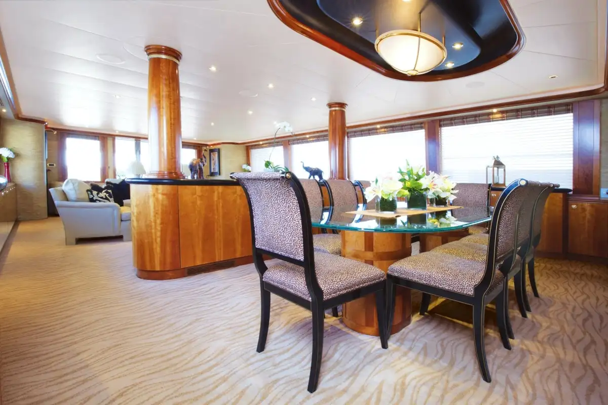 Arrive on the spacious main deck where a dedicated crew of seven welcomes you. The entire main deck and flybridge can convert into a climate controlled enclosed space without losing the views. There is a dining table for up to 12 and surrounding sofas, a sit-up bar and outdoor TV. Full walkaround decks are perfect for whale watching and lead you to another seating area at the bow.