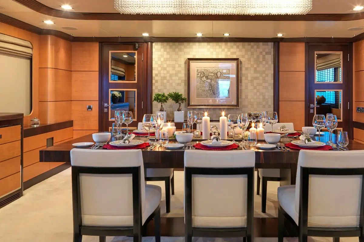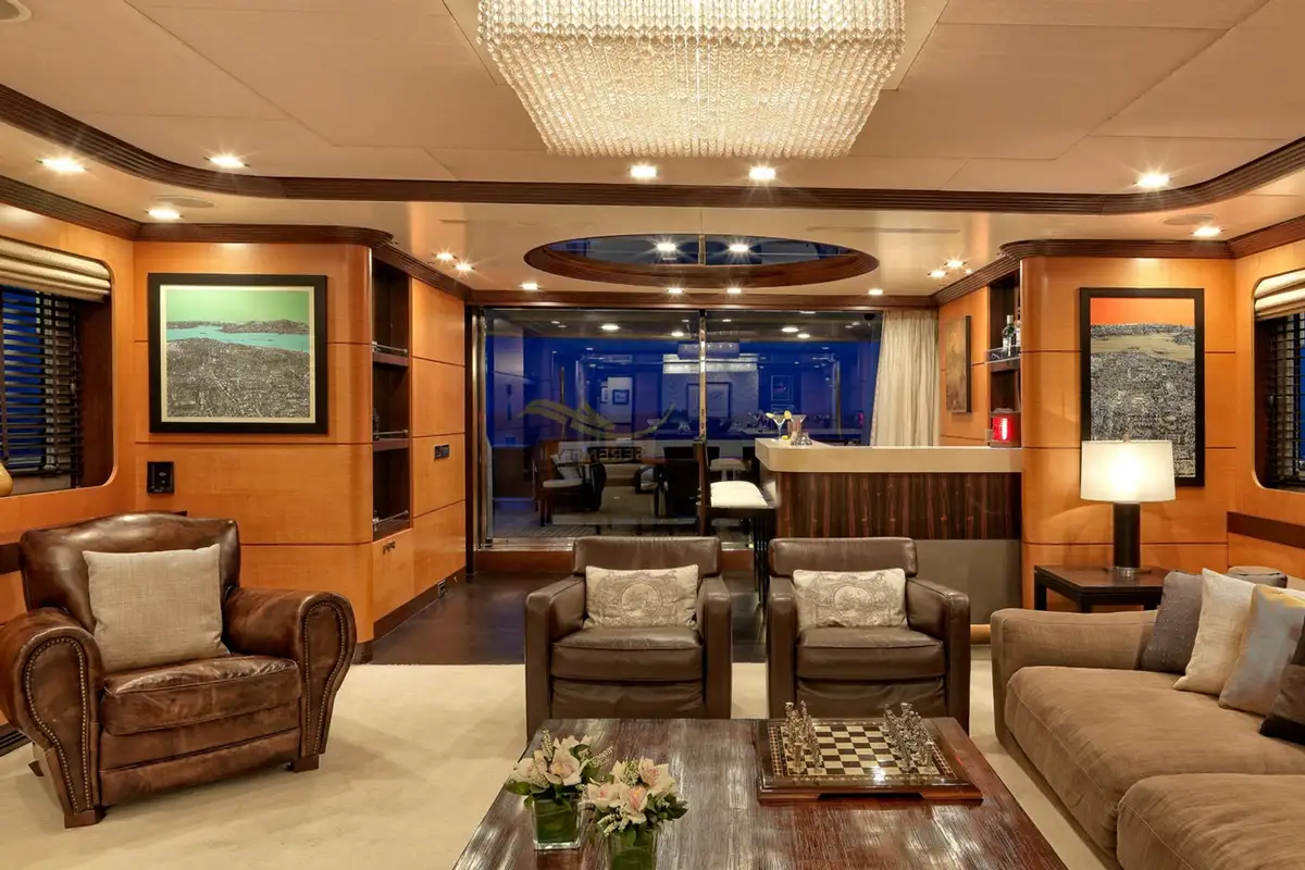 Également disponible à la venteHer open-plan main salon is an expansive space with impressive full beam windows and featuring a range of exotic woods and custom furniture. The perfect hub for relaxing and entertaining the main salon features a large bar, lounge seating area and a full formal dining.