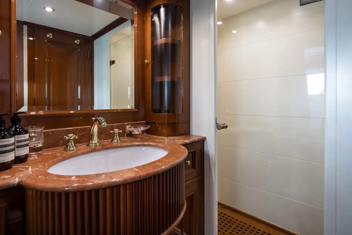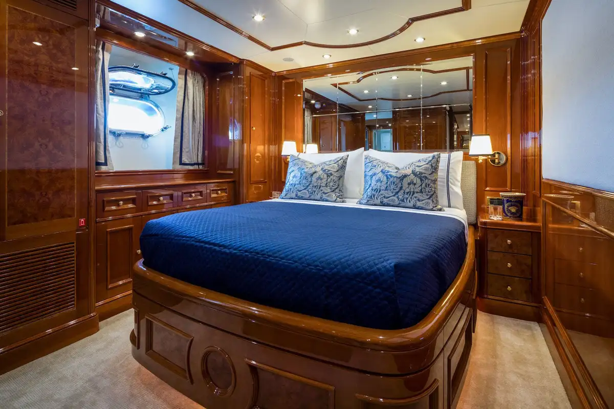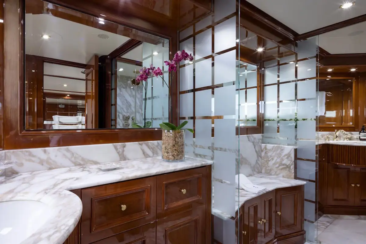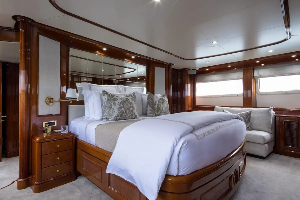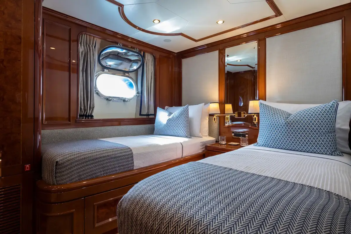 SERENO accommodates up to 11 guests across five spacious cabins, with a full-beam master suite on the upper deck, complete with a dressing room and separate his-and-hers bathrooms. The remaining accommodation – two VIP cabins and two twins, one with a pullman berth – can be found on the lower deck and are equally refined and inviting.