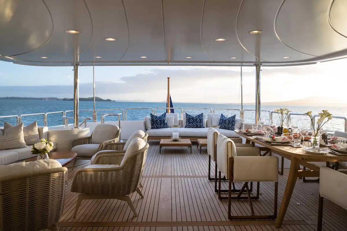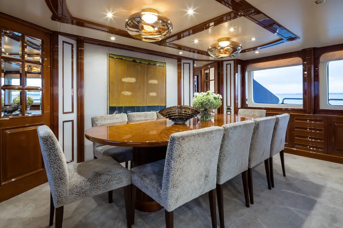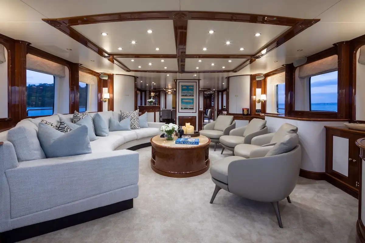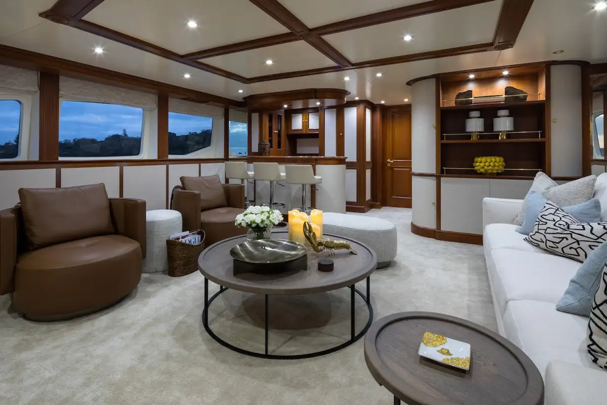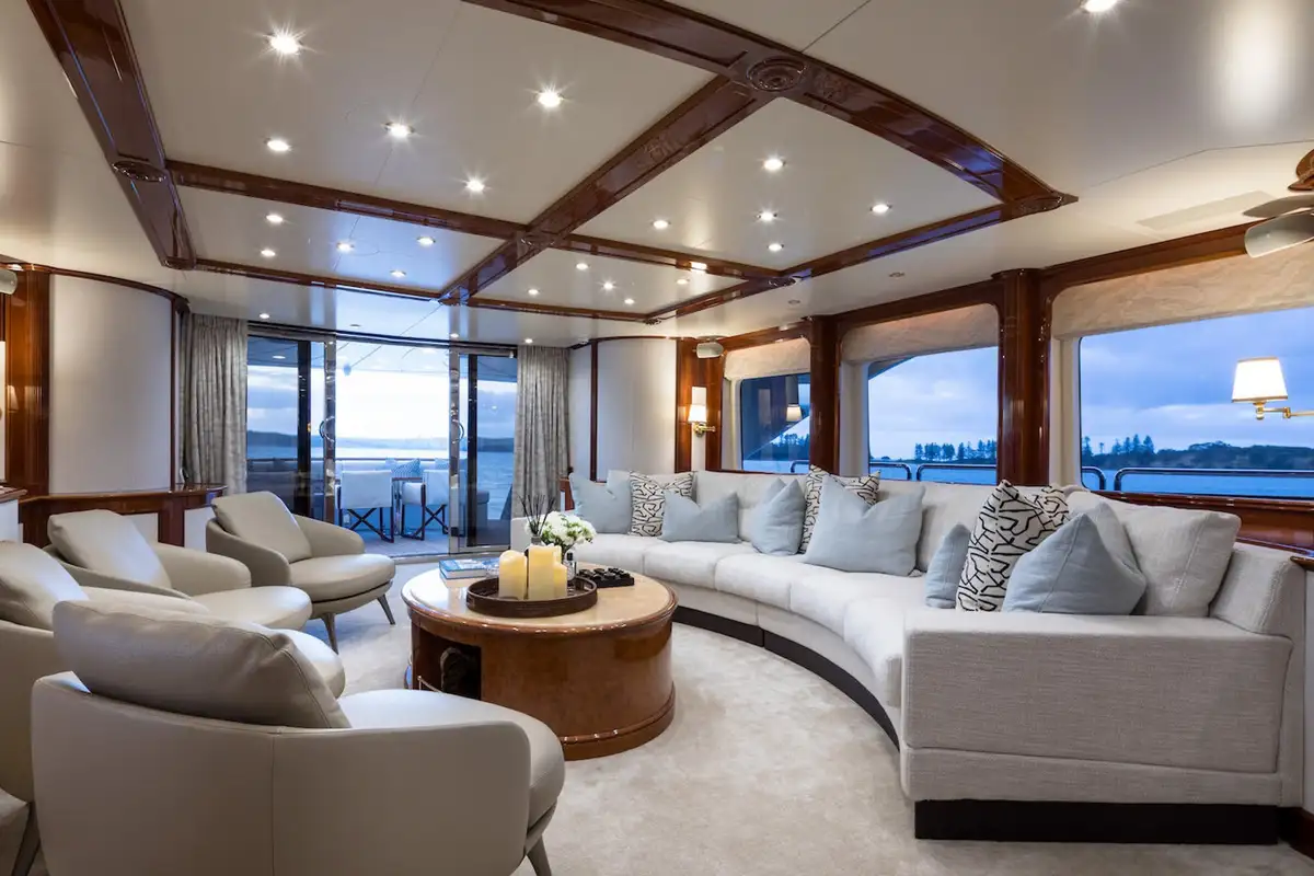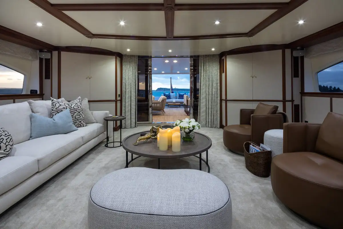 Inside, timeless Italian design meets contemporary comfort. The main deck lounge features cushioned sofas, a bar, and dining area, all with panoramic windows which bring the outside in and flood the space with light.