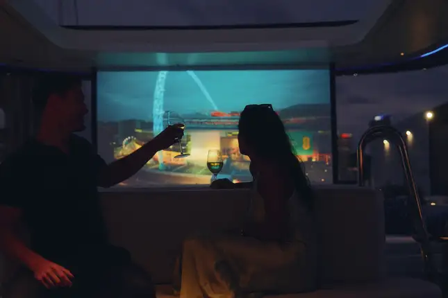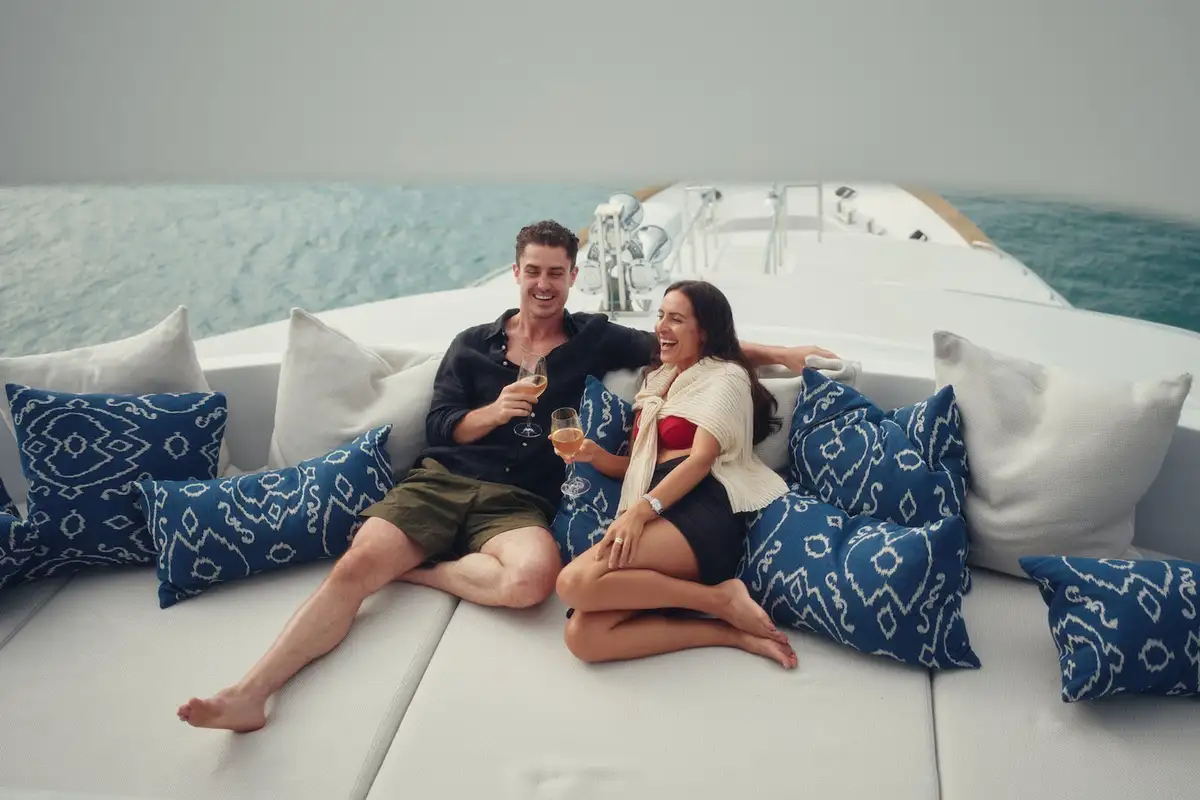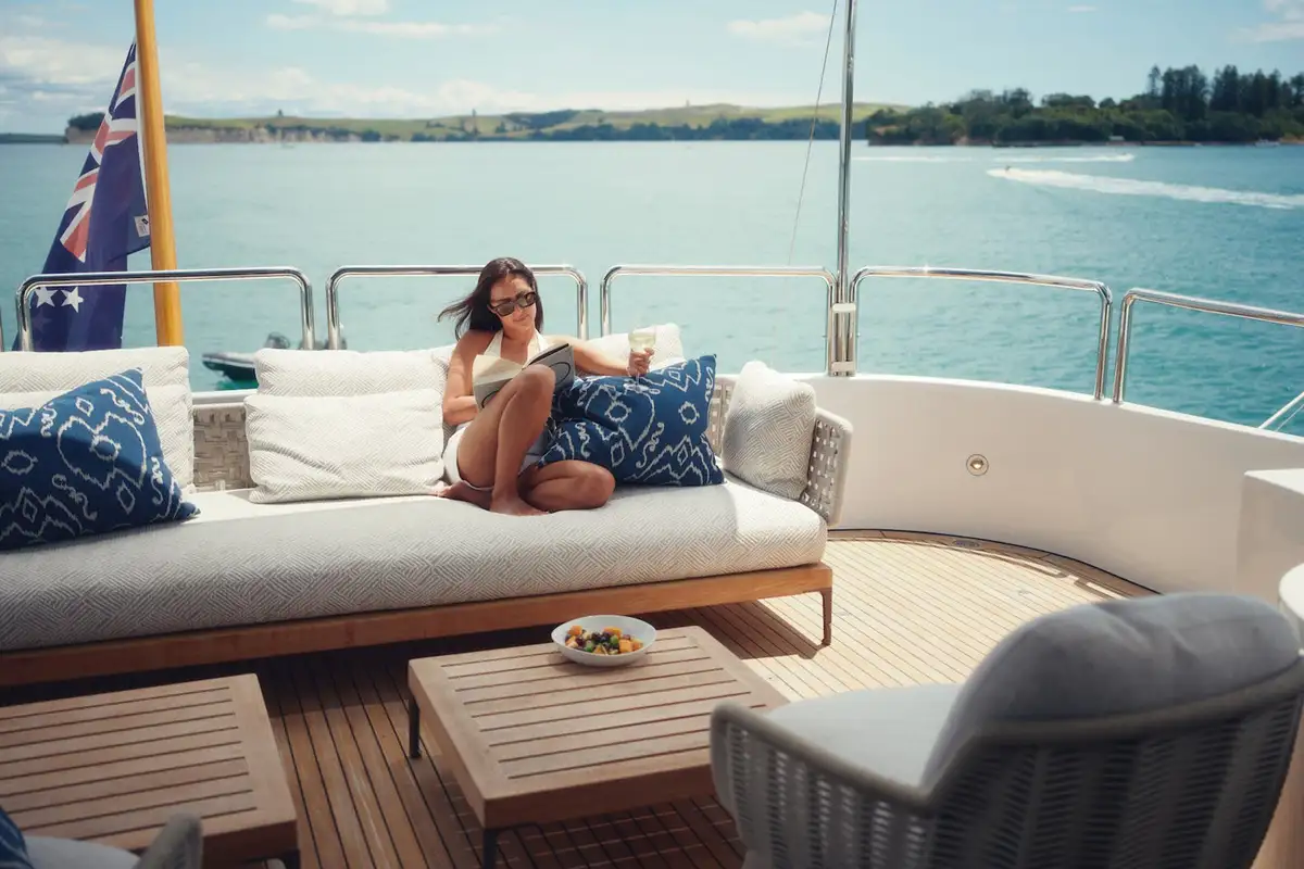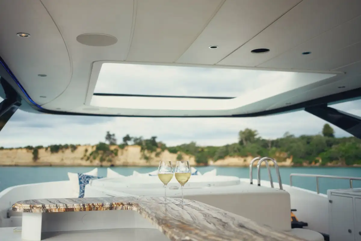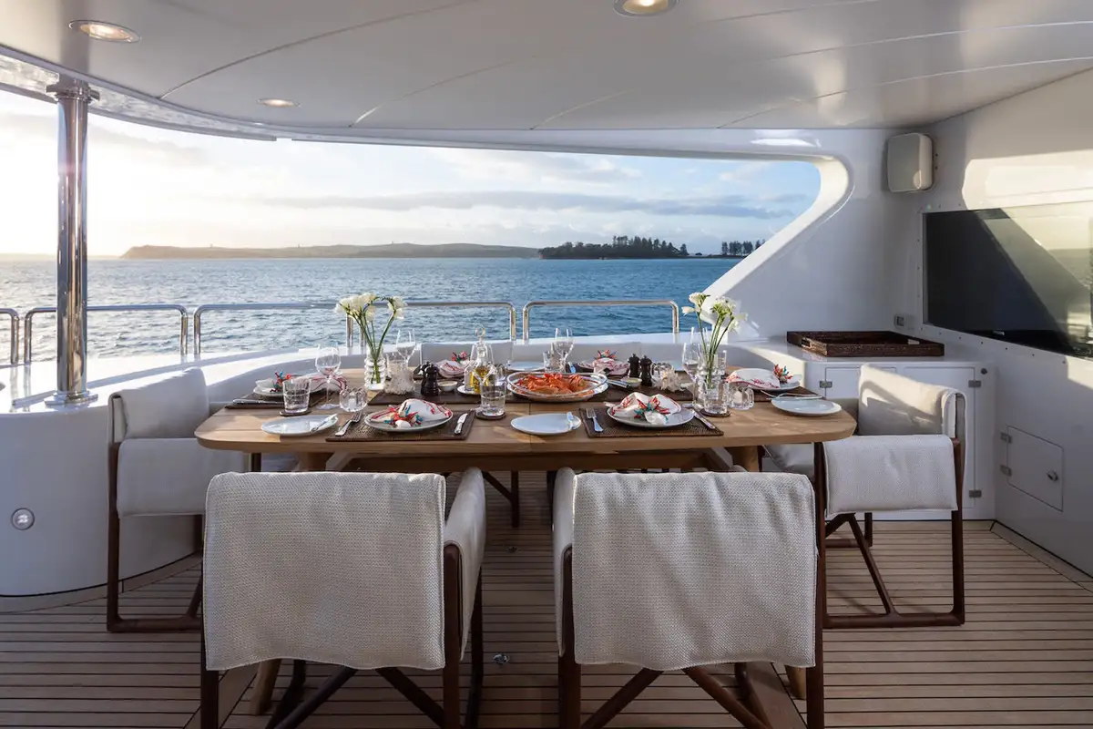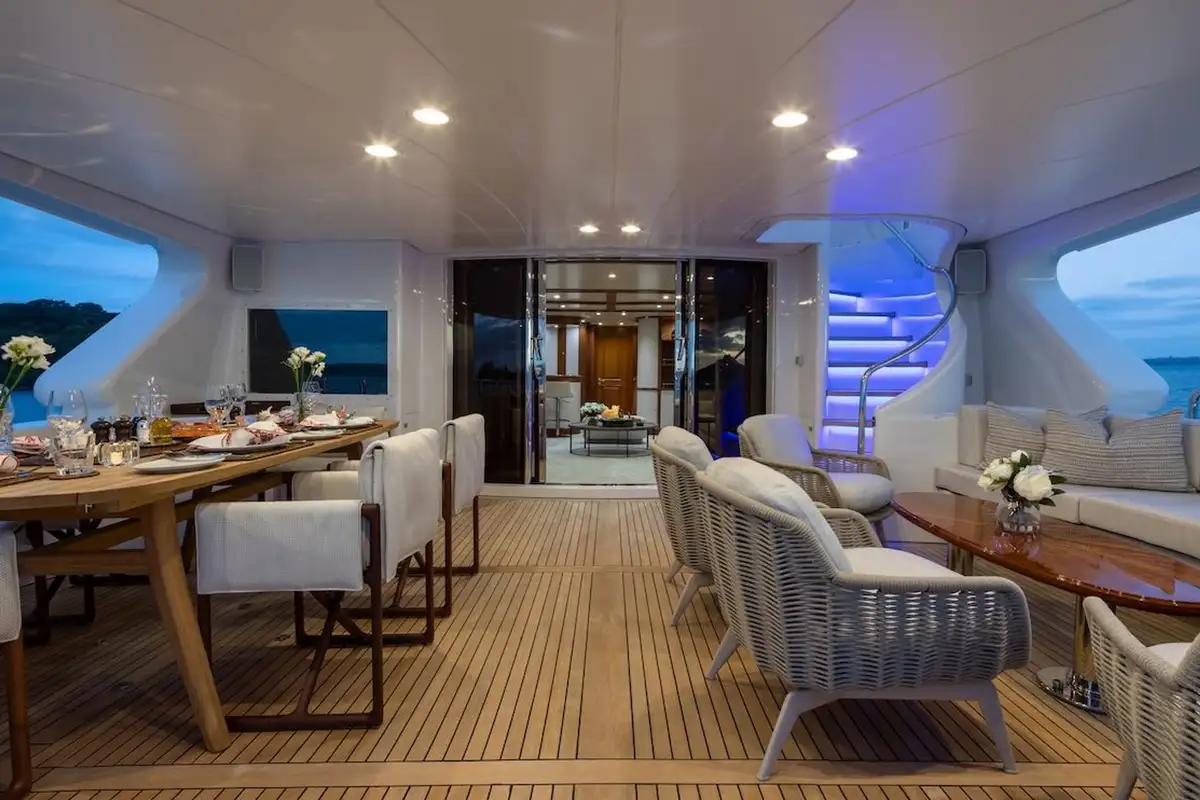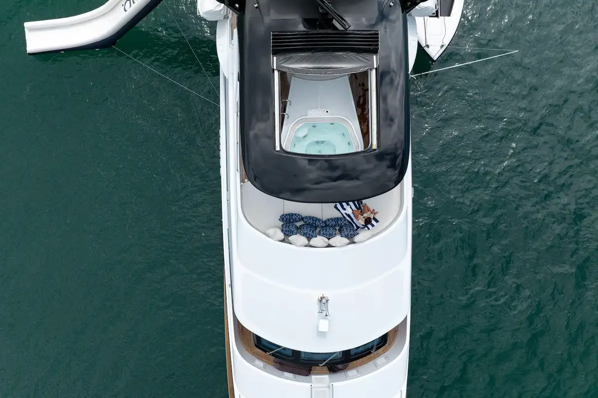 The sun deck is the standout space, with a jacuzzi, large sunpads, and multiple seating areas for relaxation, light bites, and drinks. The new bimini provides shade during the day, while a drop-down screen and protector create the perfect setting for outdoor movie nights. Elsewhere, both the main and upper decks feature dedicated dining areas aft, ideal for relaxed lunches or elegant dinners with a view.