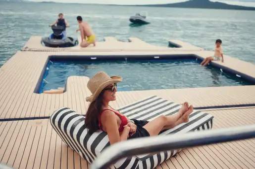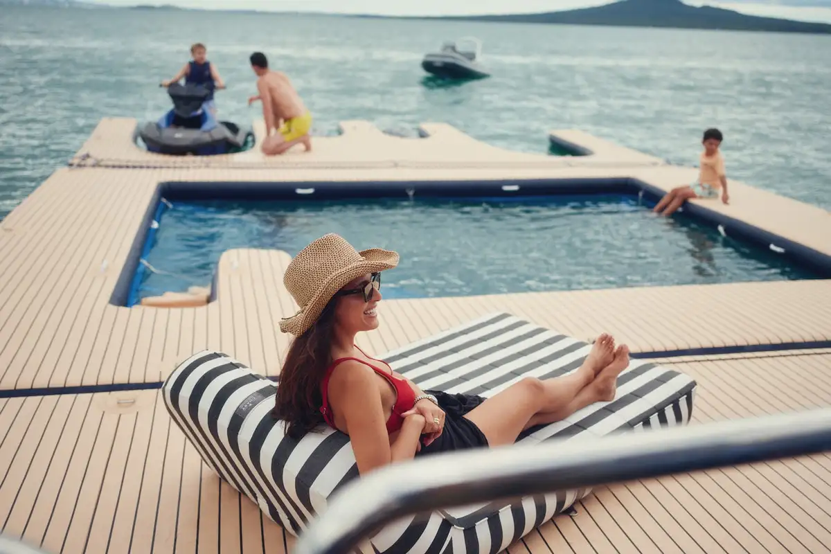 - Large inflatable swim platform with a netted sea pool (8x5m) and jetski docking