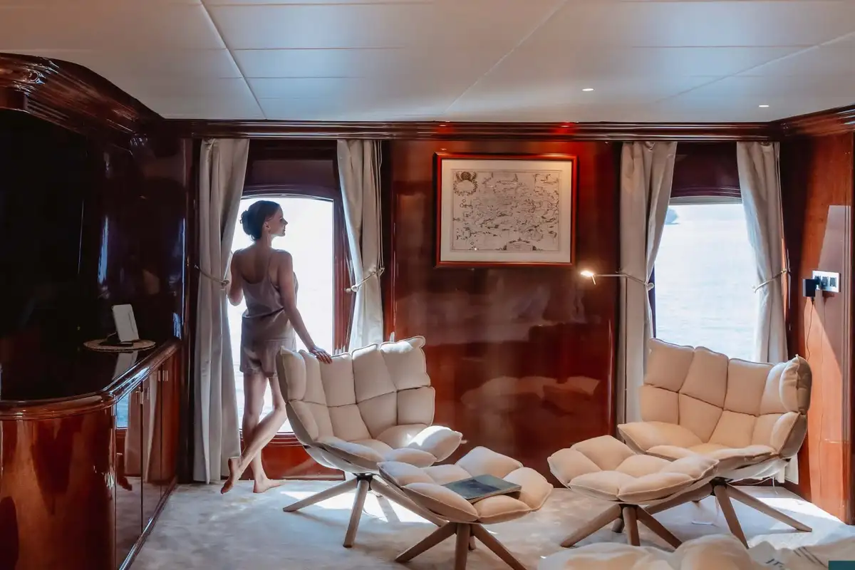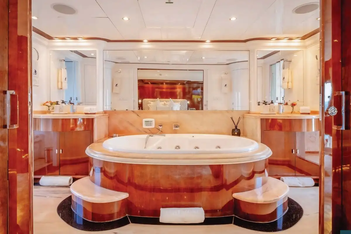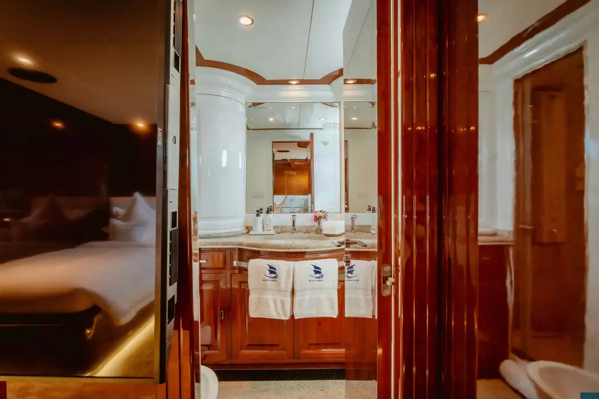 Unwind in luxury within SILENTWORLD's lavish suites. These offer versatile sleeping arrangements and include a main deck master suite, a bridge deck double VIP suite, and two double suites and two twin-berth cabins on the lower deck.