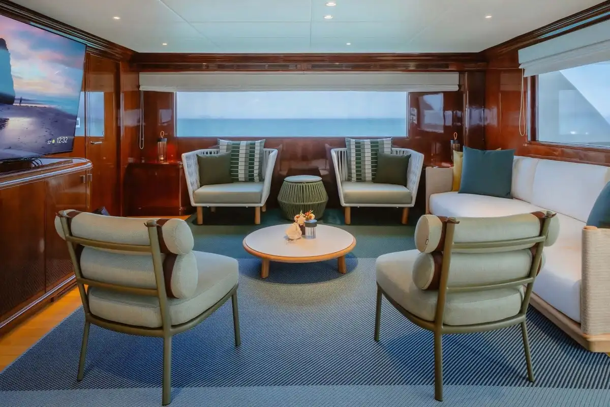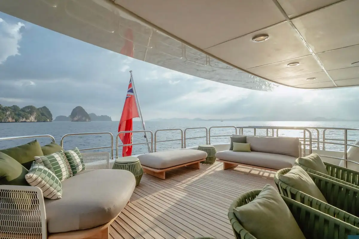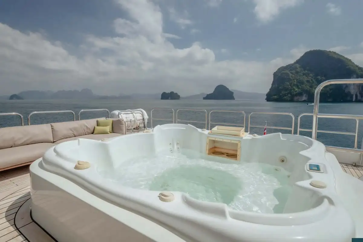 Escape to the tranquillity of the bridge deck to unwind in the sky lounge, complete with a wet bar area, lounge and office space, or ascend to the sun deck and bask in the luxurious surroundings of the al fresco dining and lounge area, where tables can be lowered to create expansive sunpads. Relax in the raised jacuzzi or enjoy forward-facing seating behind the shelter of a windscreen, all while taking in panoramic views of your stunning surroundings.
