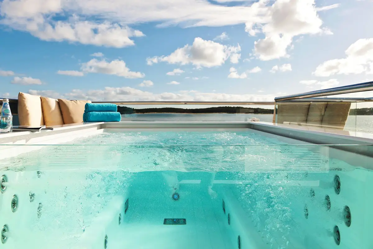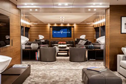 The spacious sea level 'beach club' on SILVER FAST has been expanded to allow for more gym equipment in the comprehensive spa facility with customised sauna, hot steam room, massage room and beauty salon. On the sun deck, the mirrored bar front converts into a TV to allow movies to be viewed from the glass-fronted eight-person jacuzzi.