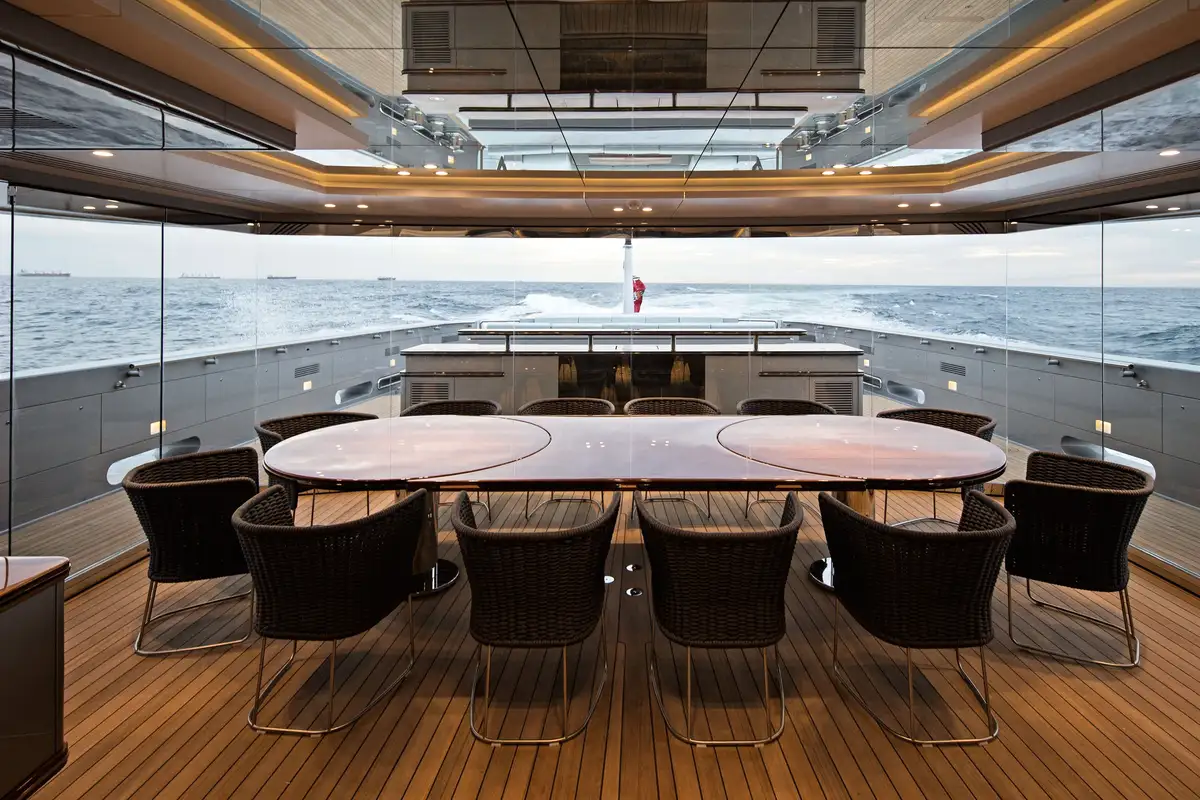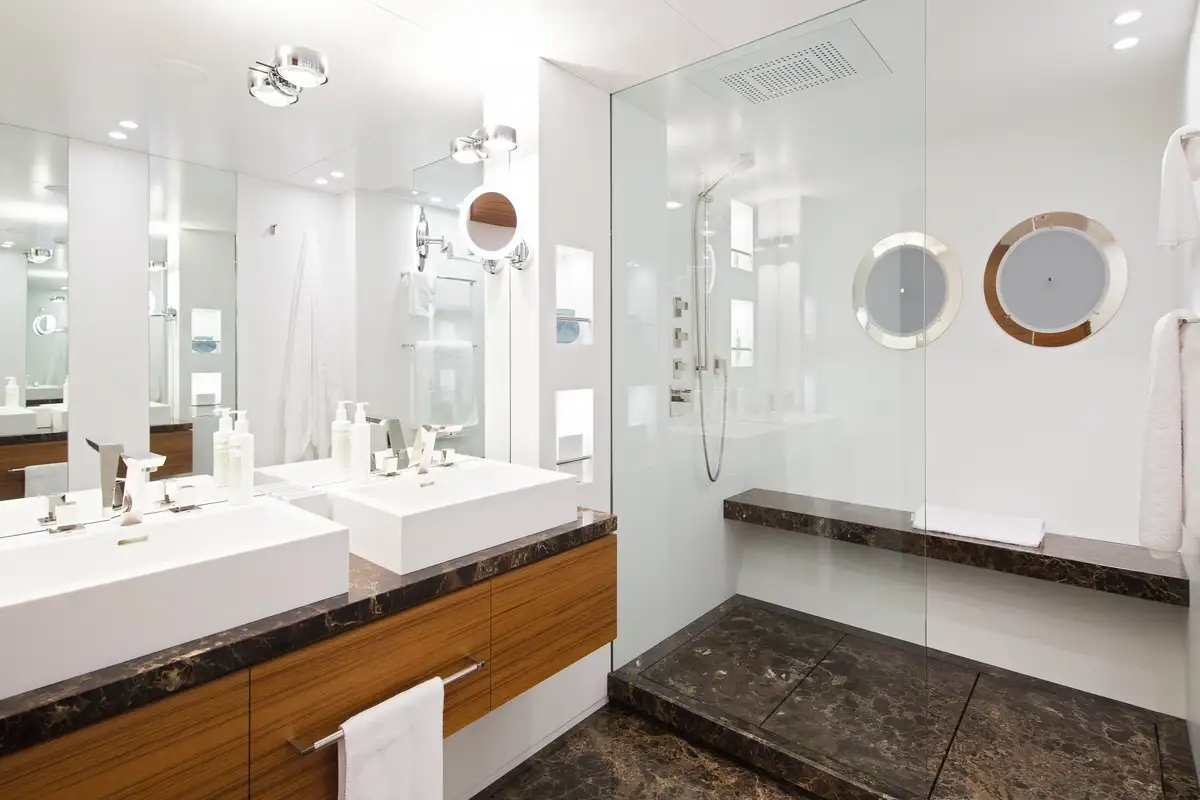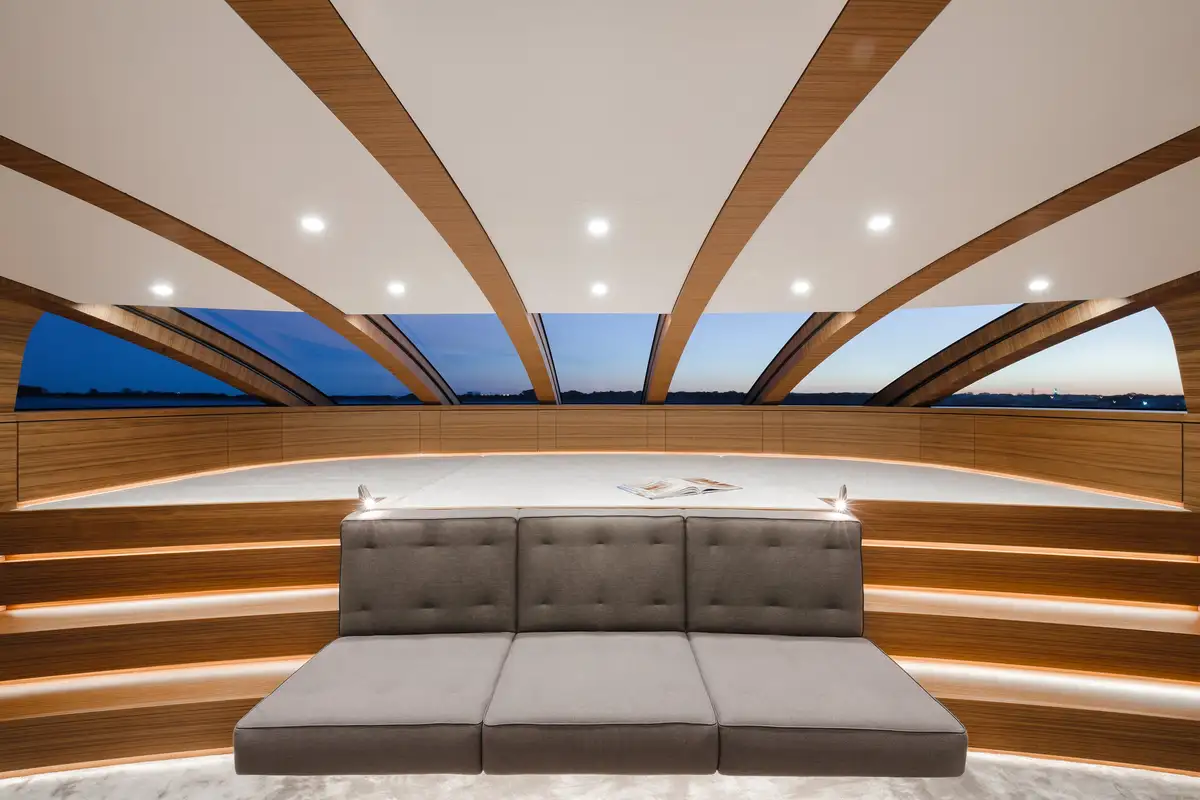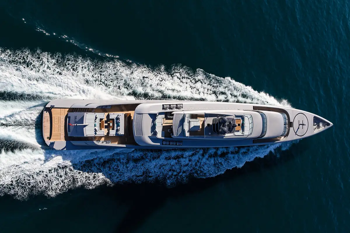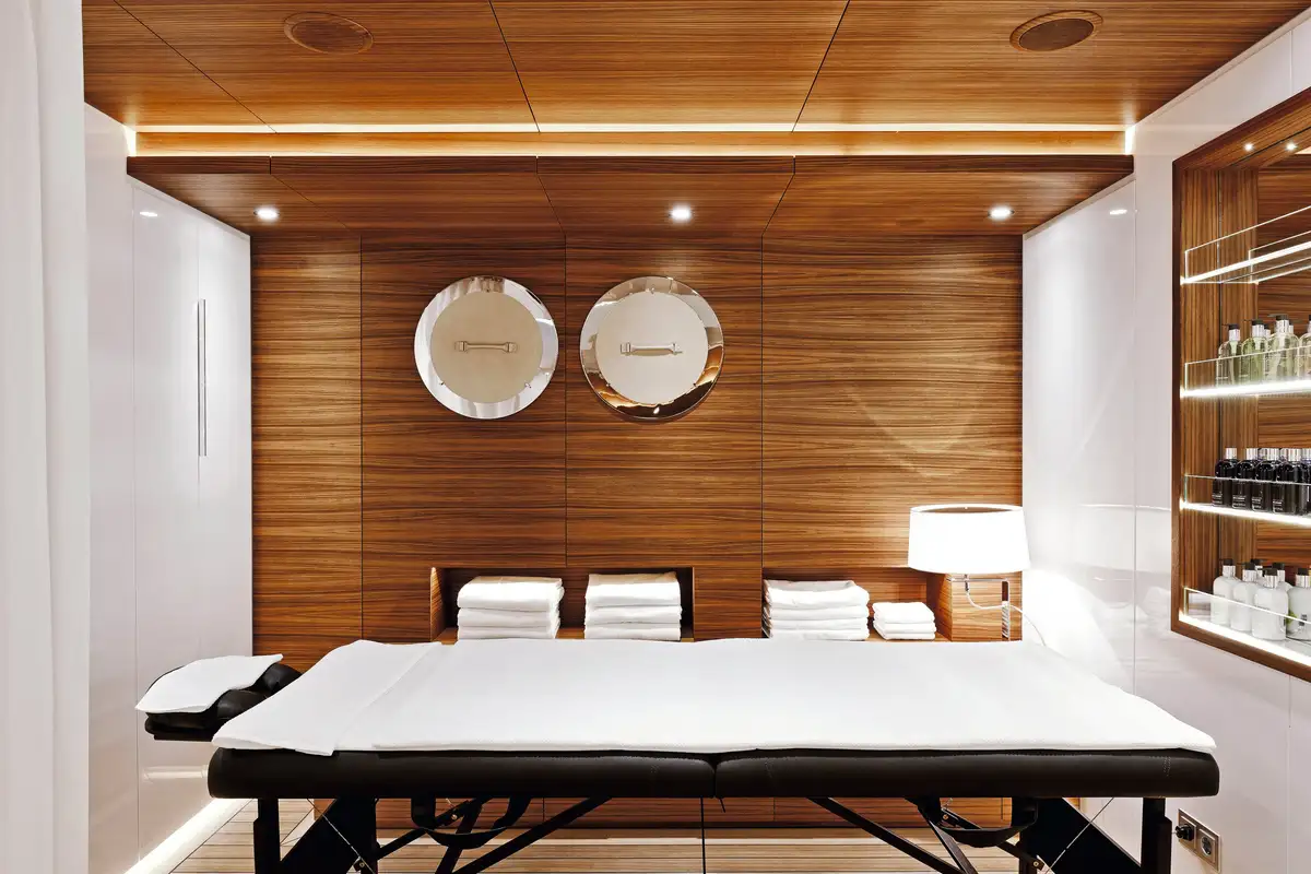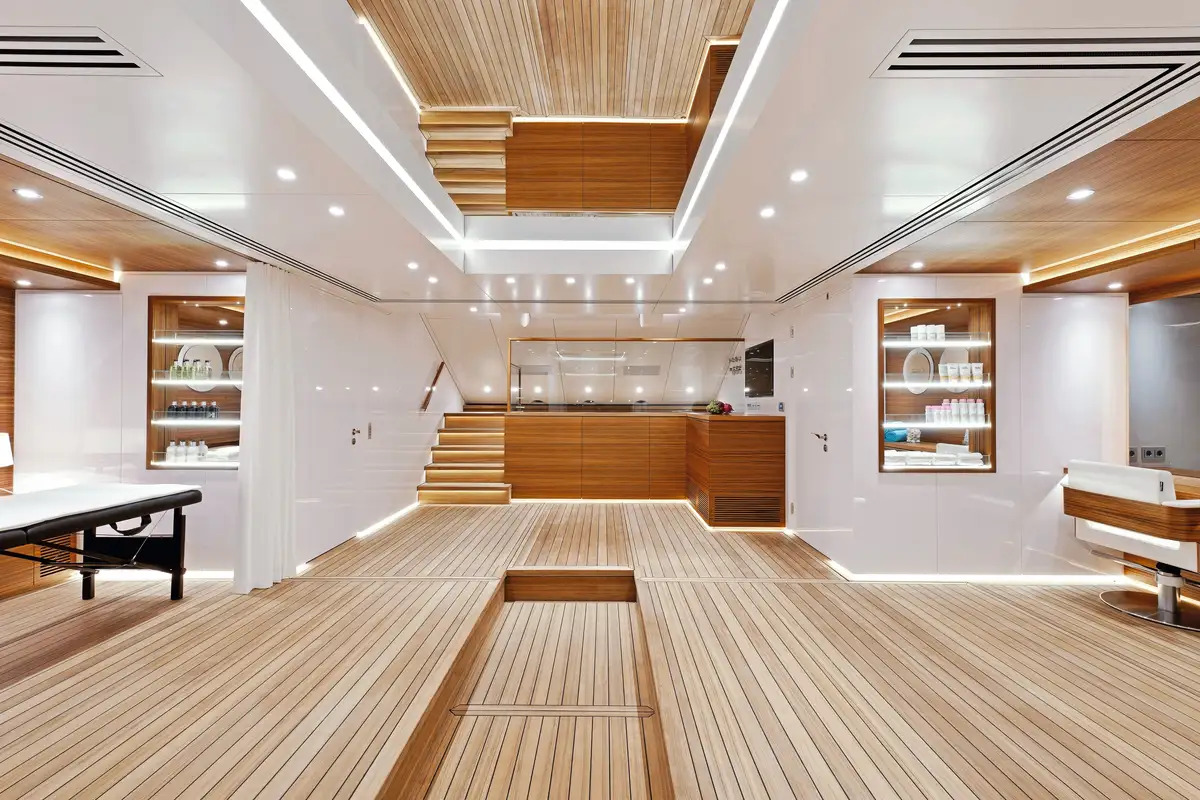 - Touch down pad to foredeck, Spa with sauna and steam room, Beach club with, Gym equipment, Approved RYA training centre, Steam shower in master suite