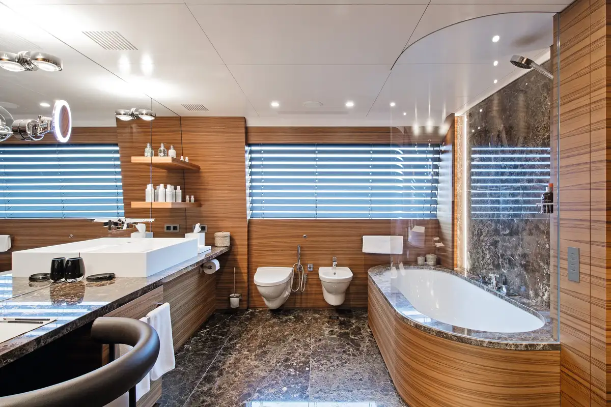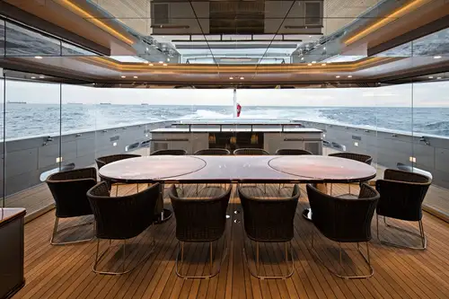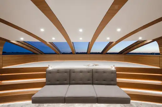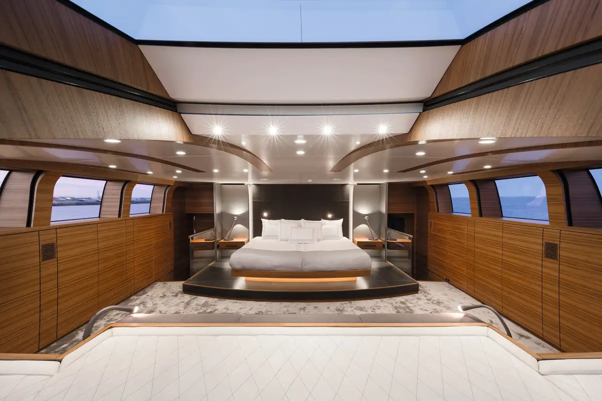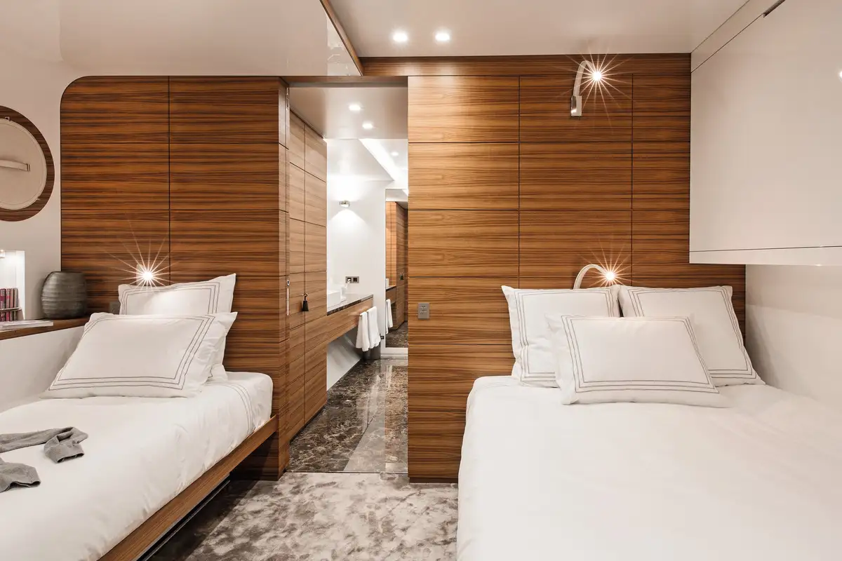 The entire upper deck is reserved for the owner's apartment which features the master suite with centreline double bed, his and hers bathrooms and walk-in wardrobe forward. Further aft there is an office and large saloon leading to the owner's 'outdoor retreat' - a secluded private deck area. Guest accommodation is configured across seven further cabins: three VIP suites are located forward on the main deck, and four guest cabins (one double, three twins) are amidships on the lower deck.