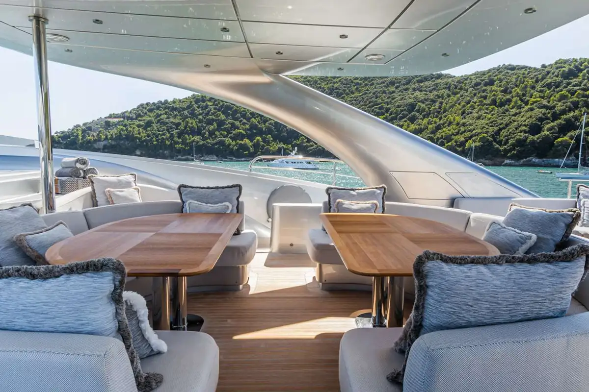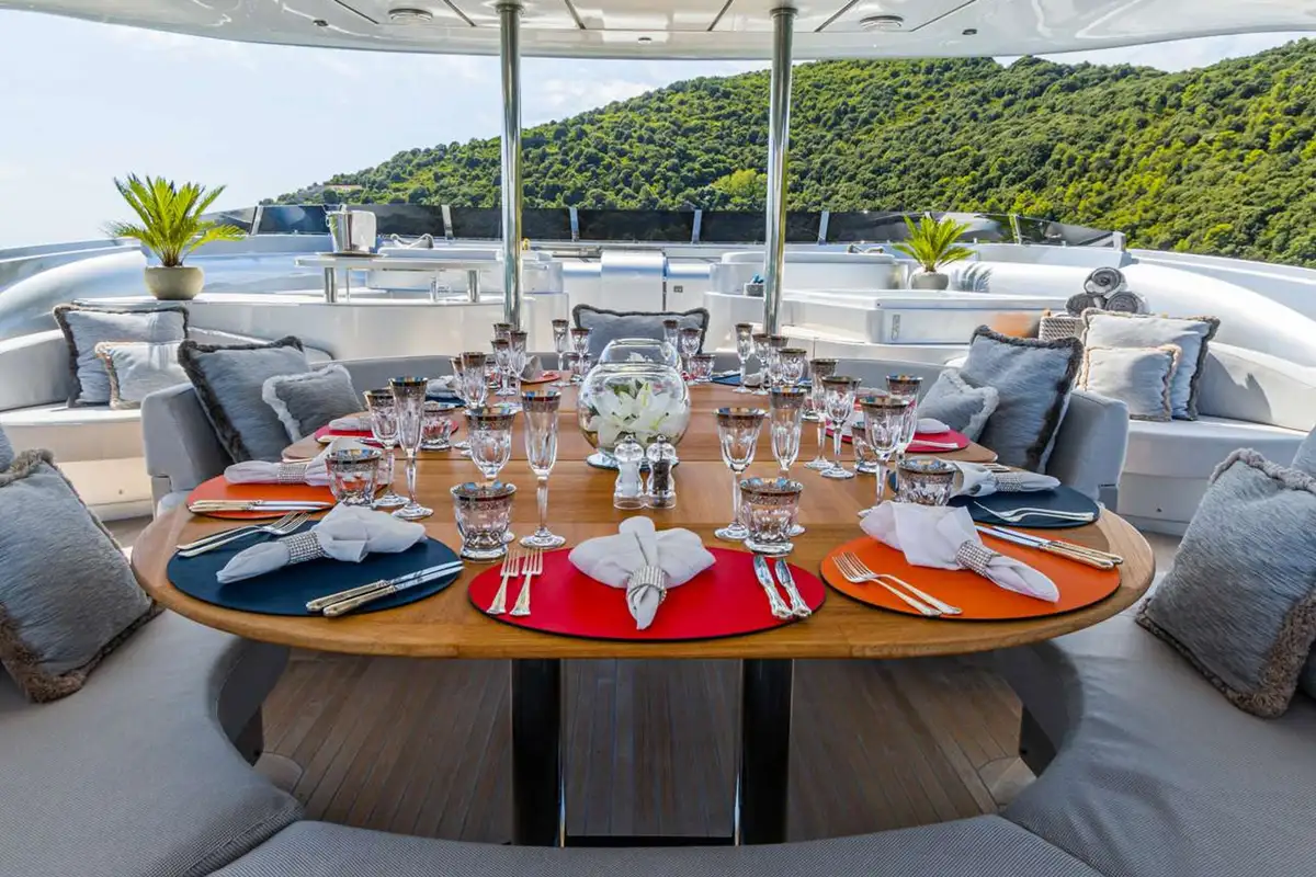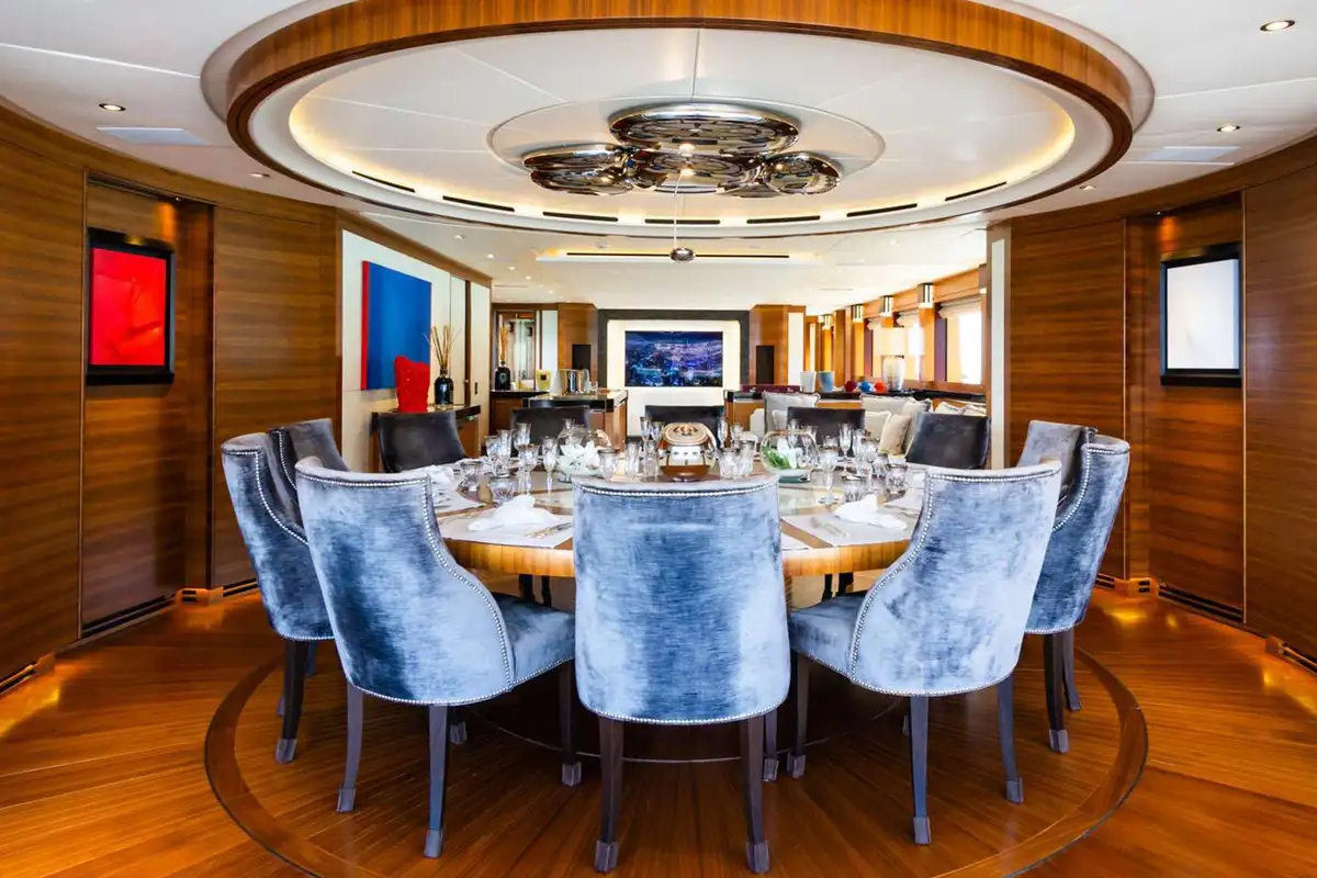 Unusually, the main deck dining area is positioned at the aft deck entrance so you can enjoy the views without compromising on privacy. The circular table accommodates six, eight or 12 thanks to her hidden extensions stored in the surrounding wall.