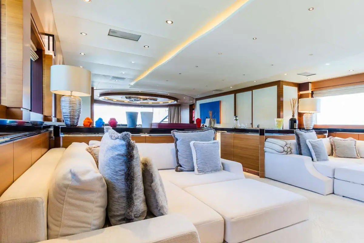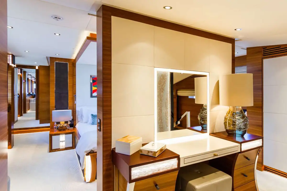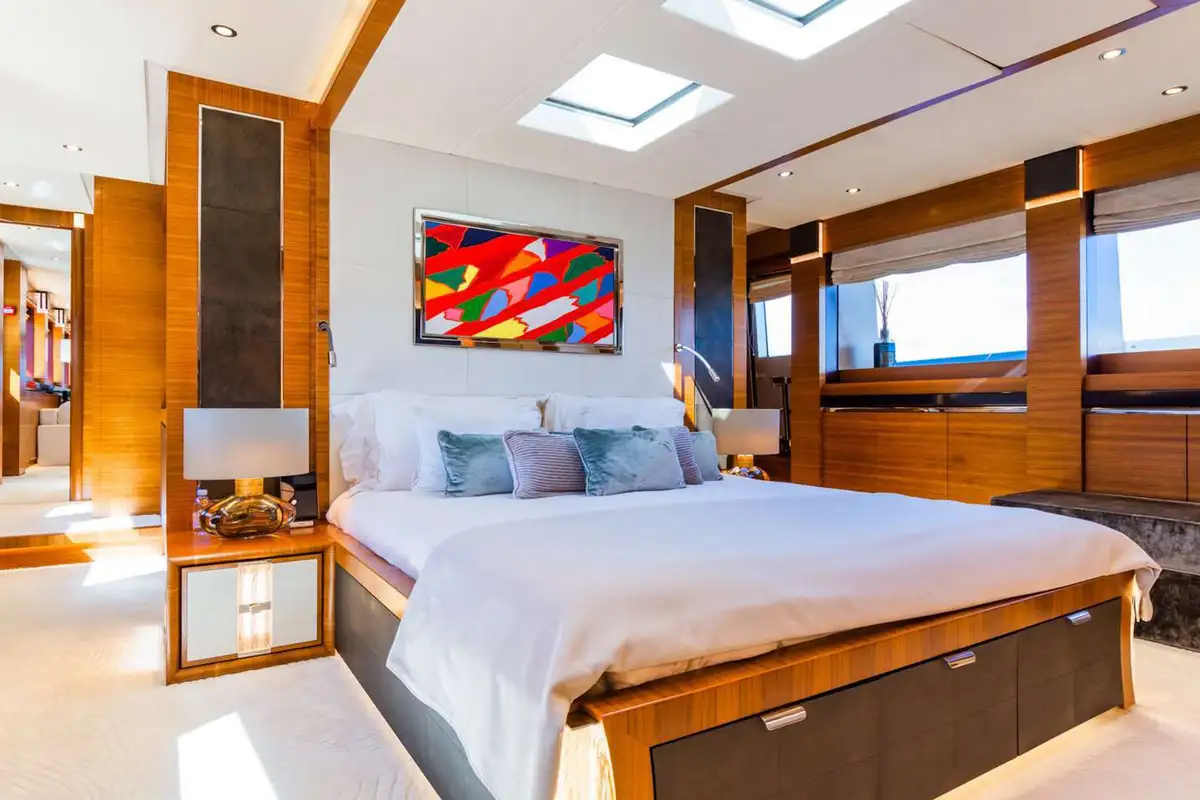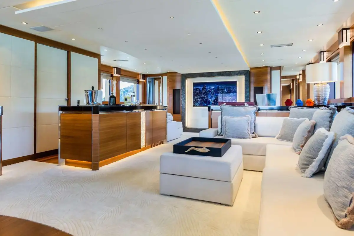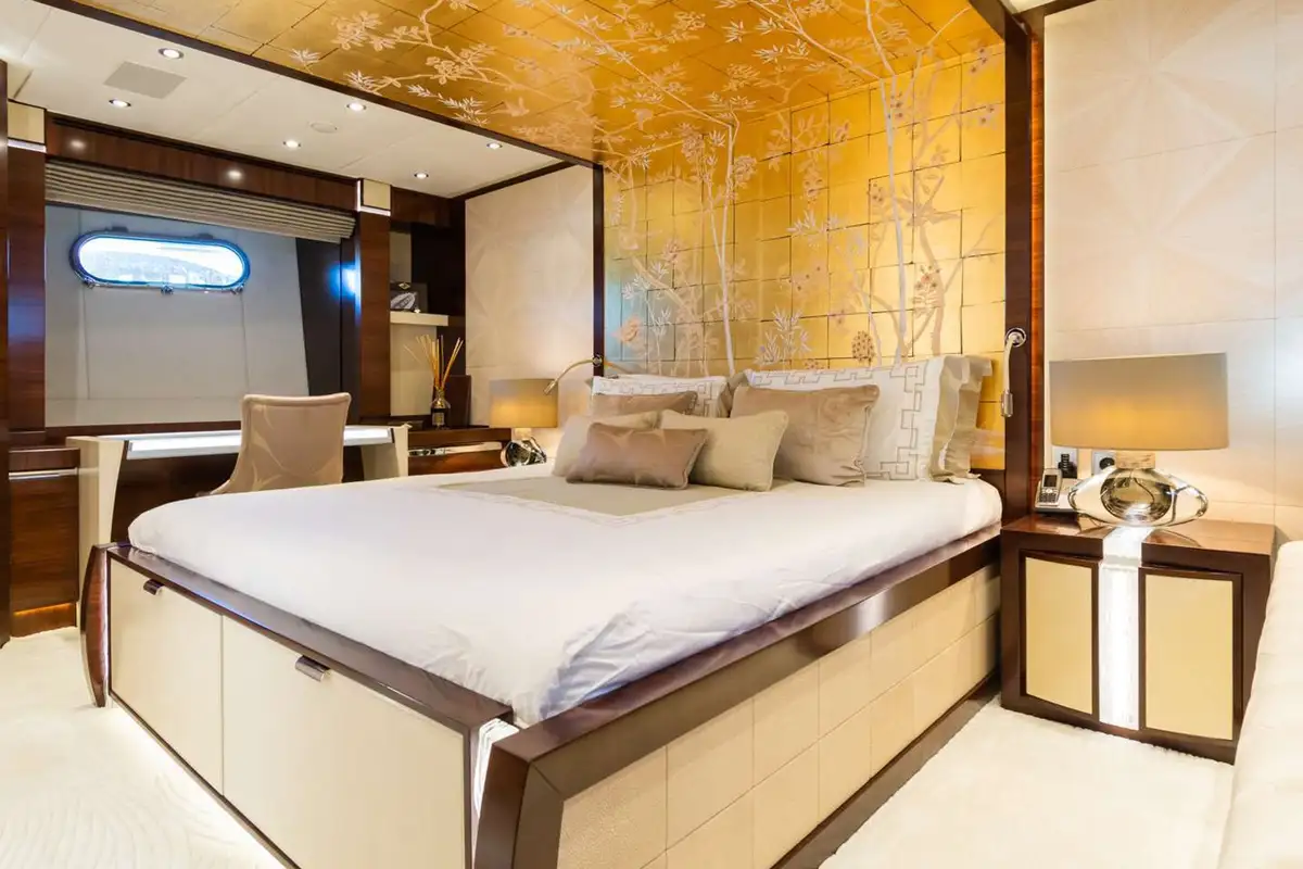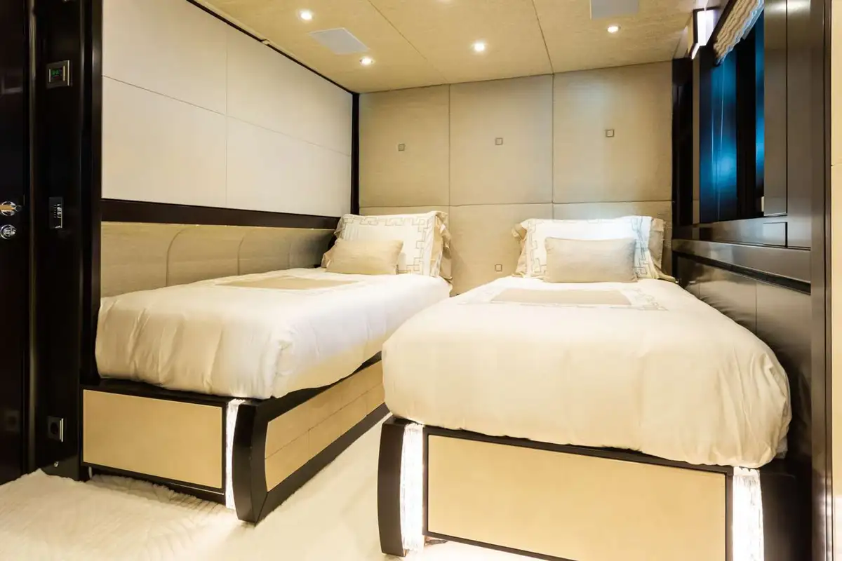 Lavish materials and attention to detail define the interior character. Throughout, soft furnishings of neutral cream and powdery blue tones work beautifully against the walnut and rosewood wood features. During the 2018 refit, a fifth guest cabin was created for added flexibility extending her capacity to sleep 11 guests in five cabins. All are equipped with iPad control systems, Apple TVs and are subtly decorated with colour schemes designed to echo the beautiful mosaic tiling in each en suite.