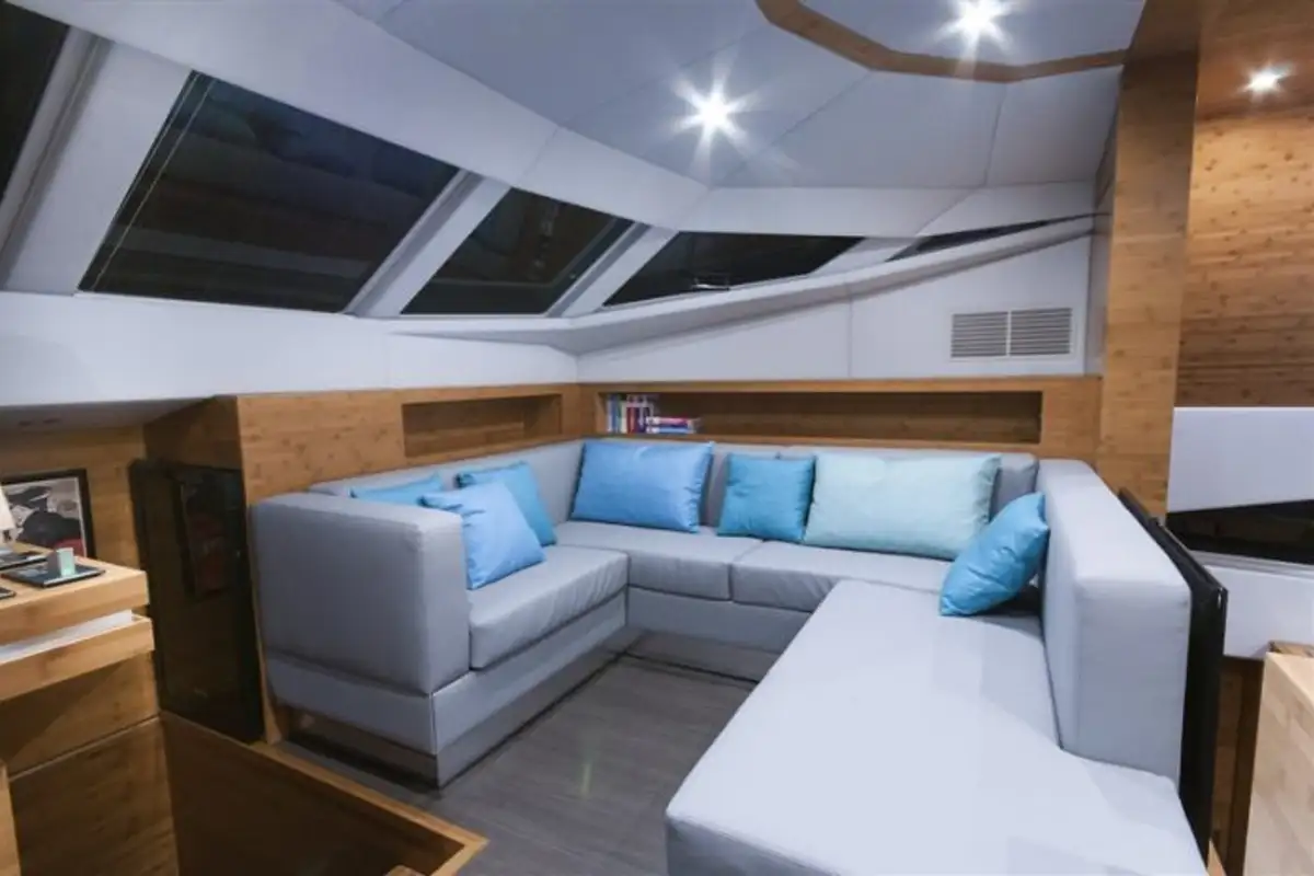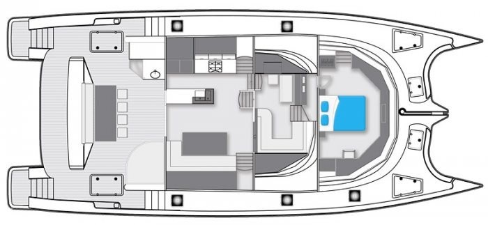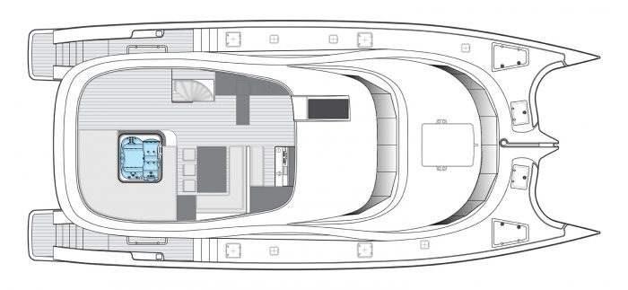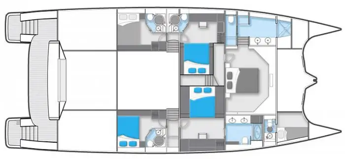 Her accommodation is comprised from two king size and two queen size double cabins, suitable for eight guests. As a sleek, streamlined and highly desirable power cat, she blends high desirability with presence of a much larger superyacht and harmony of a genuine multihull that provides ultimate in space and tranquility.