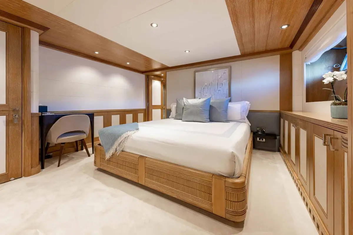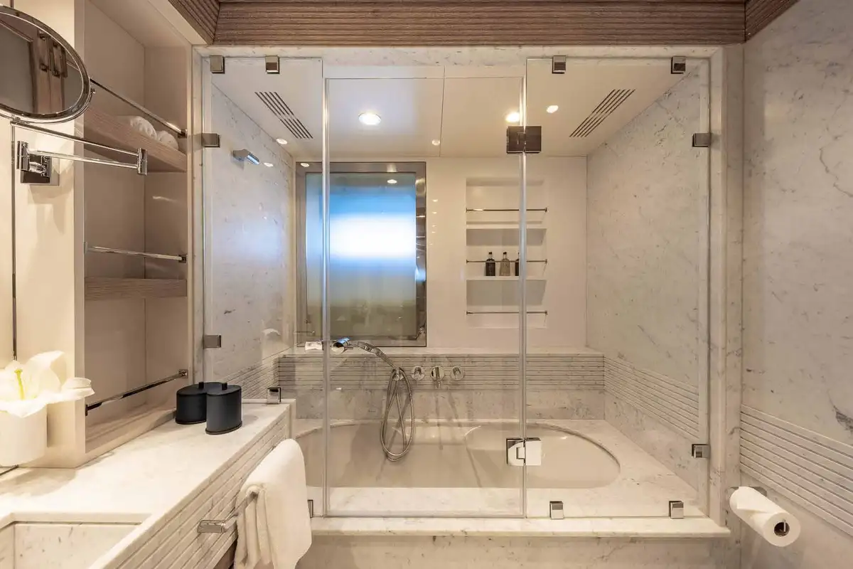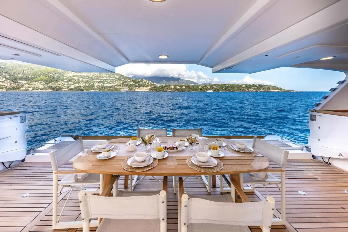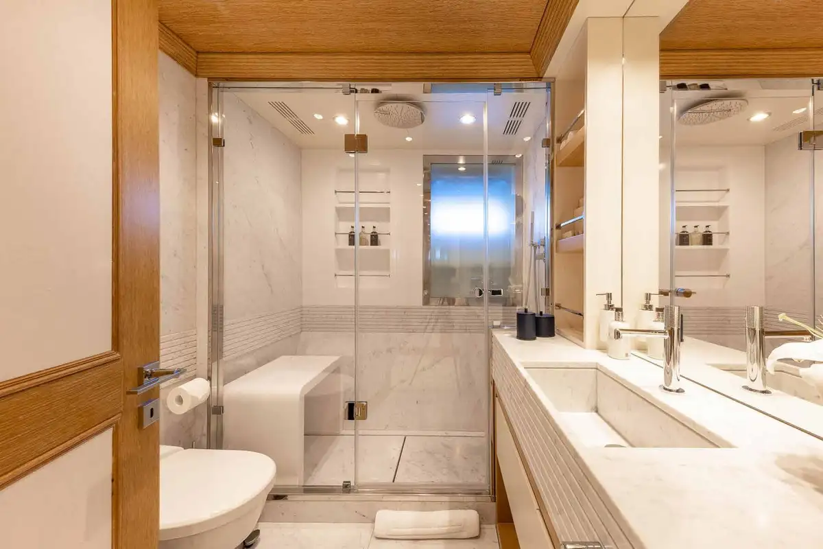 Wake up in the master cabin and freshen up, before checking a few headlines in your private study. Work out using the gym equipment and then join the rest of the party on the upper deck aft for a flavour-packed, healthy breakfast. Fine-tune the day's plans with the captain, then get ready for a morning of fun on the gleaming new watertoys, all set-up and ready to go at the swim platform.