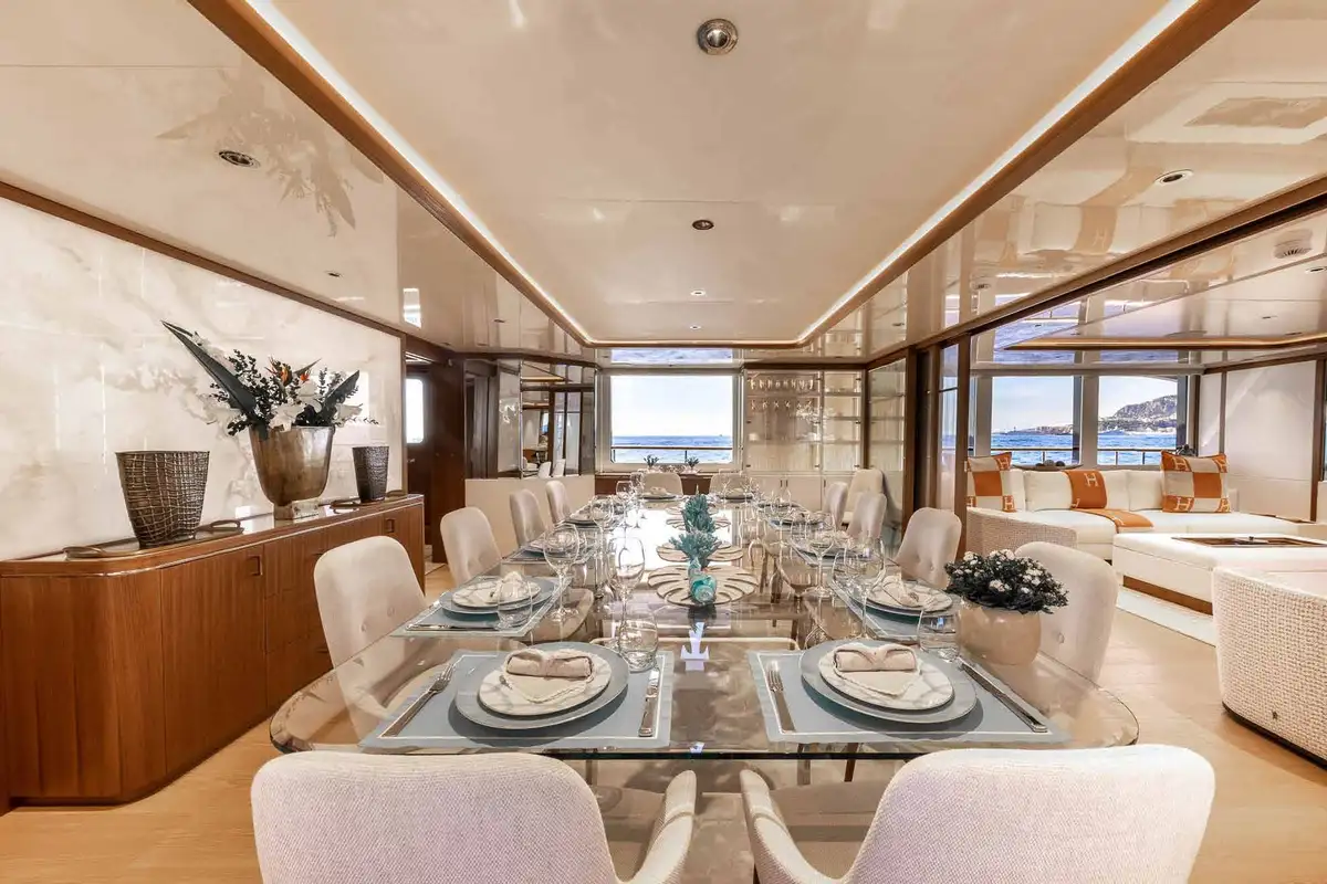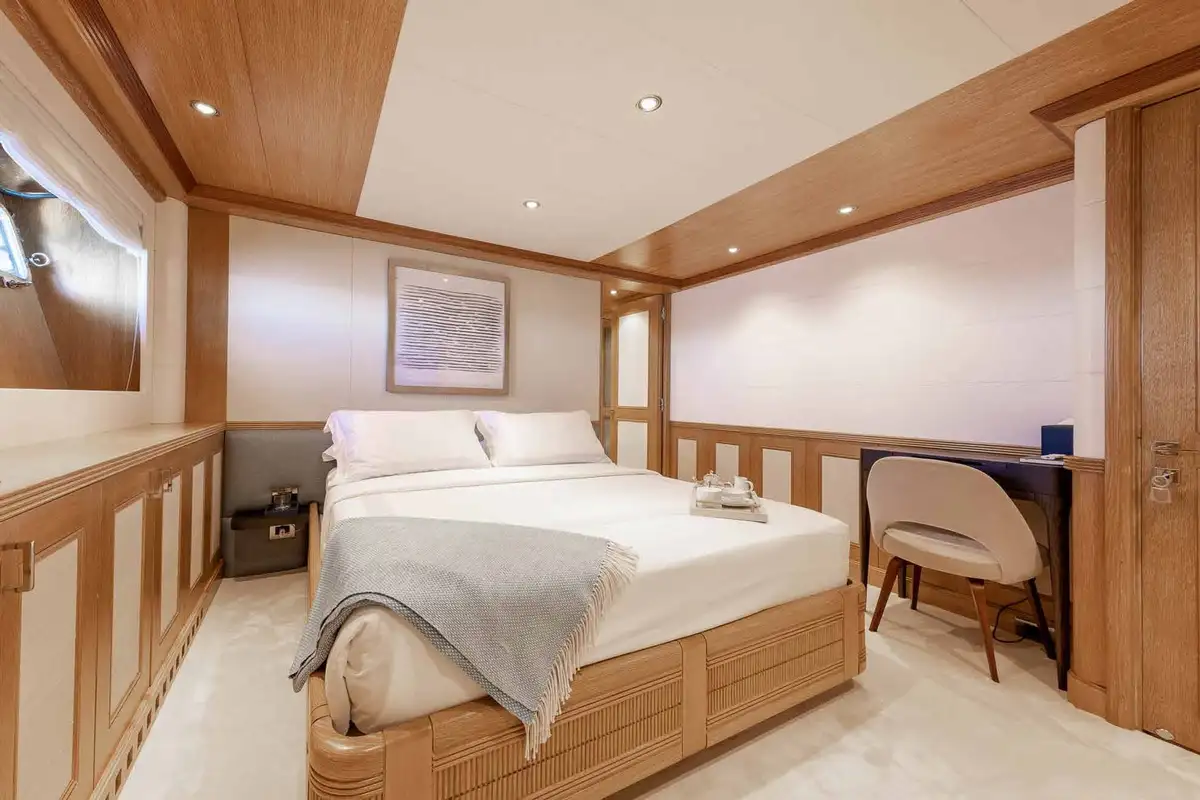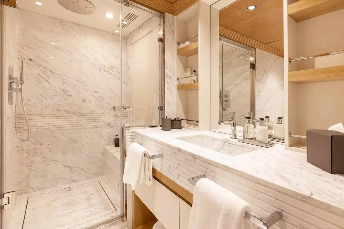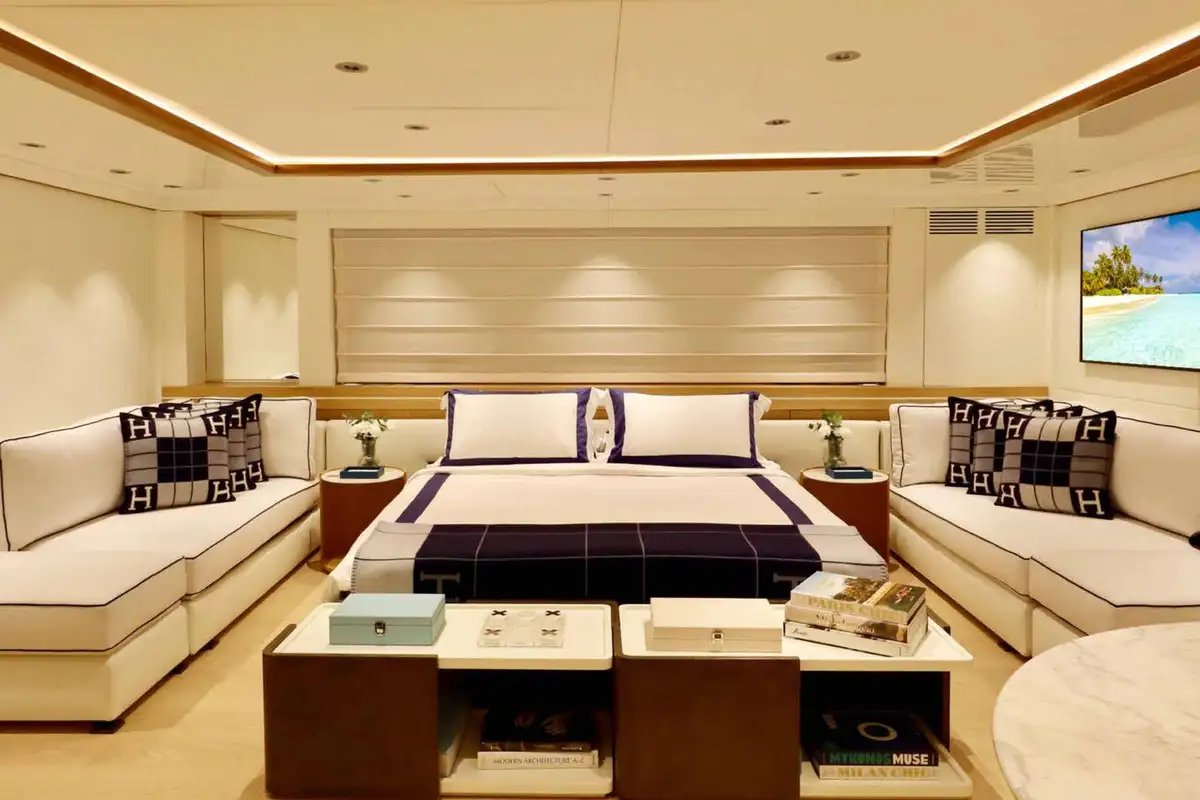 Wake up in the master cabin and freshen up, before checking a few headlines in your private study. Work out using the gym equipment and then join the rest of the party on the upper deck aft for a flavour-packed, healthy breakfast. Fine-tune the day's plans with the captain, then get ready for a morning of fun on the gleaming new watertoys, all set-up and ready to go at the swim platform.