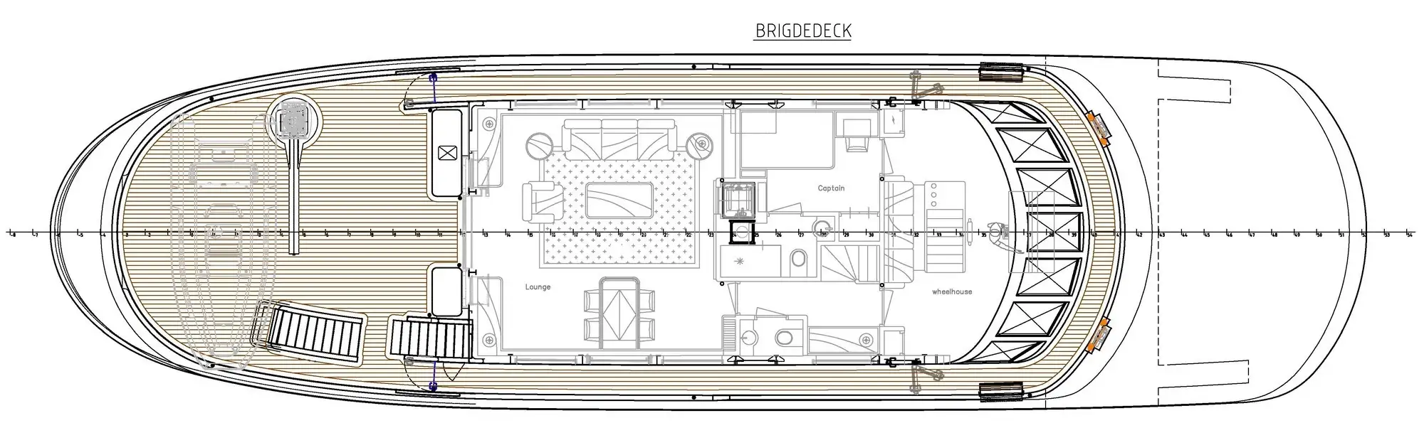 The sundeck has a raised jacuzzi pool up front, flanked by generous sunpads, and a snug, comfortable seating area aft, with ample shade when required from a canvas bimini above. Solid mahogany capping rails all round lend an authentic touch of traditional yachting style.