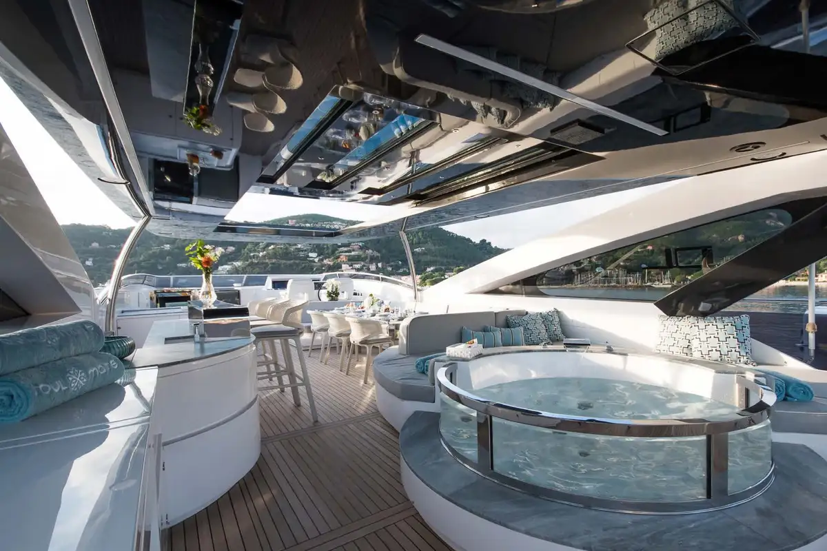 Head up to the sun deck where there are ample areas to relax and dine including a glass-walled jacuzzi, sofa seating, and a sit-up bar.