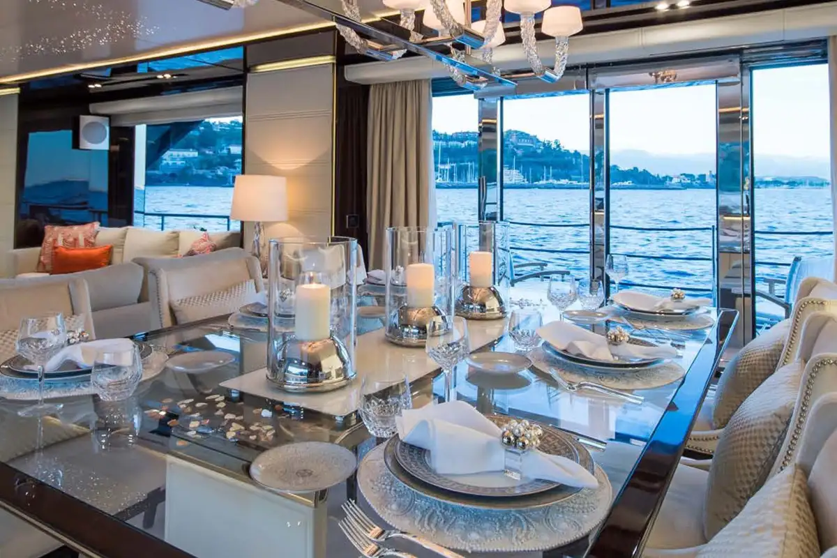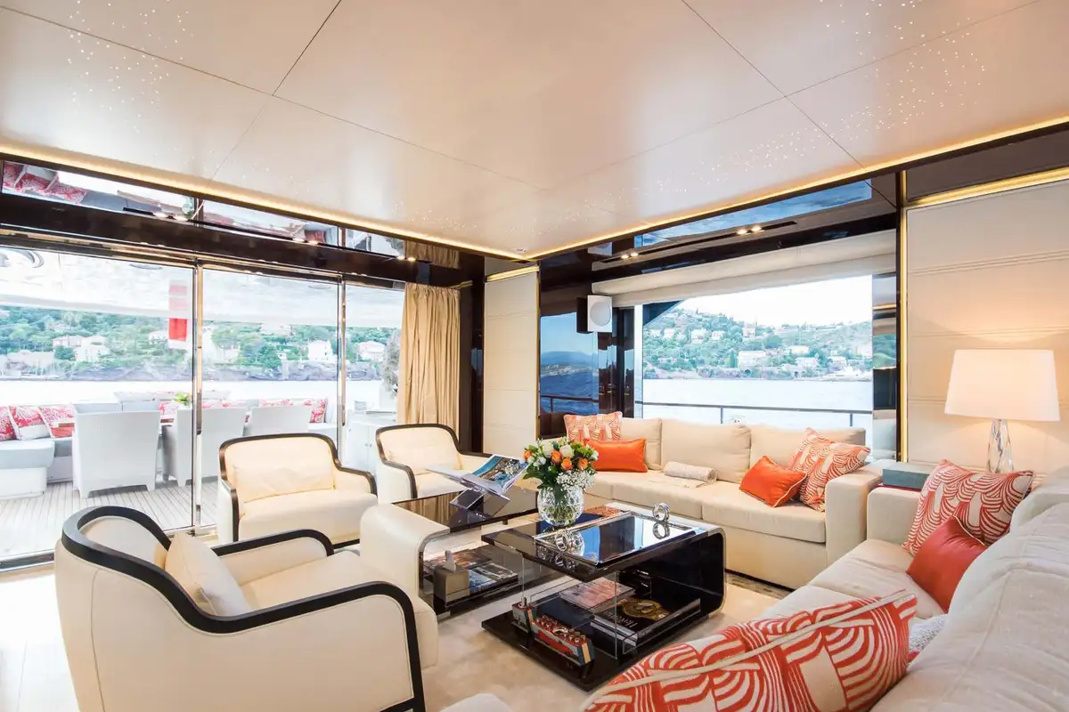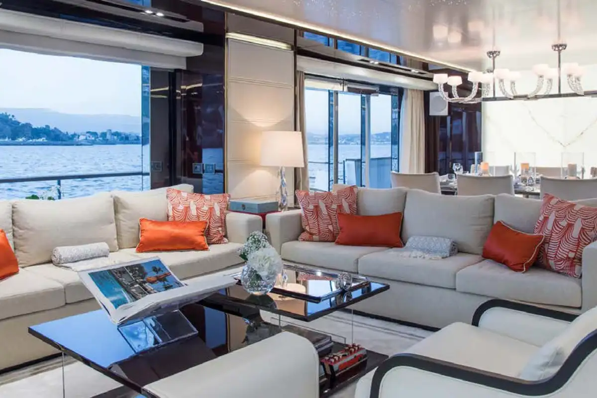 Inside, a sophisticated palette of warm neutrals, dark accents, and vibrant pops of orange creates a welcoming yet modern ambiance. The main deck lounge invites social connection with panoramic views, a fold-down balcony, and an open-plan lounge leading to a formal dining space – perfect for enjoying expertly prepared multi-course meals.