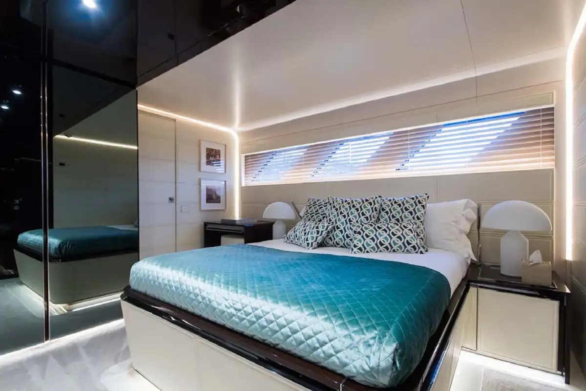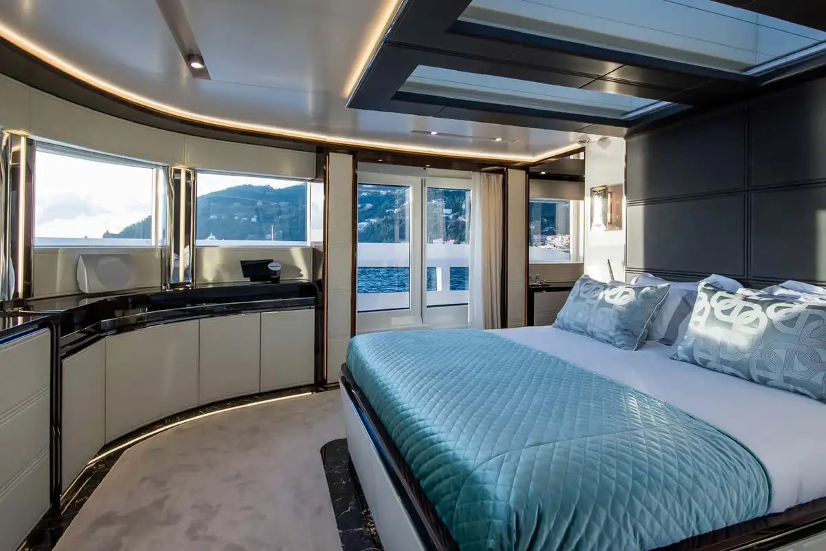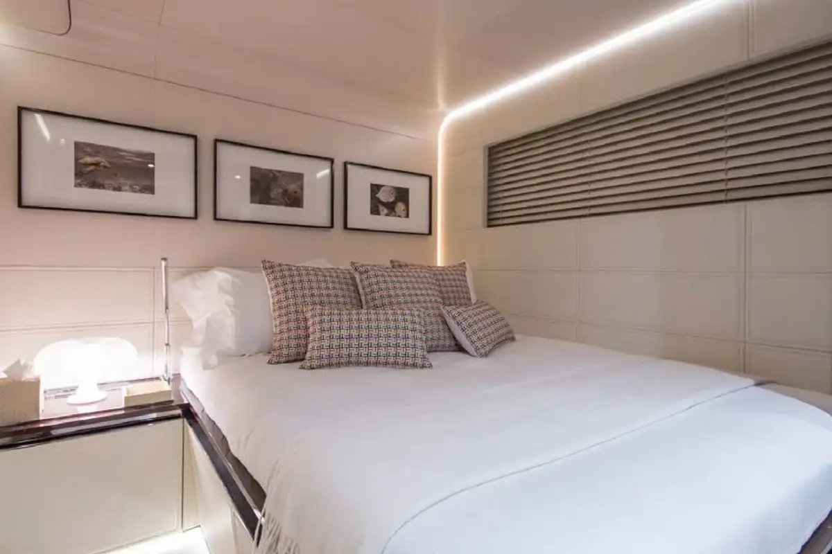 SOULMATE offers accommodation for up to 10 guests across five beautifully designed cabins. The full-beam master cabin, located on the main deck, includes an en suite bathroom, a walk-in wardrobe, and a private owner's area on the bow offering a space for serene respite. On the lower deck, three elegant double cabins and one twin, all en suite, blend contemporary style with comfort.