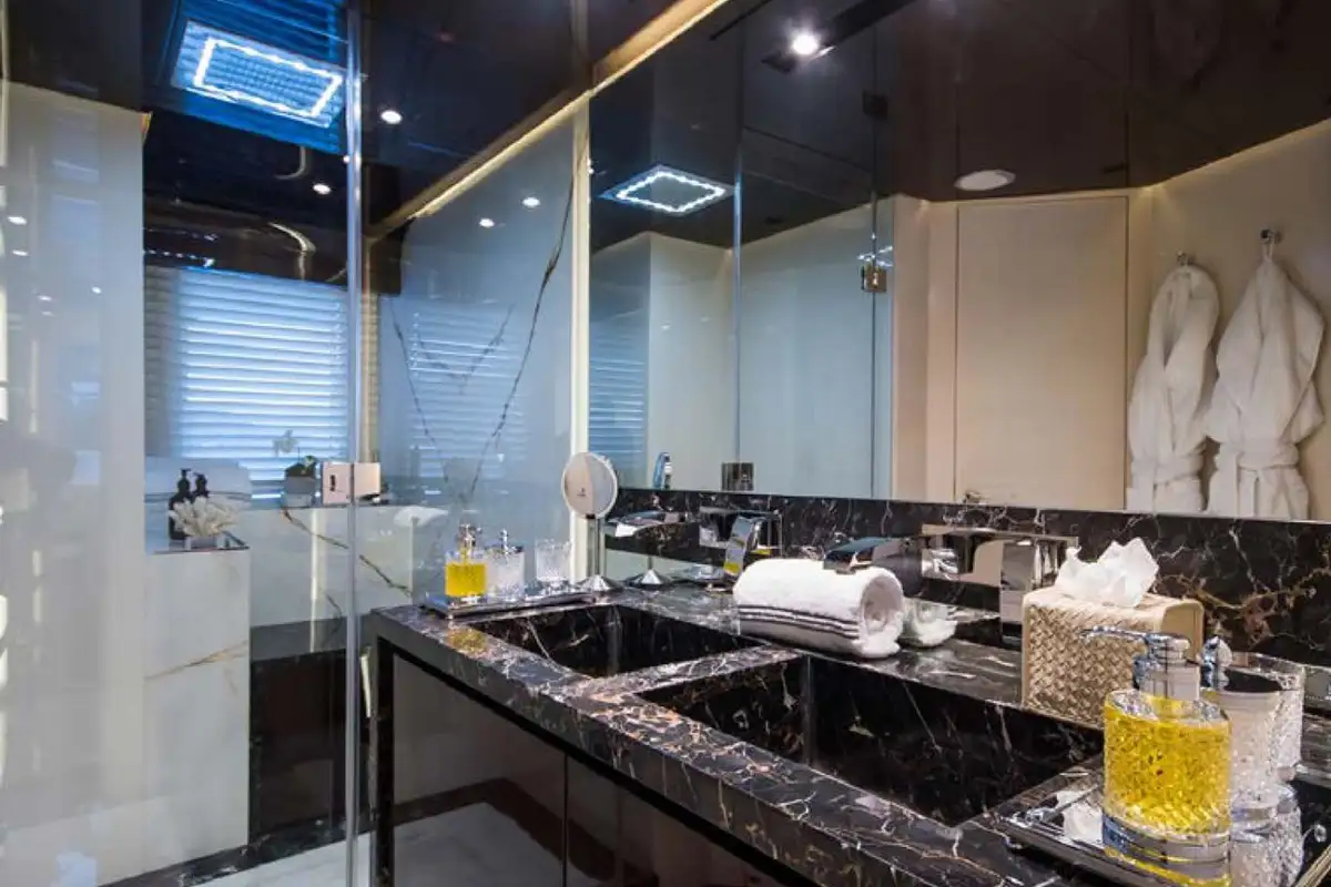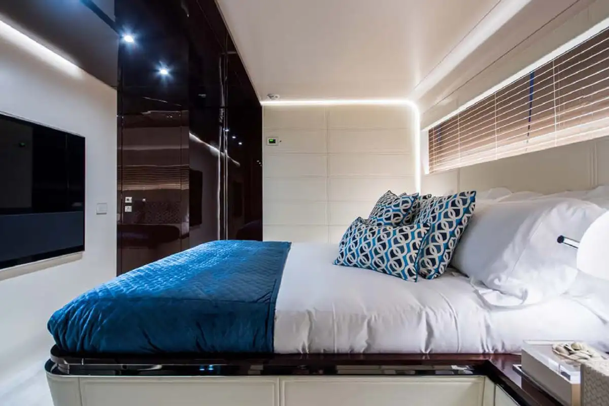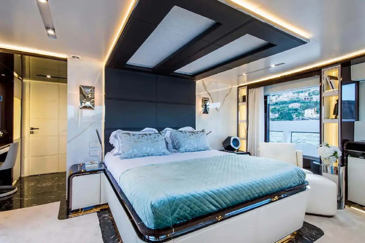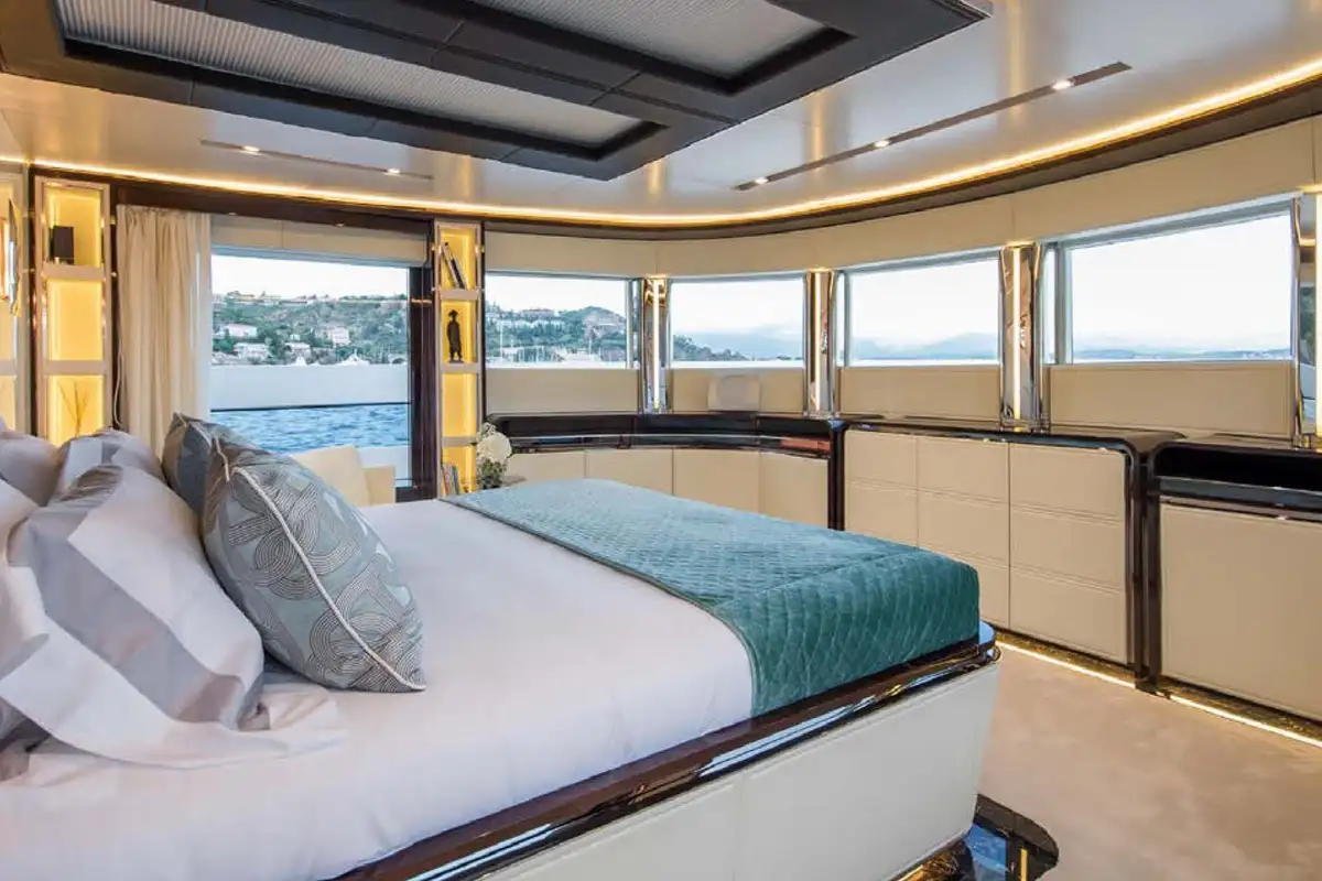 SOULMATE offers accommodation for up to 10 guests across five beautifully designed cabins. The full-beam master cabin, located on the main deck, includes an en suite bathroom, a walk-in wardrobe, and a private owner's area on the bow offering a space for serene respite. On the lower deck, three elegant double cabins and one twin, all en suite, blend contemporary style with comfort.