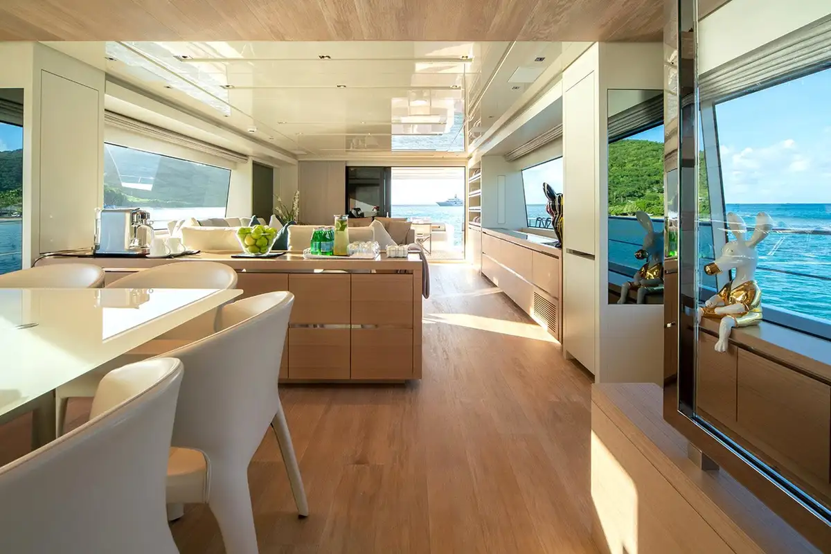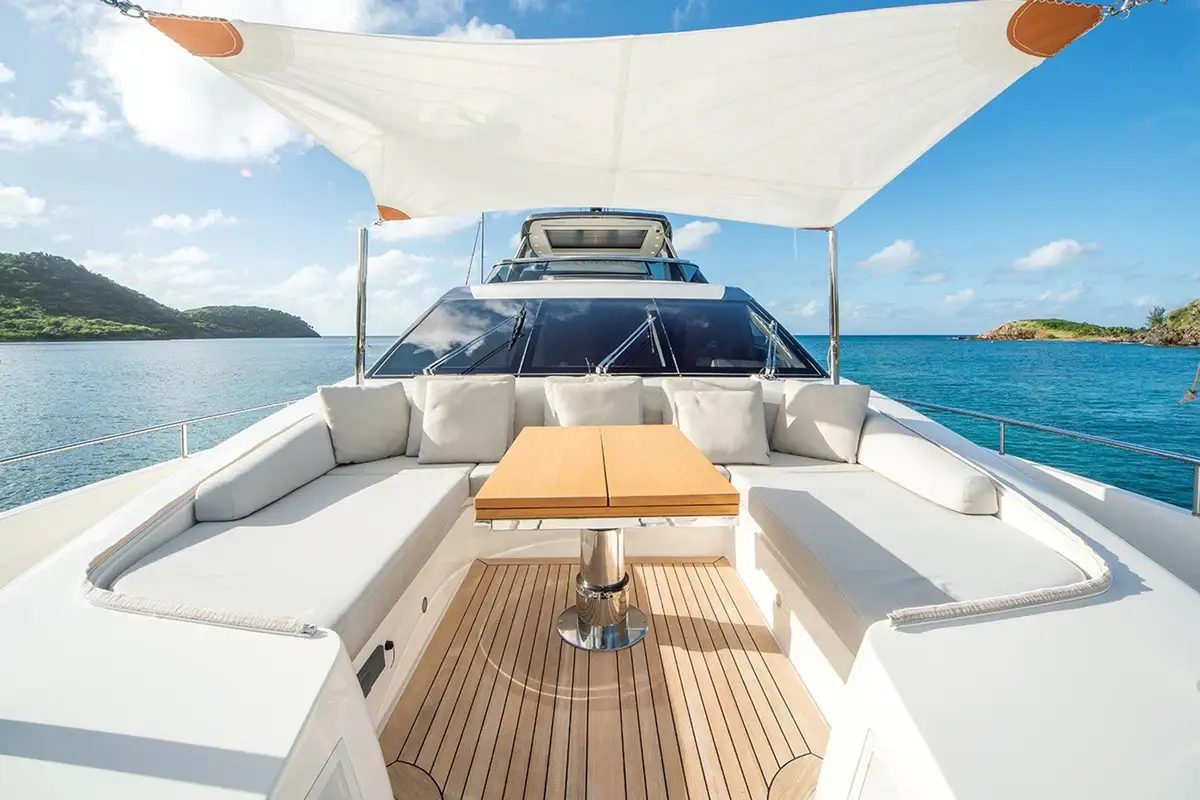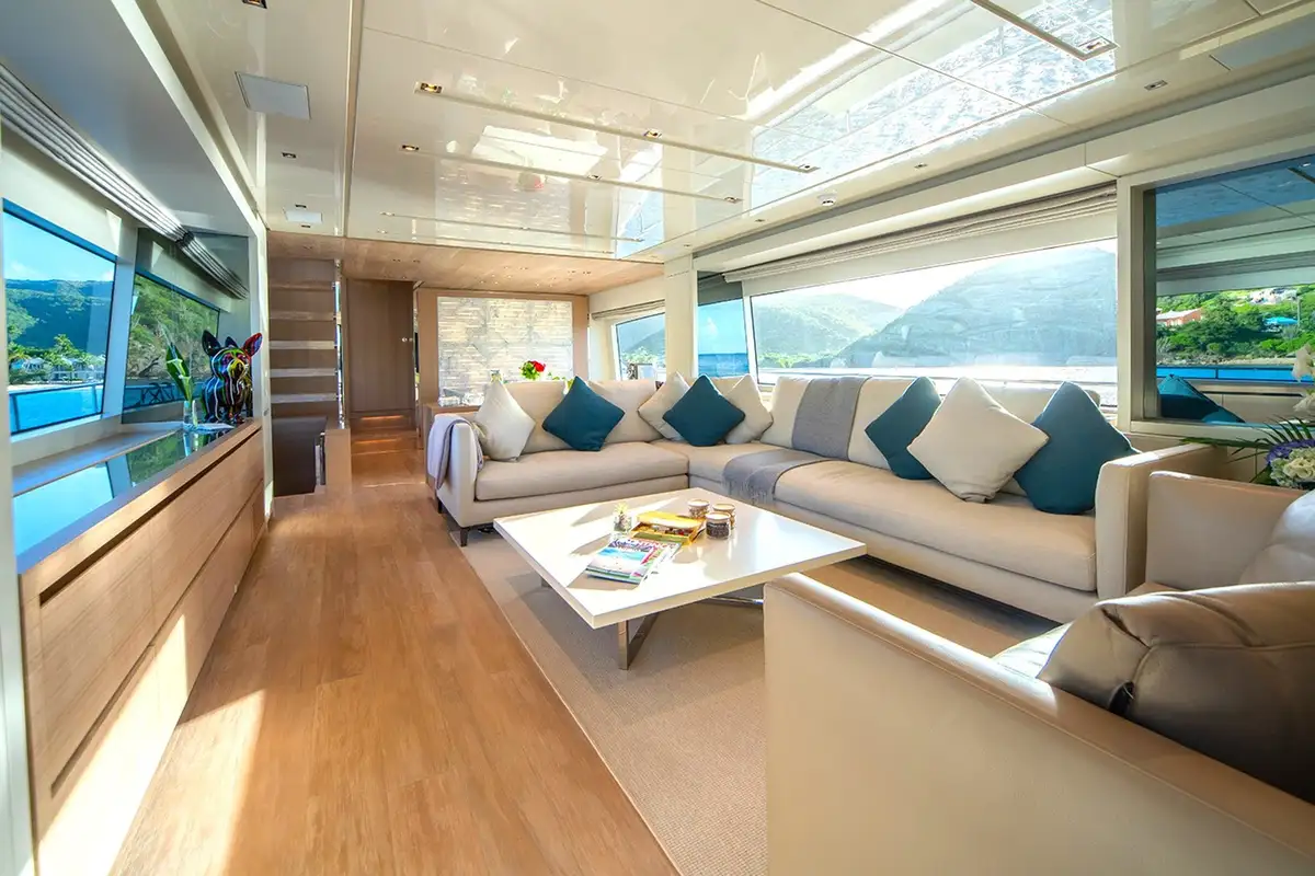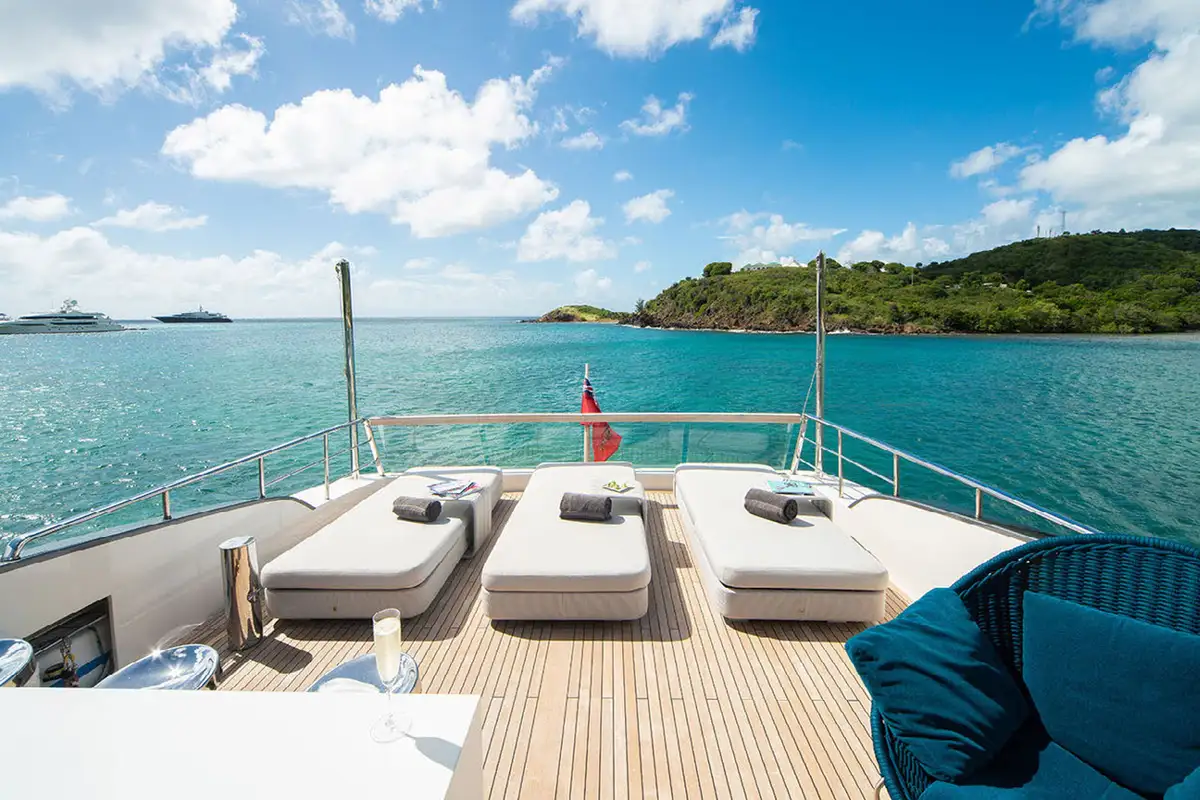 Huge sunpads on the forward deck convert into a seating and coffee table area for afternoon tea or evening beverages.
