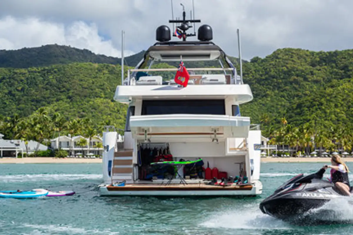The main aft deck is home to sofa seating, loose furniture and a convertible table for cocktail or dining. Twin staircases lead down to the easy-access swim platform. SQUALO’s guests can take full advantage of her extensive collection of water toys and equipment, which includes the towed 23ft Boston Whaler Vantage tender for enjoying water sports or adventures to the shore. A three-seater WaveRunner is perfect for speeding through the water together, and a JetSurf motorized surfboard is sure to thrill. There are plenty of water toys to choose from including snorkeling gear, inflatables, fishing equipment, wakeboards and paddle boards. Cruising speed at 20 knots, or an economical speed of 11 knots, zero speed stabilizers ensure maximum comfort.