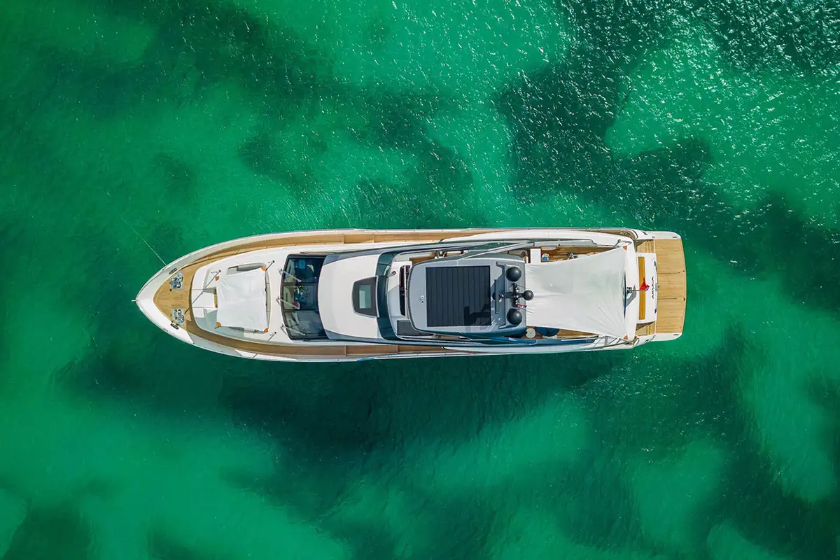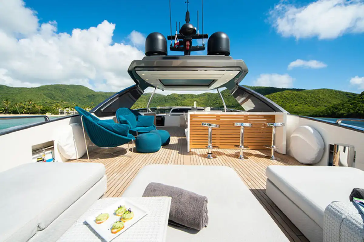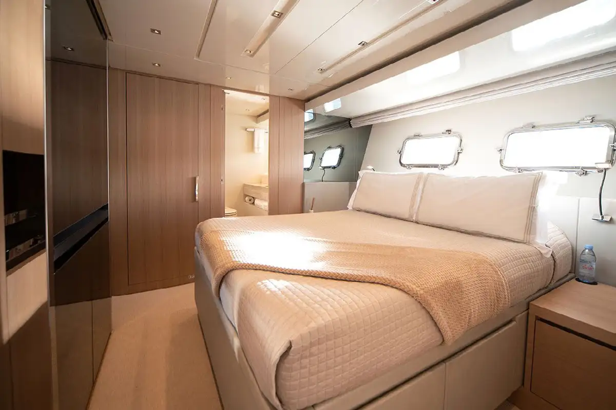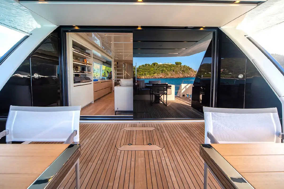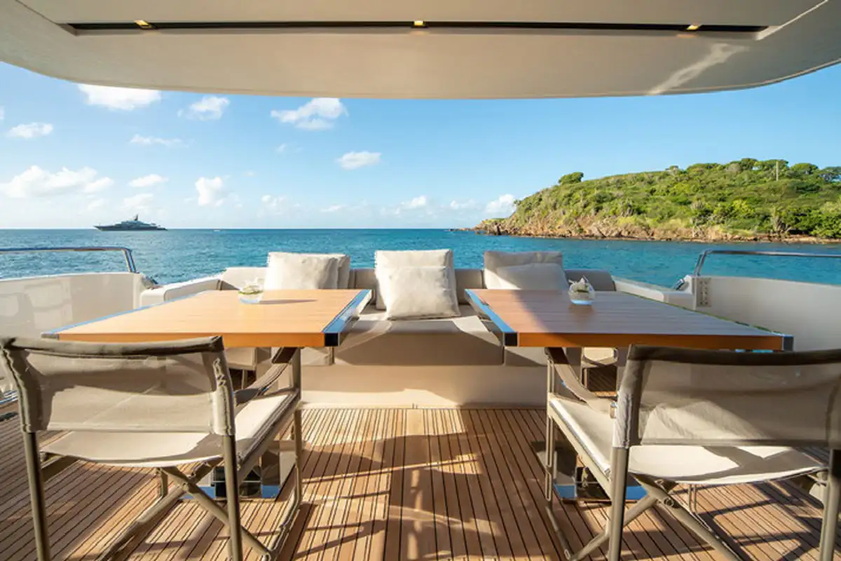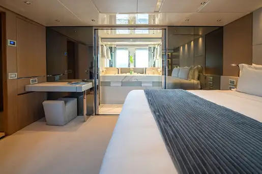 A floating staircase leads up from the main salon to the open concept flybridge, which is a multi-purpose space with many different features. Sun loungers and lounge seating are complemented by a sheltered al fresco dining space for the best seats in the house. The hardtop opens above the dining space if required allowing natural sun light. Guests experience 360 degree views, privacy, dining for 8, 2 large comfortable Paolo Lenti chairs to curl up in, a large wet bar with grill and 3 stools, refrigerator, ice maker and sink, 3 large sunbeds, outdoor TV, and a shower to cool off with. Awnings are available to cover the remainder of the deck when the sun is too hot.