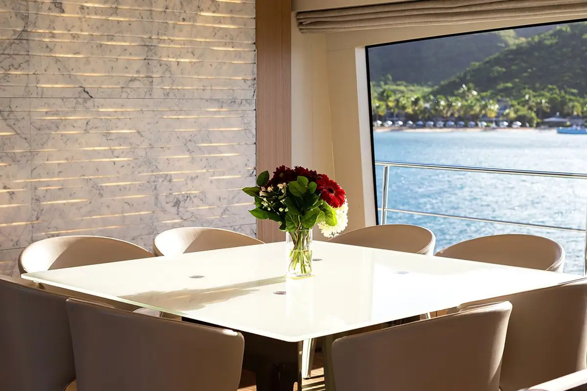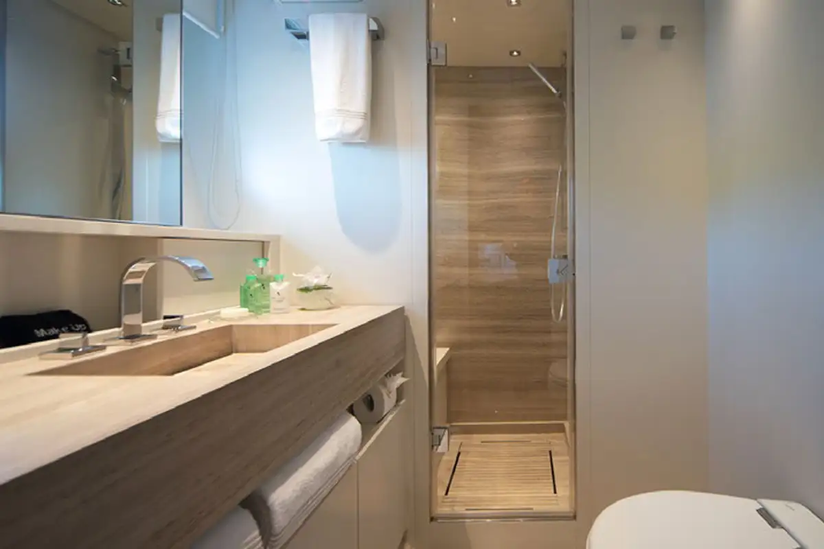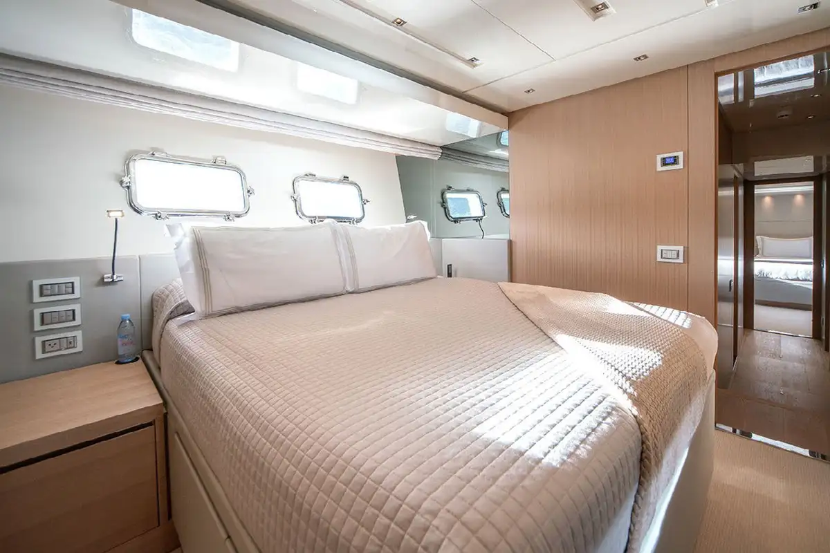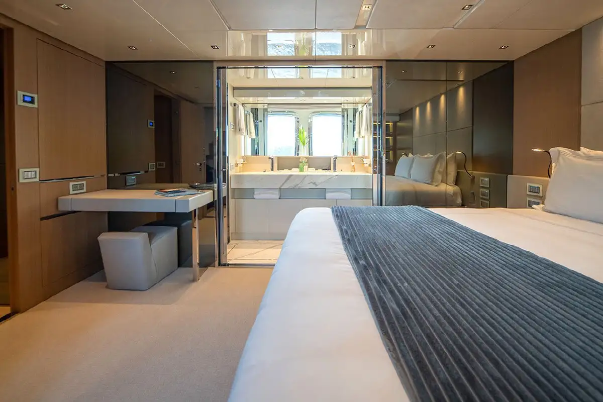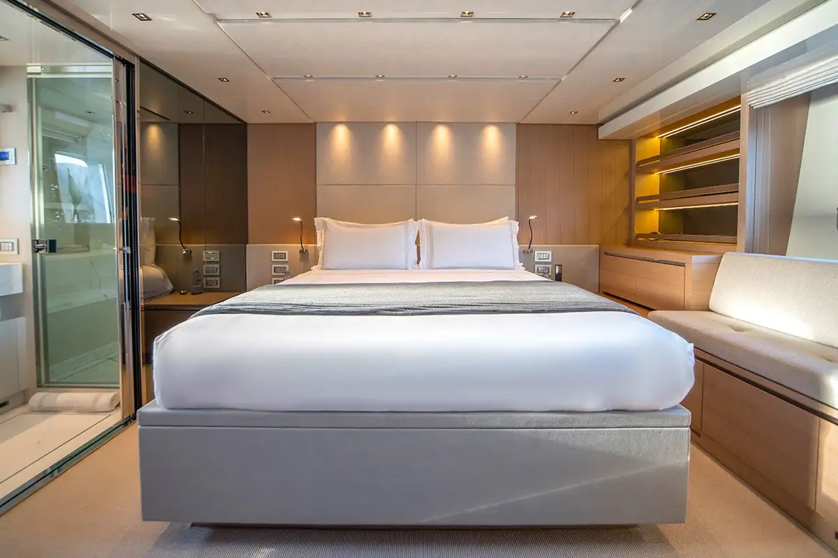 The main salon is sleek and elegant, which has a large lounge seating area, with bar and hidden television. A dining table is located forward of the salon, with seating for all guests to enjoy a special meal. The interior has a very bright and airy feel. The eucalyptus woods throughout are beautiful. The Carrara marble used throughout the boat was sourced directly from the Carrara mountains right near the shipyard in Italy. No details has been overlooked. Leave your charter menu in the capable hands of SQUALO’s creative chef, who will make use of the freshest ingredients to craft meals to remember.