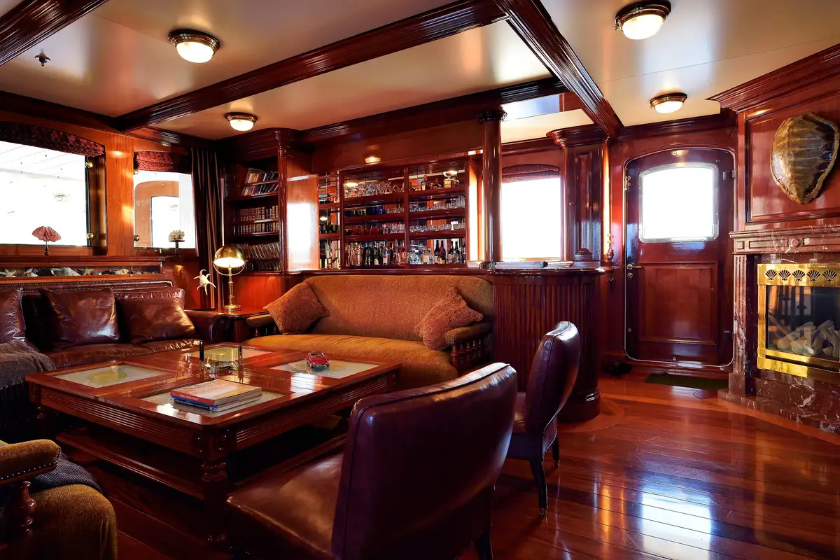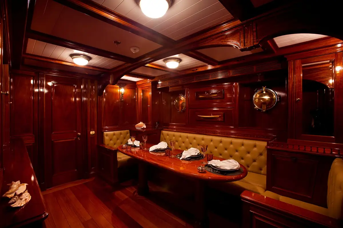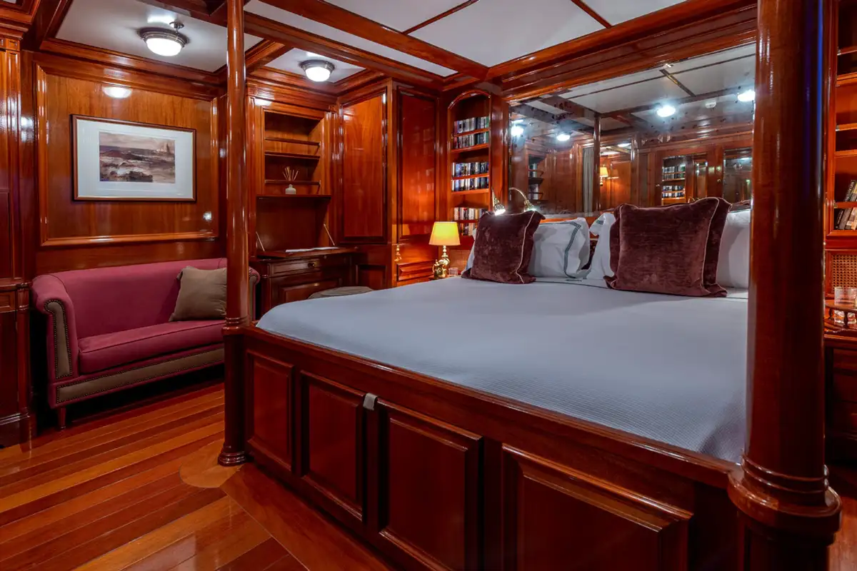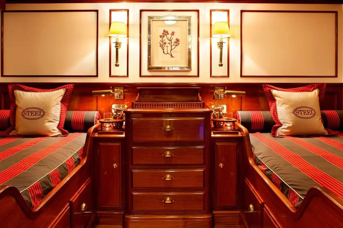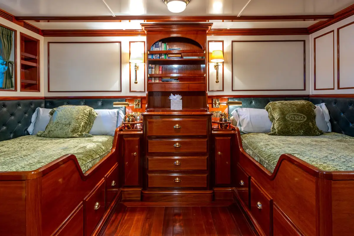 Back on board, head to the foredeck where an informal seating area provides a welcome retreat and a perfect place to enjoy sunset cocktails. Stepping inside to STEEL’s accommodation to freshen up you will find her harmonious and supremely classic interior warm and welcoming. With plentiful reception areas decorated with intricate wood panelling and lavish antique furnishings, they have the feel of a gentlemen’s club. Her accommodation, meanwhile, will ensconce you in luxury. Seven beautifully designed cabins consist of a master suite, a VIP suite and four twin cabins with Pullman berths. She also accommodates 12 crew, ensuring the ultimate charter experience and spectacular service at all times.